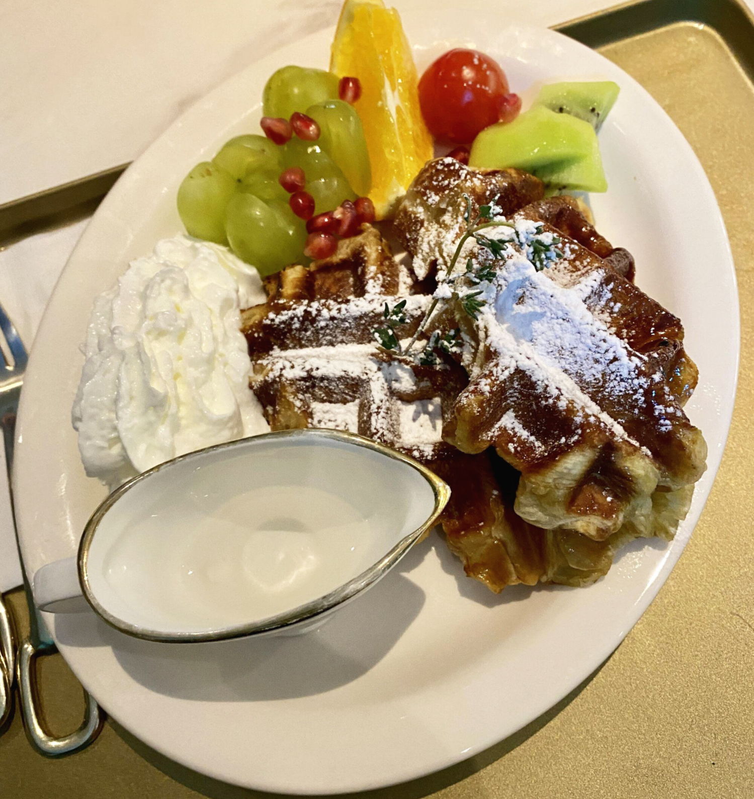 우리가 시킨건 생과일 크로플. 아이스크림 크로플이랑 잠시 고민했지만, 아이스크림 올린 건 빨리 먹어야 하니까 좀 느긋하게 먹으려고 이걸로 주문했다.