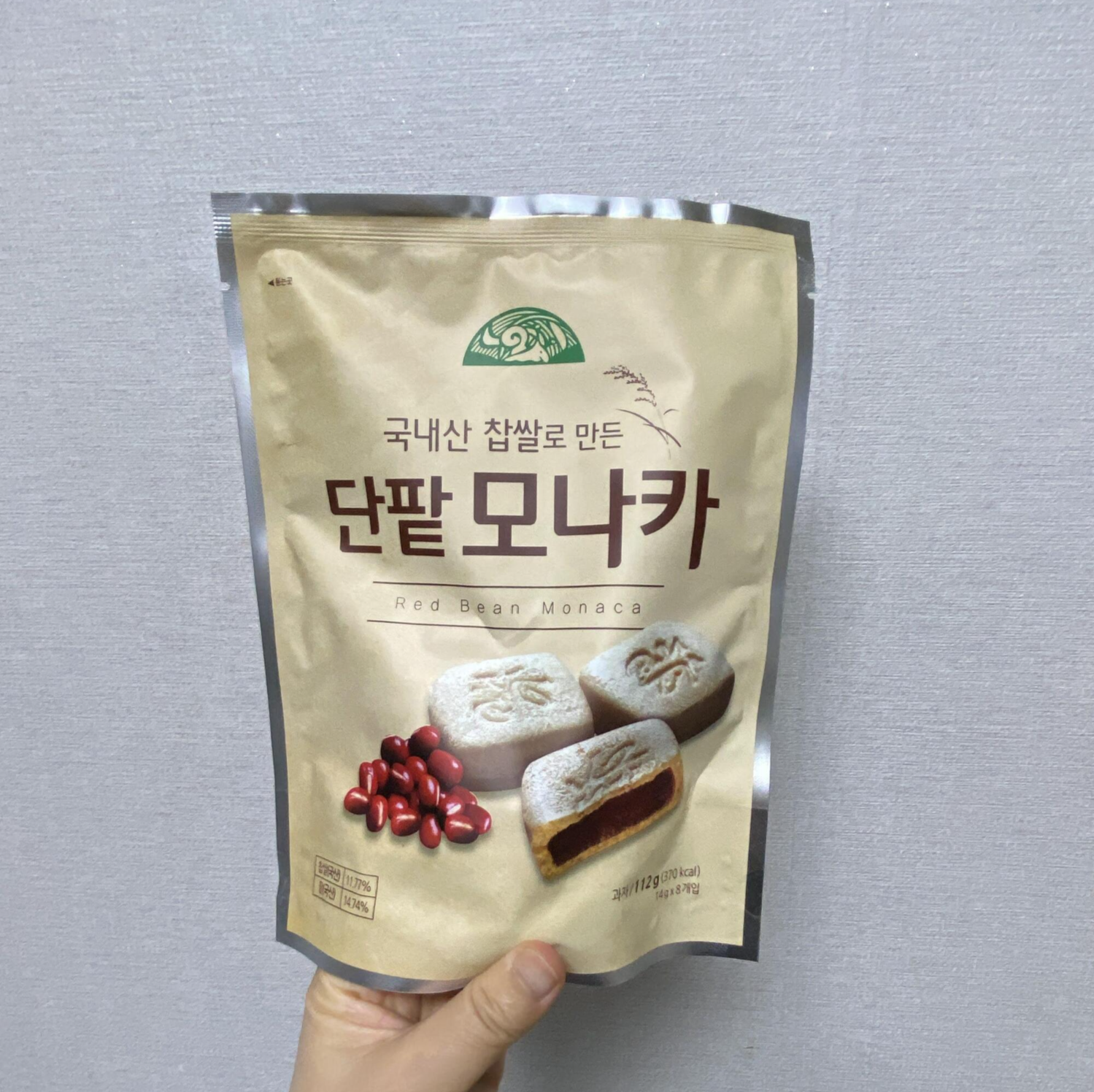 밤맛도 있었는데 단팥이 일단 기본이니까 단팥으로 샀다. 봉지는 베이지색이고, 빨갛고 통통한 팥이랑 앙금으로 가득 찬 모나카가 예쁘게 찍혀 있다.