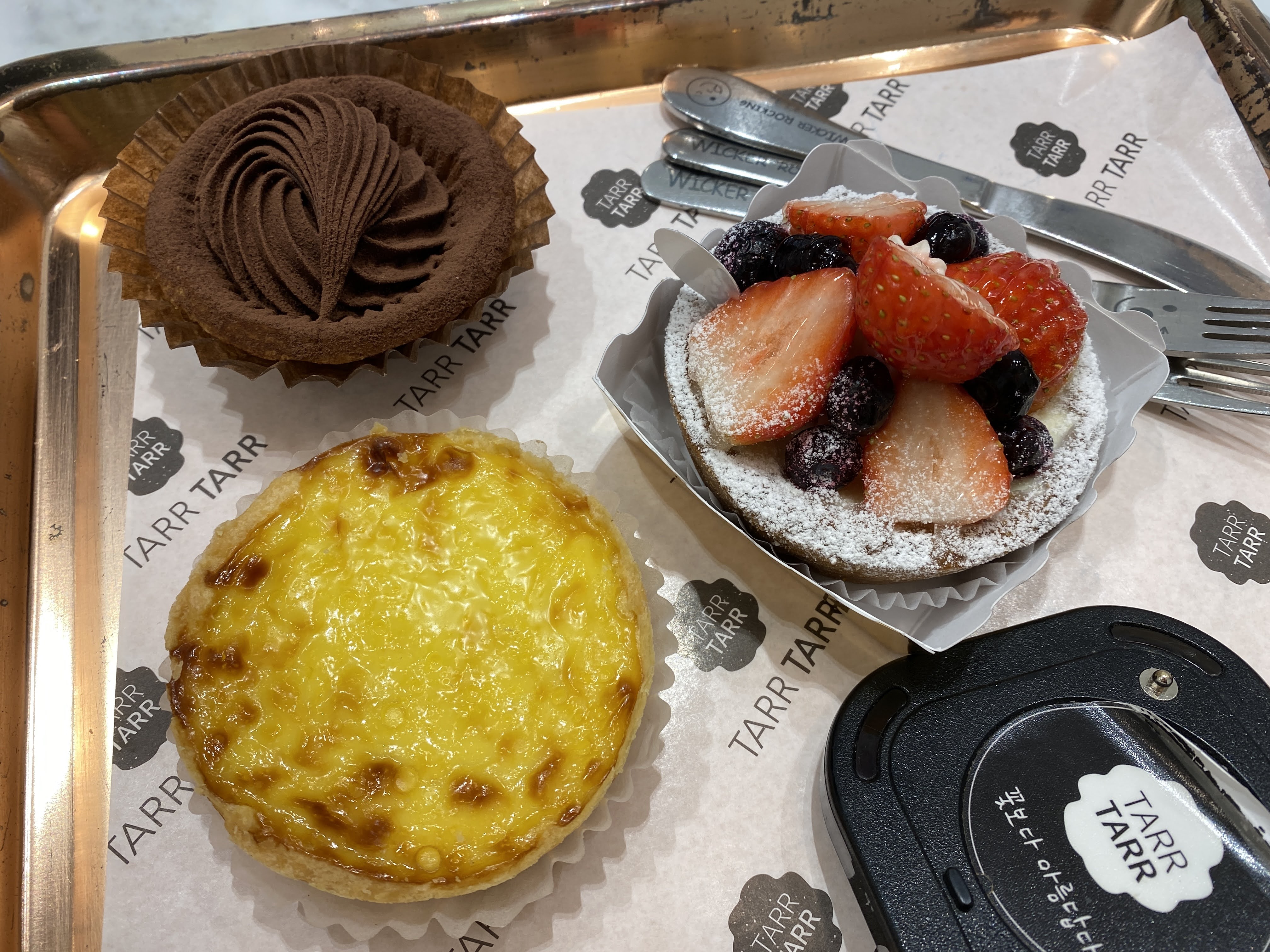 정말 한참을 고민하다가 어렵게 세 가지 타르트를 샀다. 에그타르트, 초코 타르트, 베리베리 타르트.
