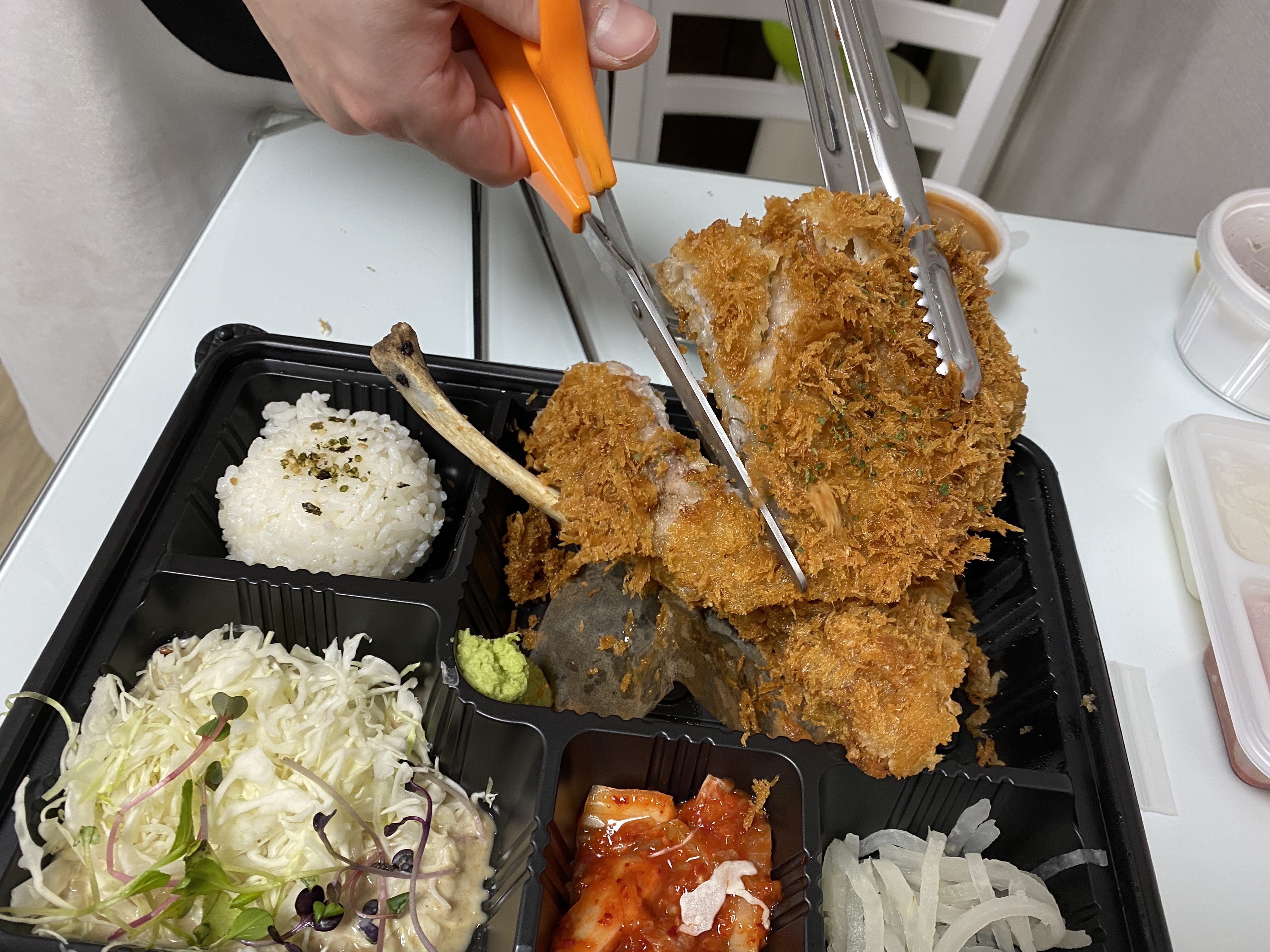 포장도 깔끔하게 왔다! 토마호크 돈까스의 팁에 자르지 말고 받으면 더 바삭하게 즐길 수 있다고 해서 안 자른 채로 받았다. 포장을 뚫고 나올 듯한 큼지막한 고기 토막이 아주 인상적이다. 저걸 어떻게 튀겼을까 그저 미스터리.