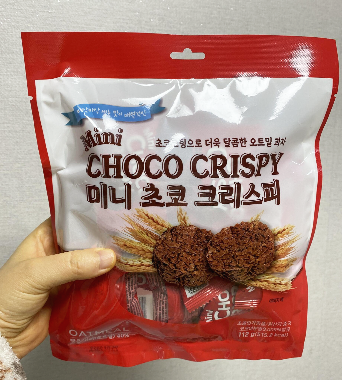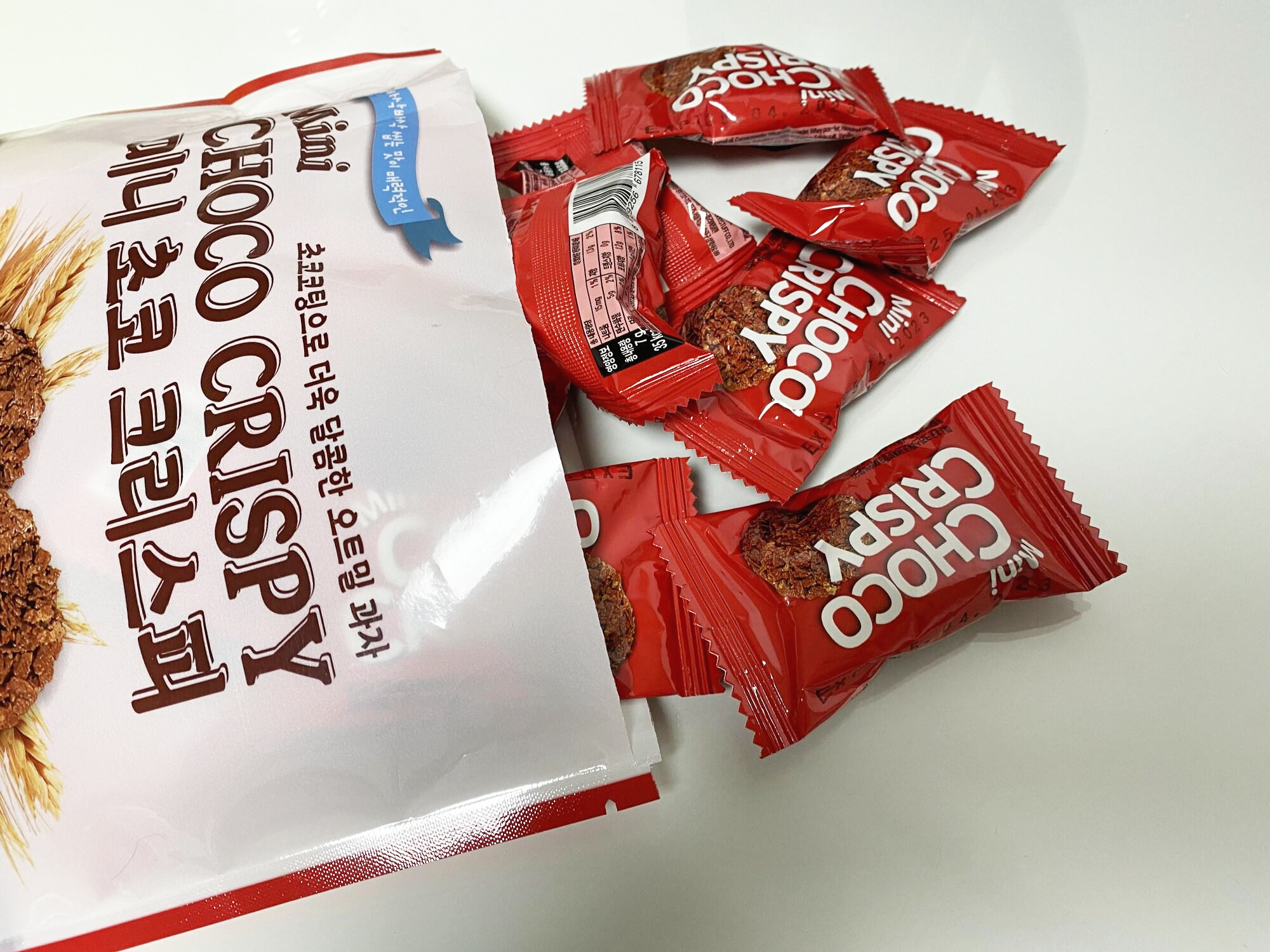 오늘 먹은 과자는 미니 초코 크리스피. 겉봉에 쓰인 설명대로 초코코팅으로 더욱 달콤한 오트밀 과자다.