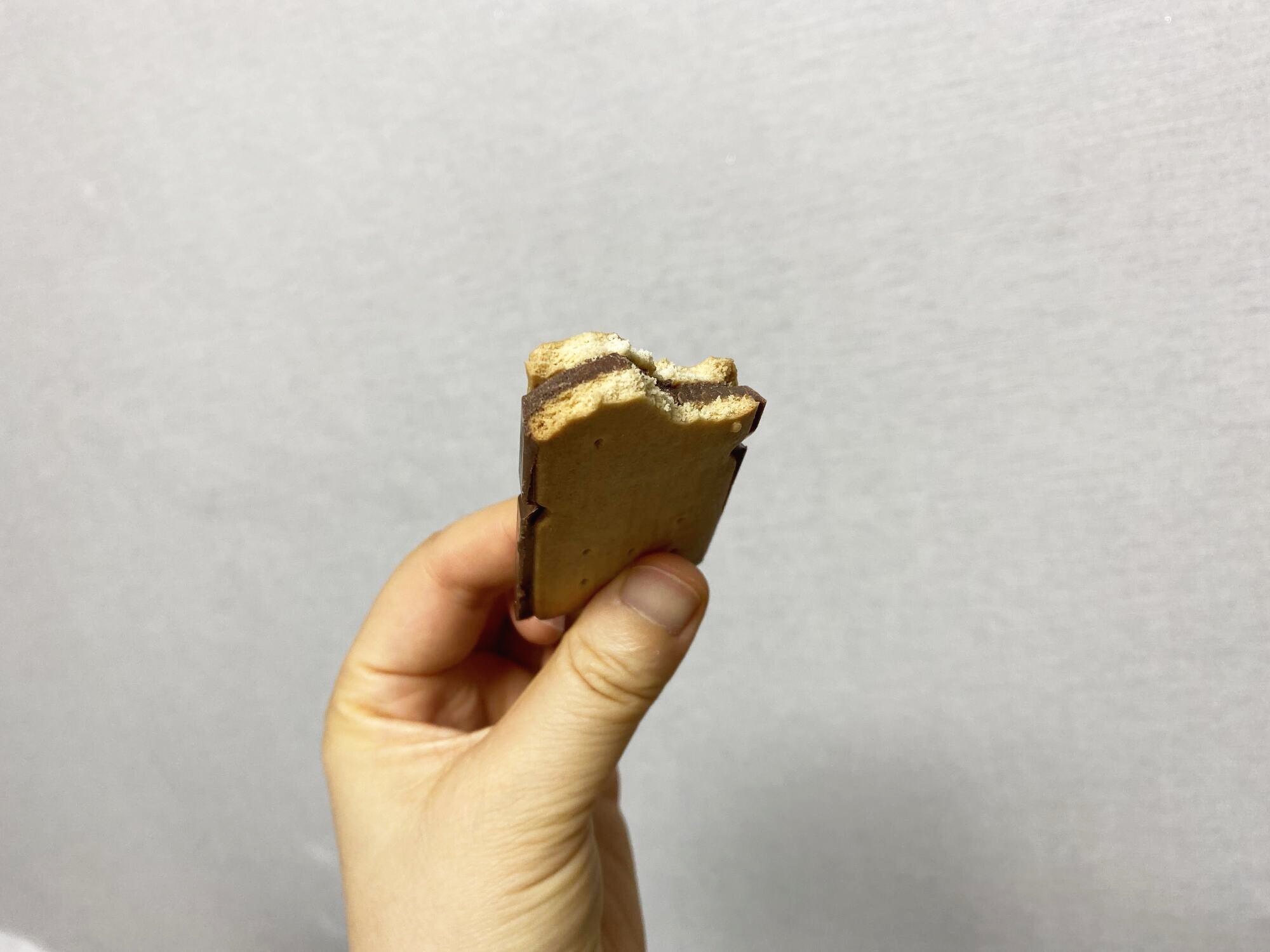 과자는 이름 그대로 비스킷 사이에 초콜릿이 끼워져 있다. 모양이 꽤 독특한 편이라고 생각한다.