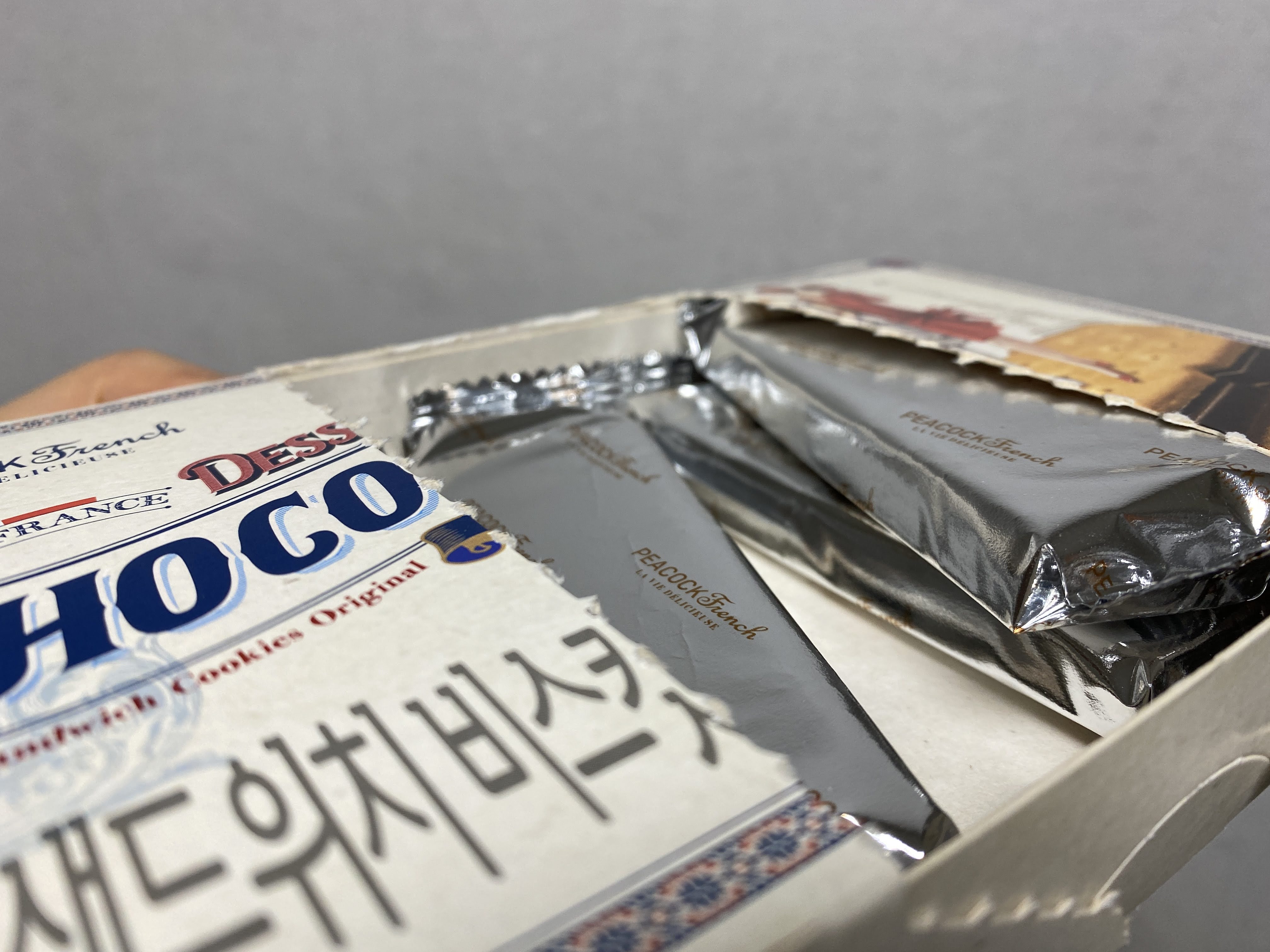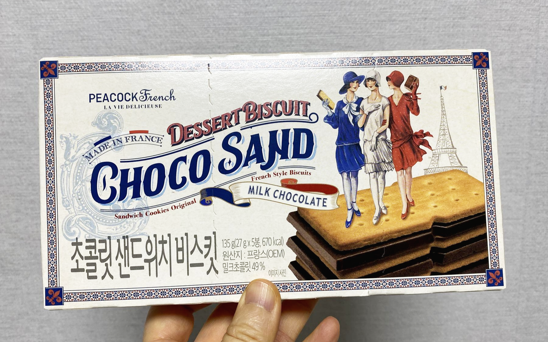 피코크에서 만든 과자이고, 노브랜드와는 다르게 피코크는 꽤 포장도 세련되게 뽑는다. 쿠키 위에 파리지앵들과 에펠탑 때문에 얼핏 수입과자처럼 보일 정도다.