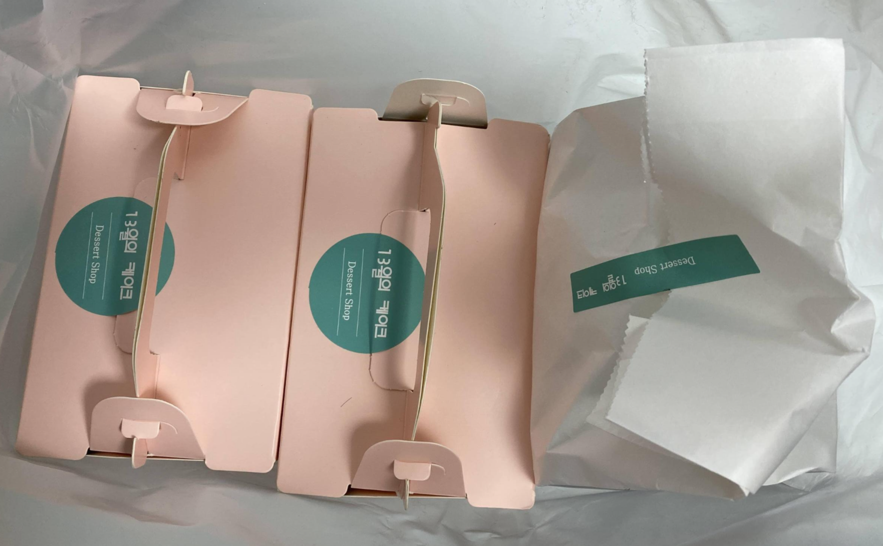 케이크는 귀여운 분홍색 상자에, 나머지는 종이봉투에 담아 주셨다.