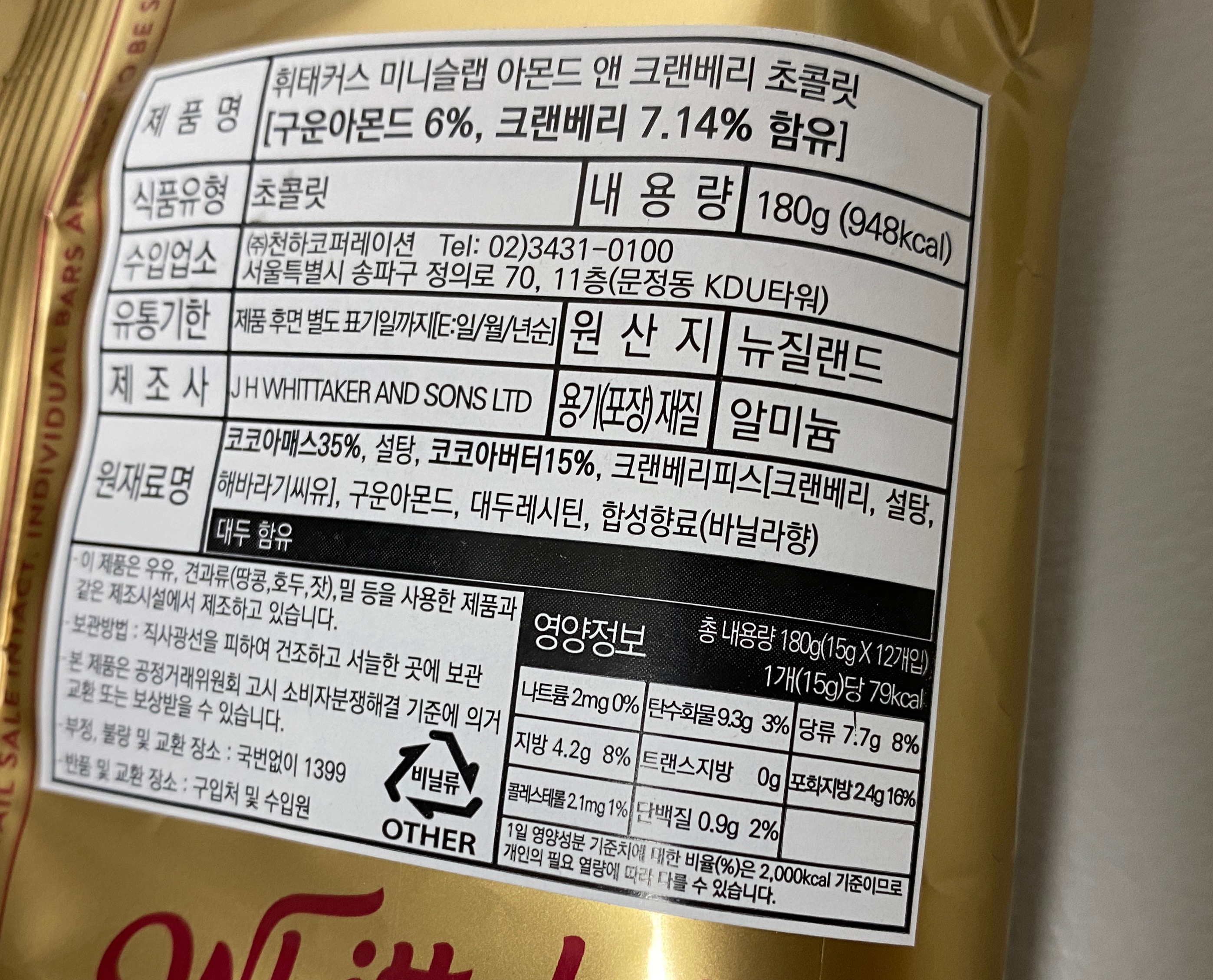 이것도 발렌타인데이 버프로 구매했던 초콜릿이다. 휘태커스는 뉴질랜드 초콜릿 브랜드로 맛이 좋고 다양하기로 유명하다. 뉴질랜드 여행 다녀오신 분에게 선물로 받아서 처음 먹어 보고 마음에 들어서 기억해 뒀던 곳이다.