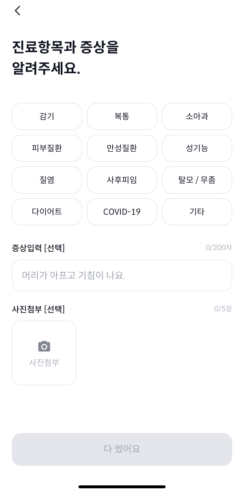 진료 항목을 선택. 코로나는 covid-19를 고른다. 그리고 증상을 입력하고!