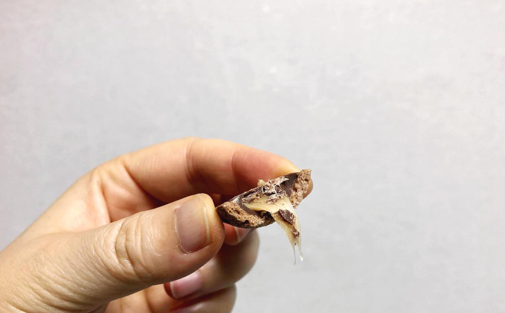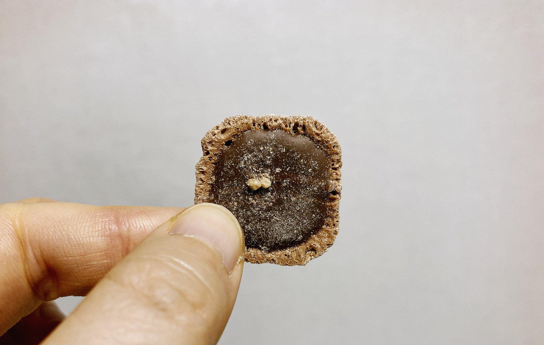 크기는 작다. 우묵하게 패인 모양의 과자에 카라멜을 채우고 위를 초콜릿으로 꽁꽁 봉해 둔 모양. 그래서 이름이 그런갑다.