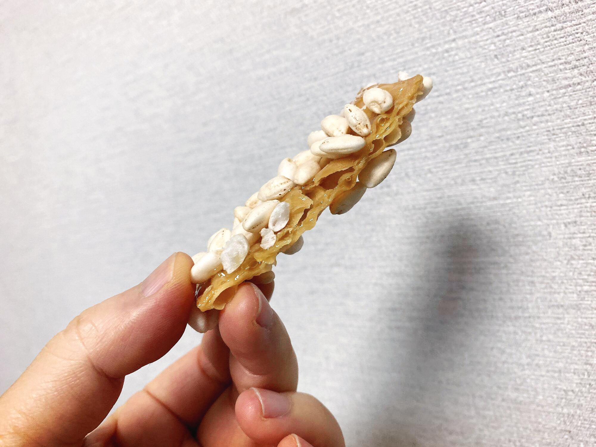 크기는 여느 과즐들과 거의 차이가 없는 듯하다. 군데군데 주황빛이 도는 과자가 보인다.