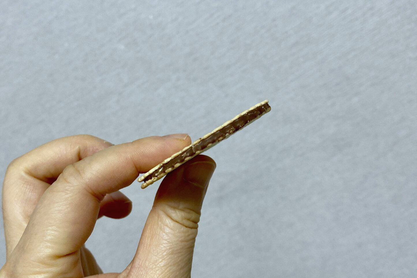 동그랗고 얇고 바삭한 감자 과자 사이에 초콜릿이 발려 있다.