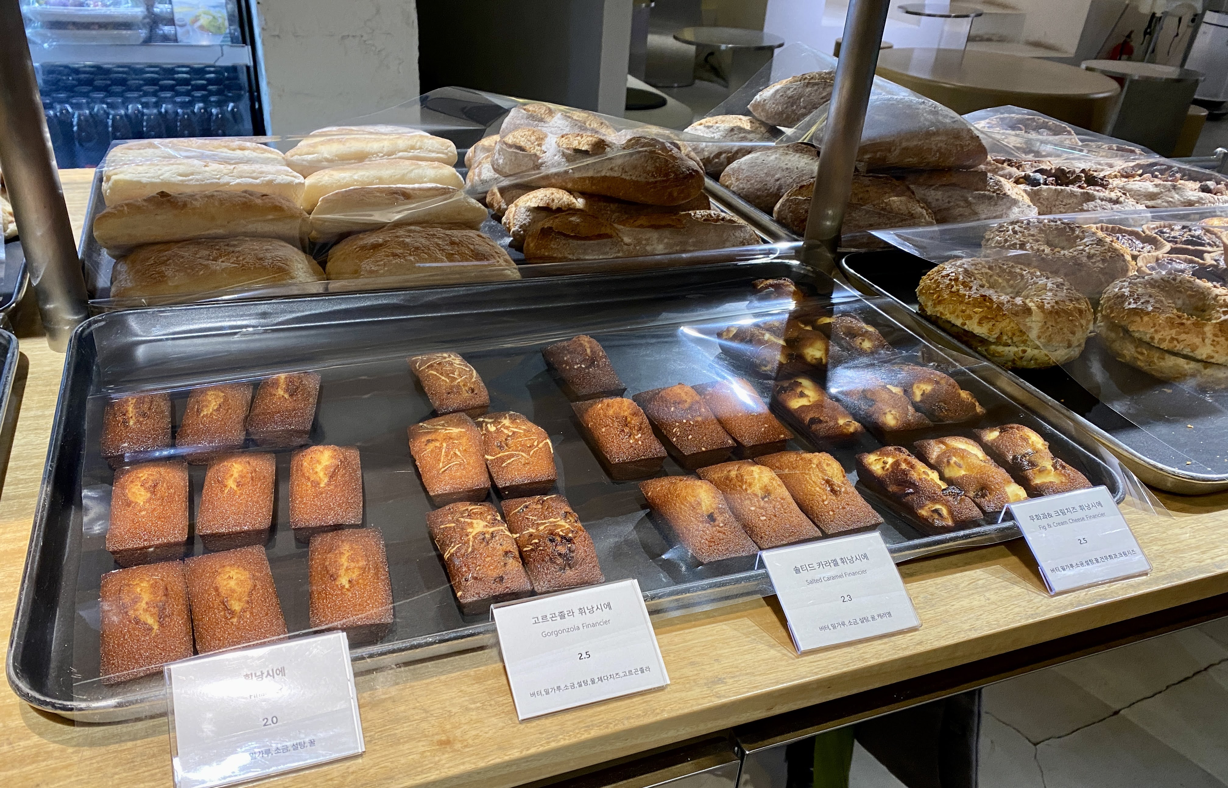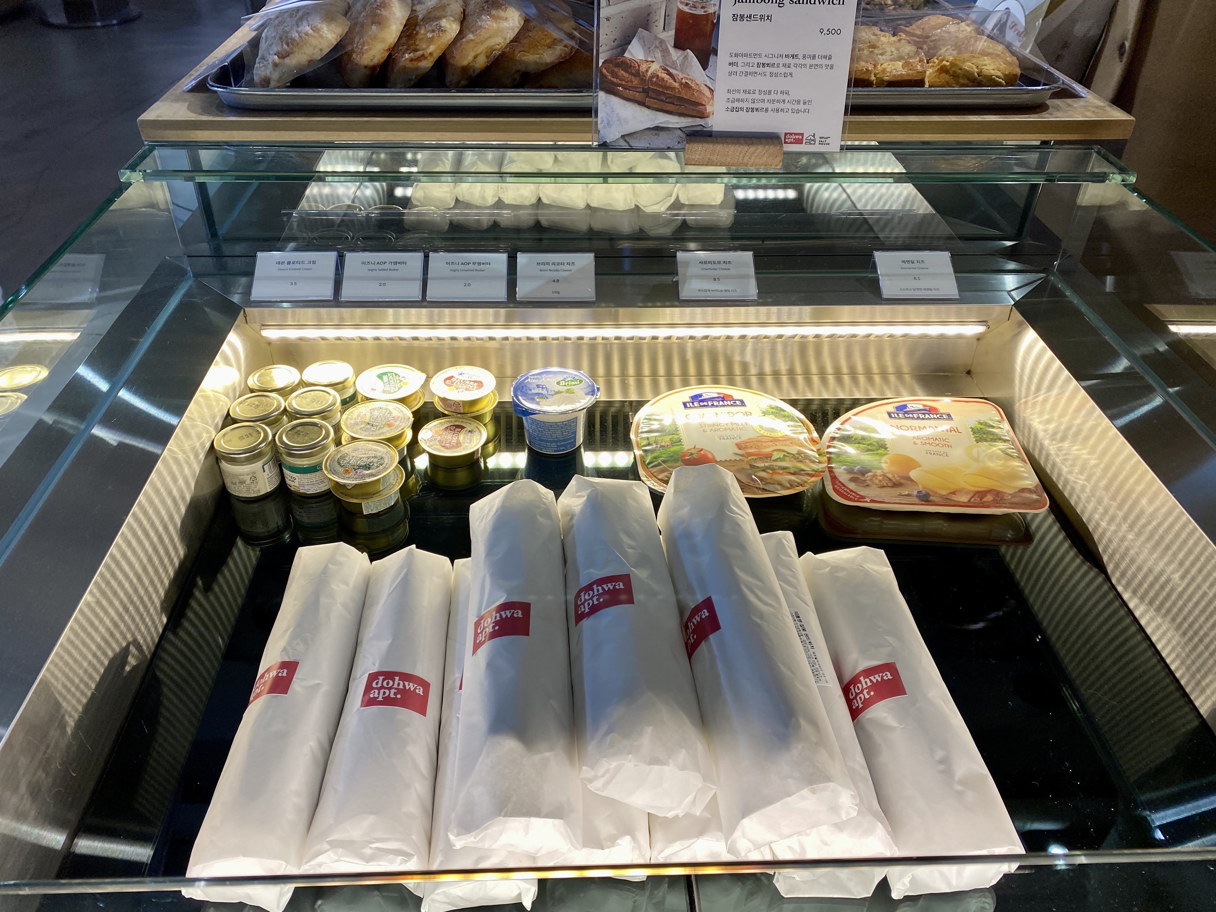 내려가면 잘 구운 빵들이 놓여져 있어서 홀린 듯이 발걸음을 옮기게 된다. 무화과가 듬뿍 올라간 깜빠뉴, 바삭하고 쫄깃해 보이는 치아바타, 잠봉뵈르로 유명한 소금집과 같은 햄을 쓴다는 잠봉뵈르 샌드위치 등 맛있는 게 많다.