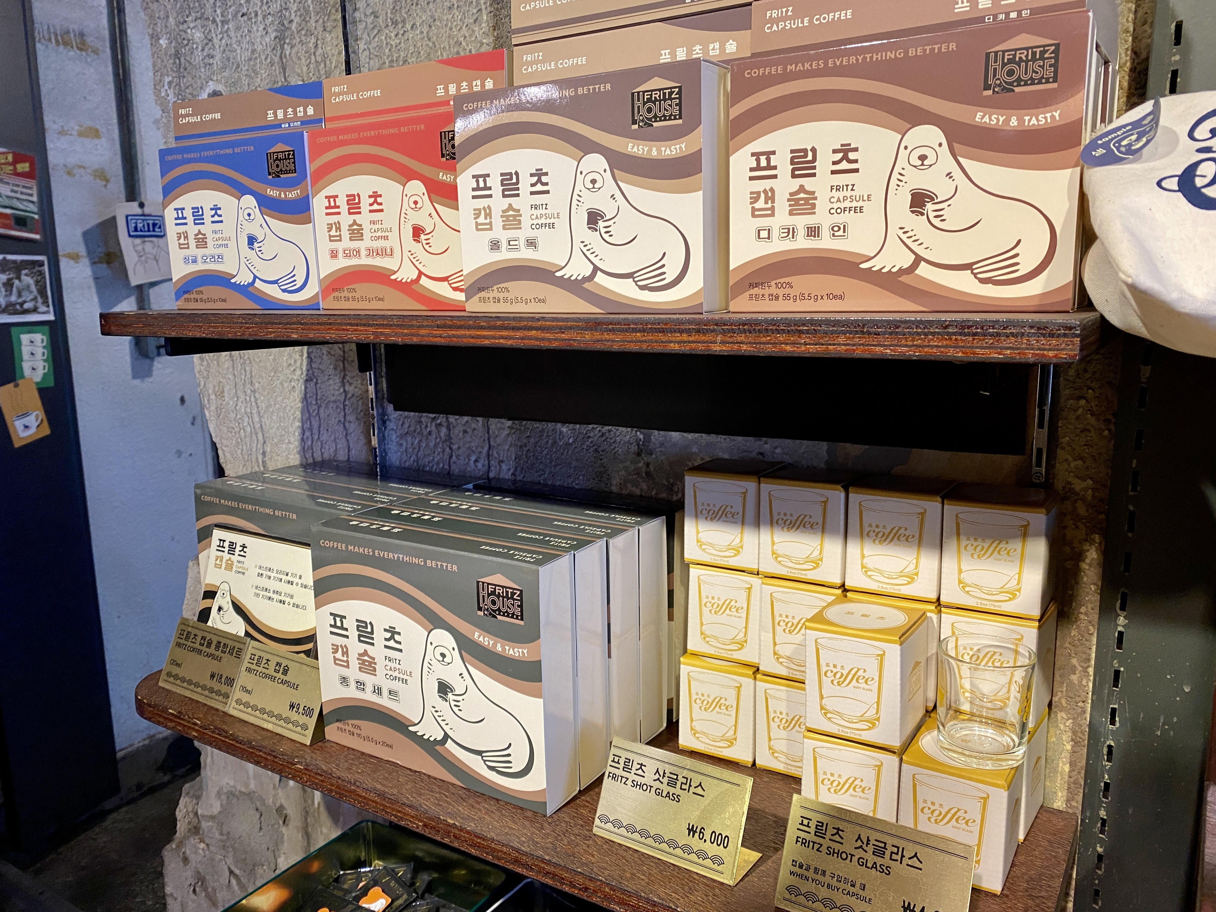 카페에 들어서자마자 볼 수 있는 곳에 진열된 캡슐 커피.