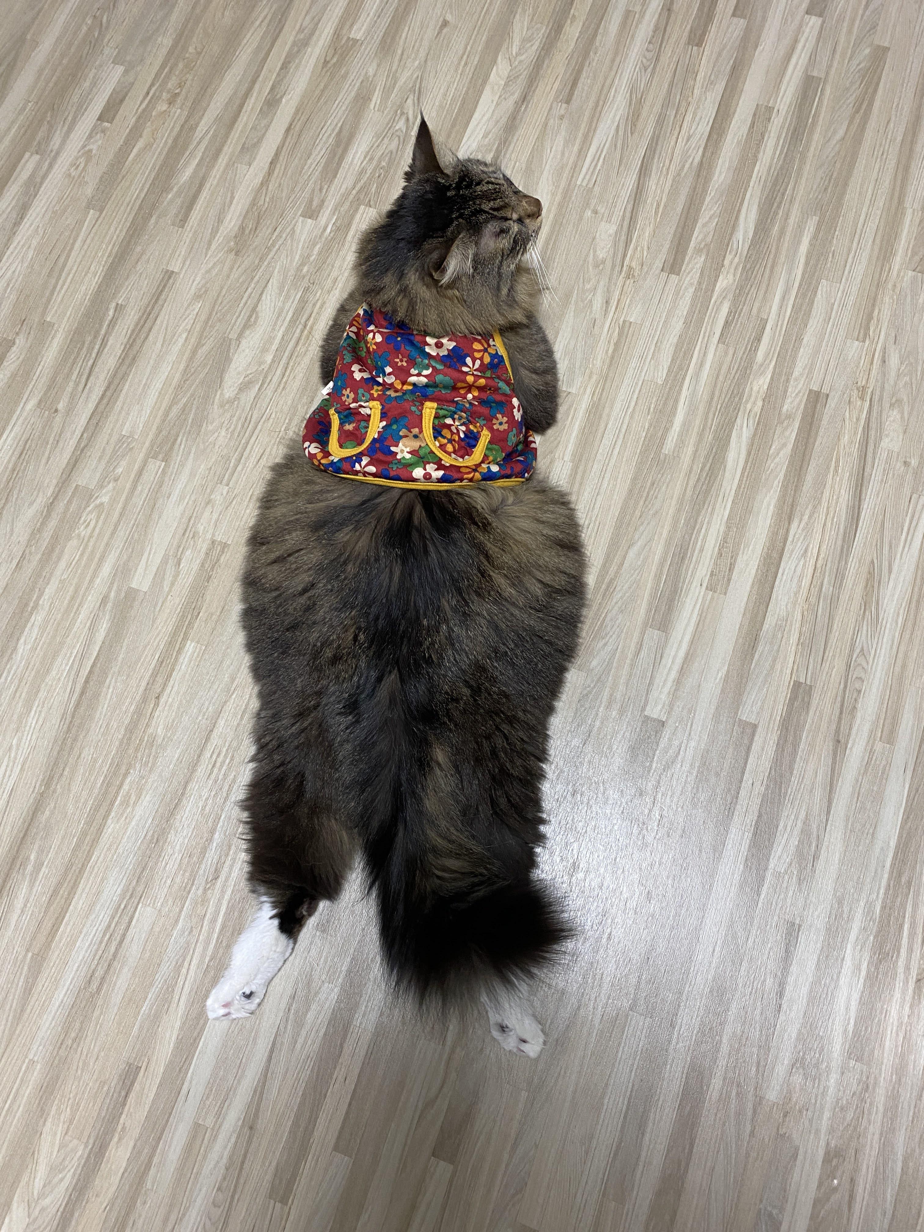 아랍풍이라고 해야 할까? 고양이들의 털무늬에 따라 이국적인 느낌을 주기도 한다. 앉아 있을 때는 감쪽같이 그냥 고양이다리처럼 보이지만, 고양이가 일어서는 순간 솜바지가 드러난다.