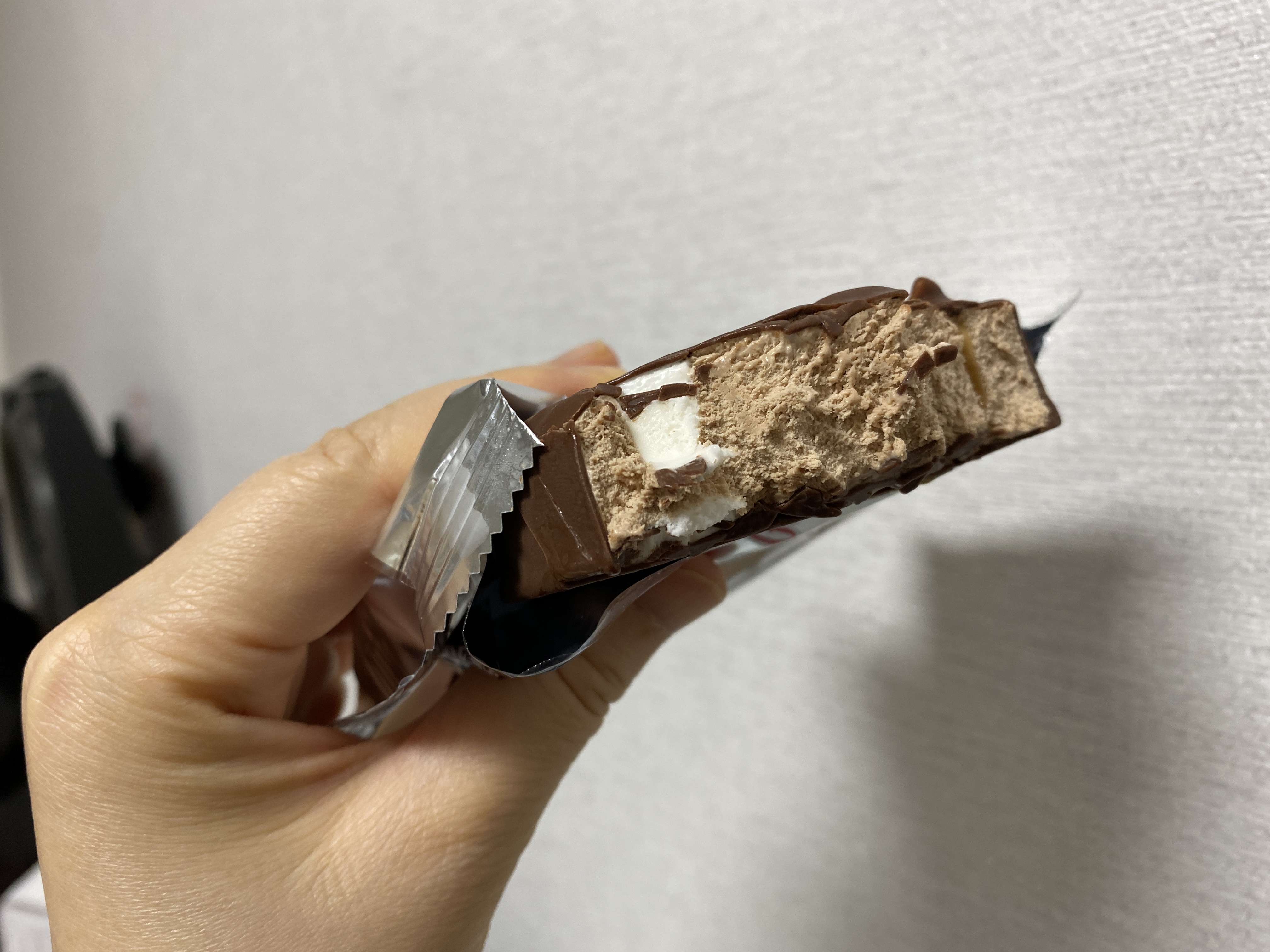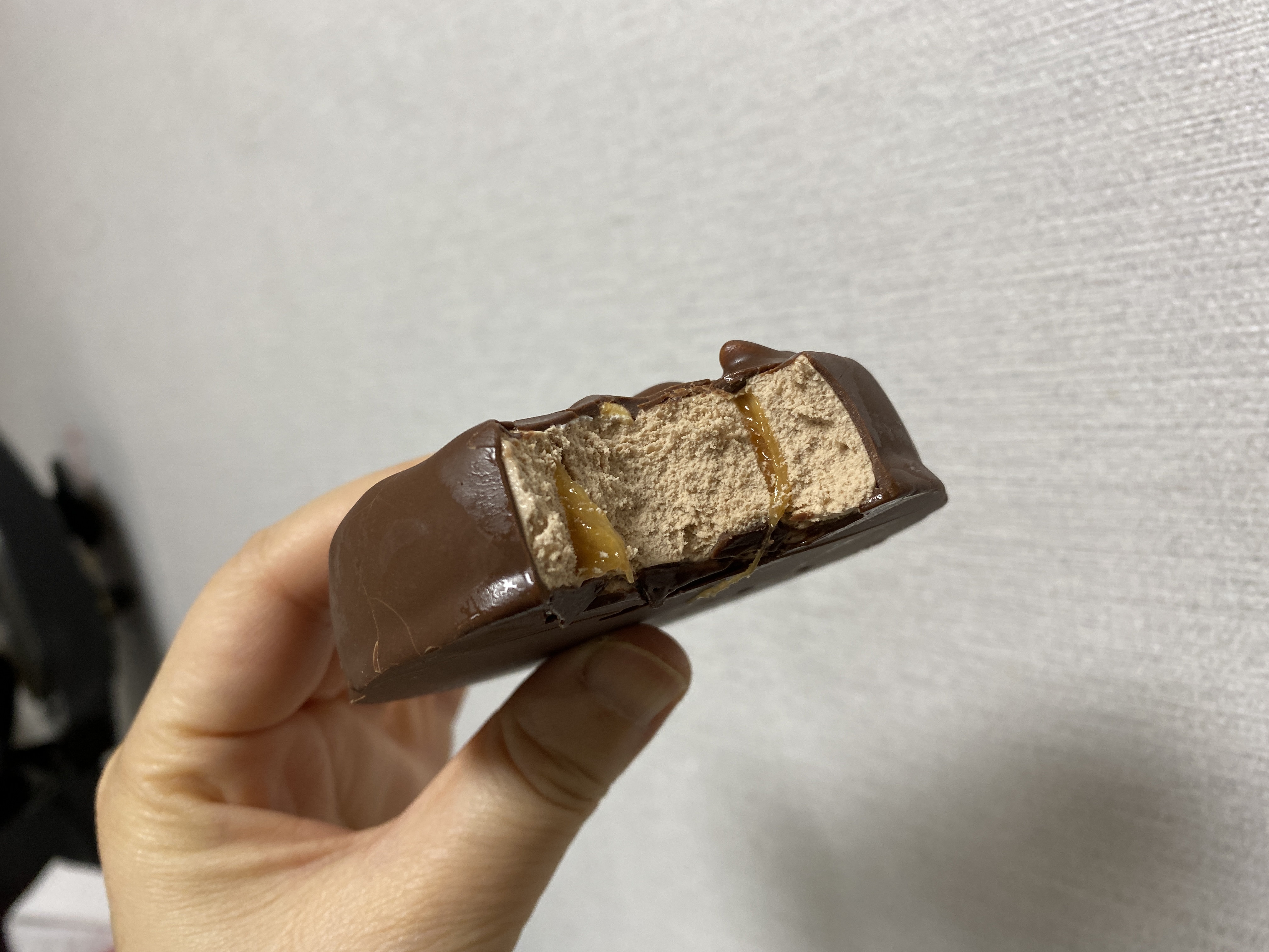 왐냠. 초코 코팅 안에는 달콤한 초코 아이스크림과 찐득한 카라멜시럽이 들어 있다. 카라멜 시럽이 늘어나서 턱 밑에 묻기 쉬우니까 먹을 때 주의!