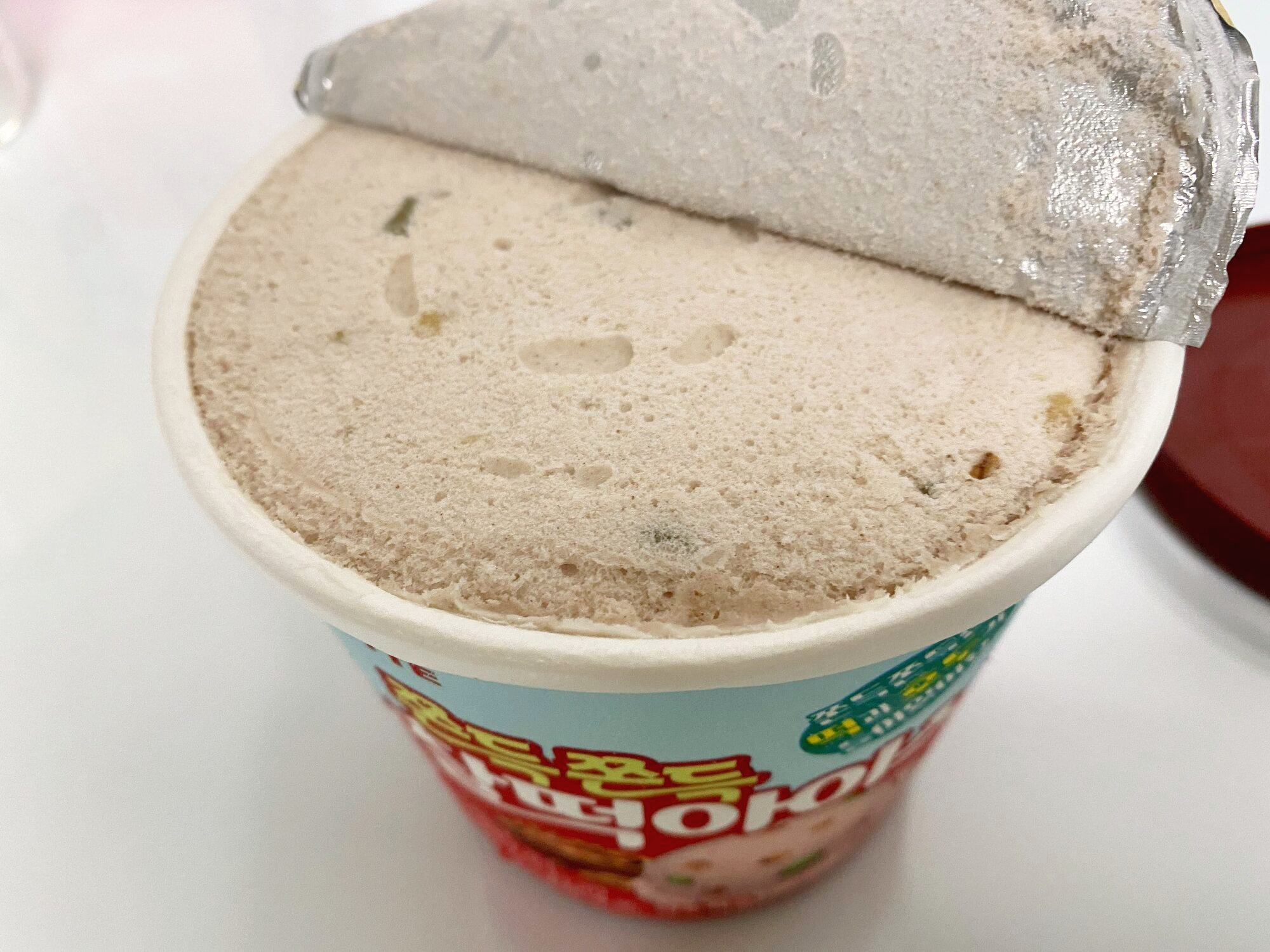 한 숟갈 헤집어 봤는데, 저 초록색 작은 동글동글한 것들이 떡이다. 떡은 딱 찰떡아이스를 감싼 그 초록색 떡 맛이 난다.