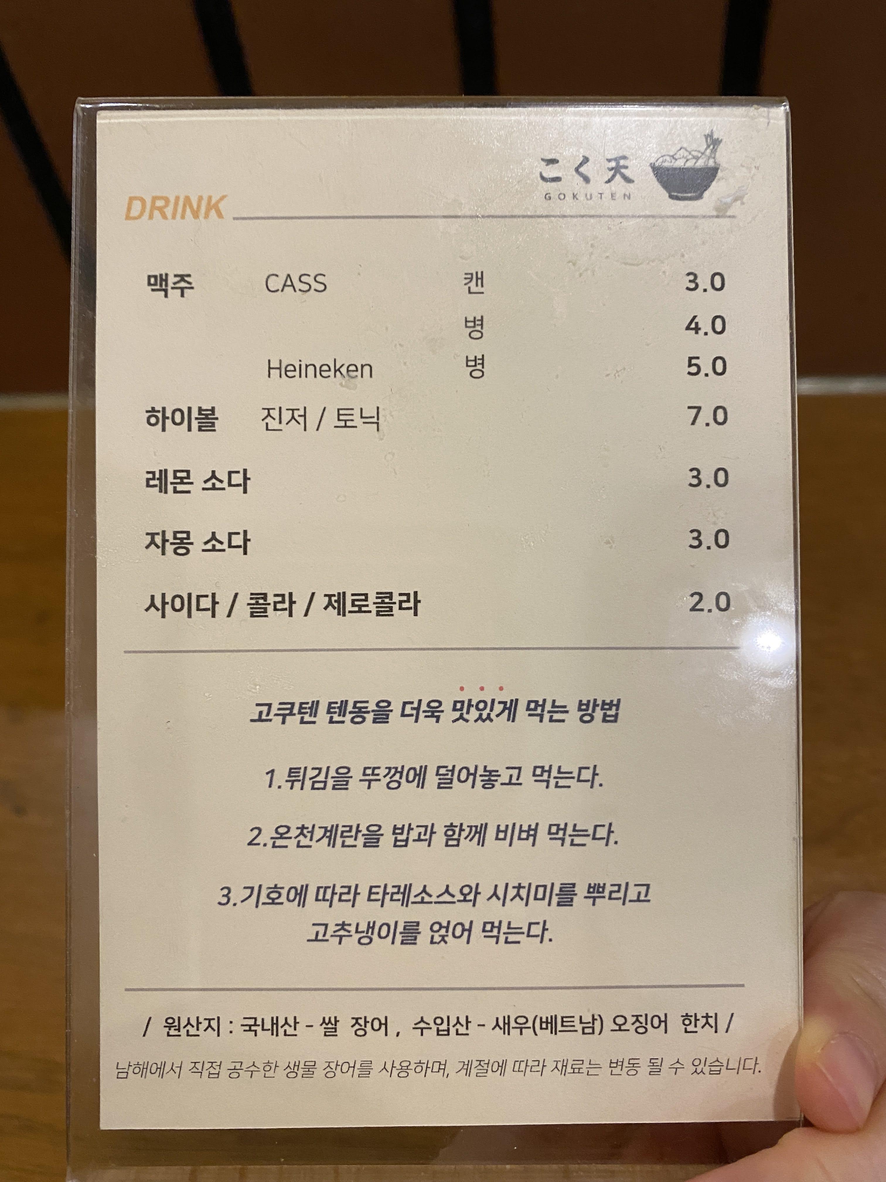 텐동이란 음식 자체를 여기서 처음 먹는 건데, 바로 앞에서 튀김이 튀겨지는 걸 보면서 음식을 기다리니까 그냥 그 자체로 디너쇼에 와 있는 기분이었다. 오픈 키친의 장점이지.