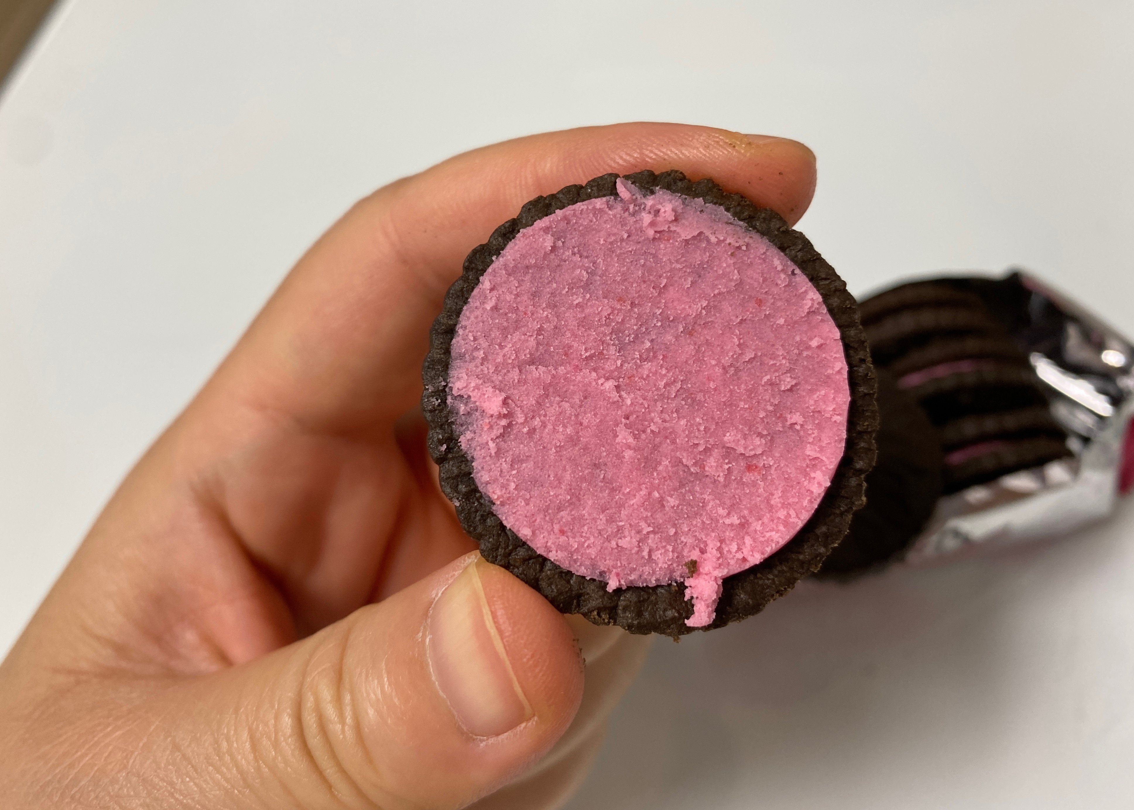 맛은 롯샌 까만 쿠키 맛에 새콤한 딸기 크림 맛. 거부감없이 무난하게 먹을 수 있는 맛이다.