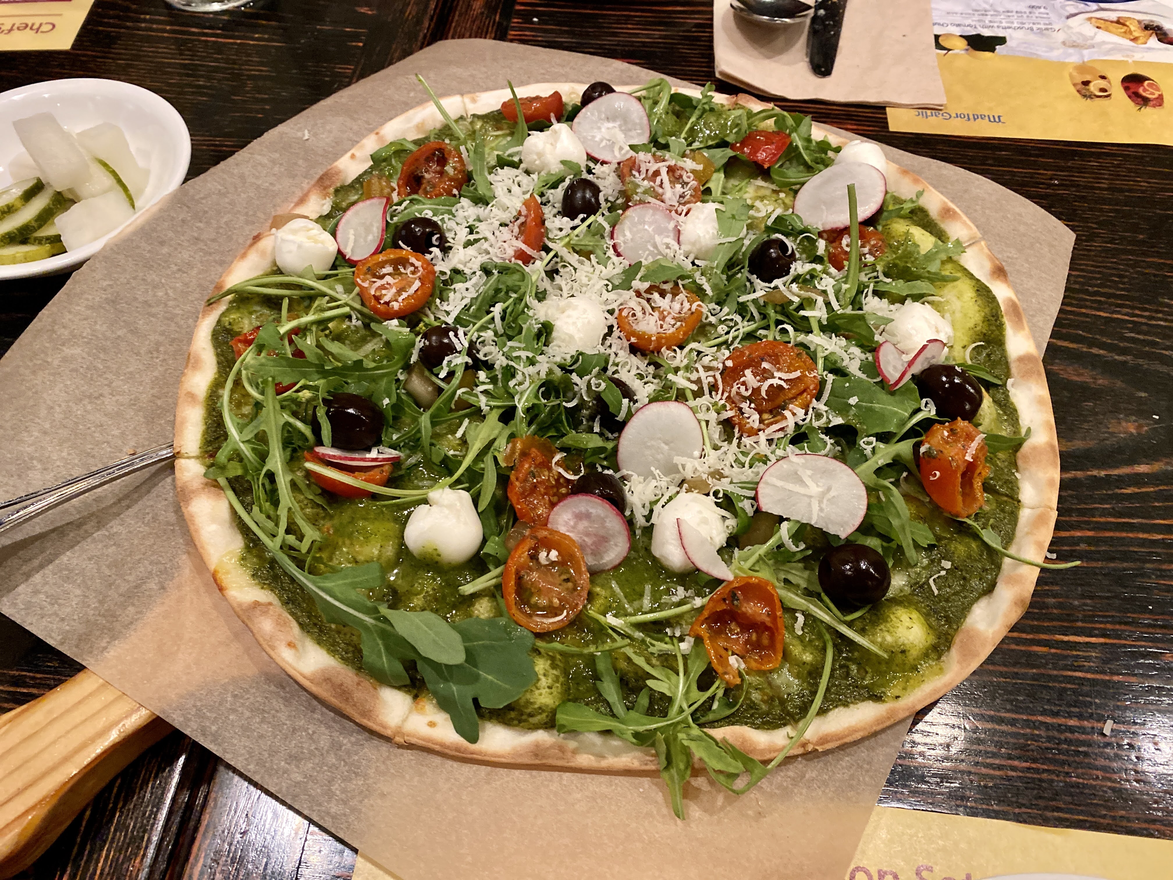 다음 나온 메뉴는 카프레제 피자. 얇고 쫄깃한 도우 위에 바질페스토를 듬뿍 바르고, 그 위에 루꼴라 모짜렐라, 토마토, 올리브를 올려서 마무리.