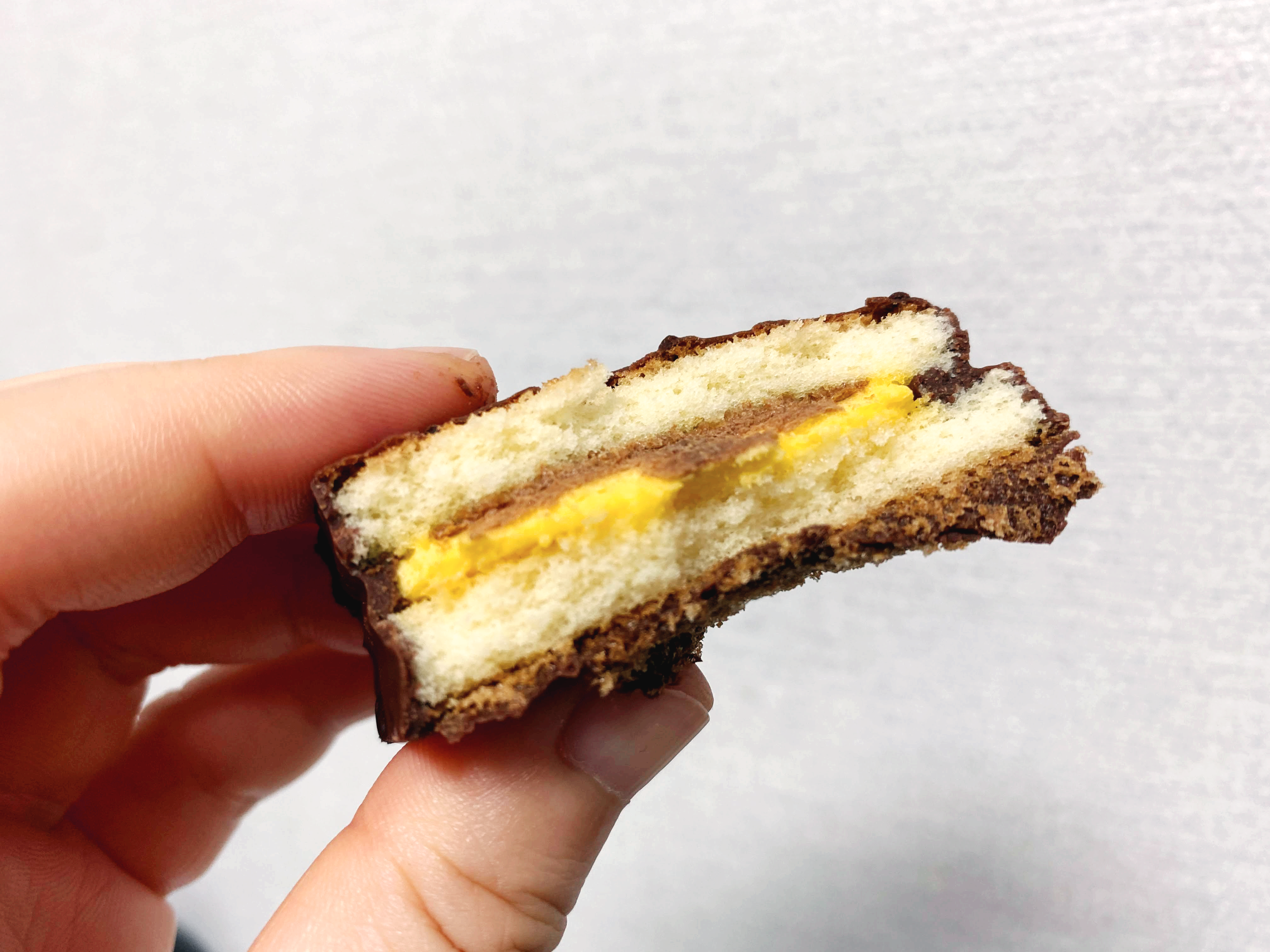 반을 쪼개면 초코크림과 옥수수크림이 사이좋게 포개져 있다.