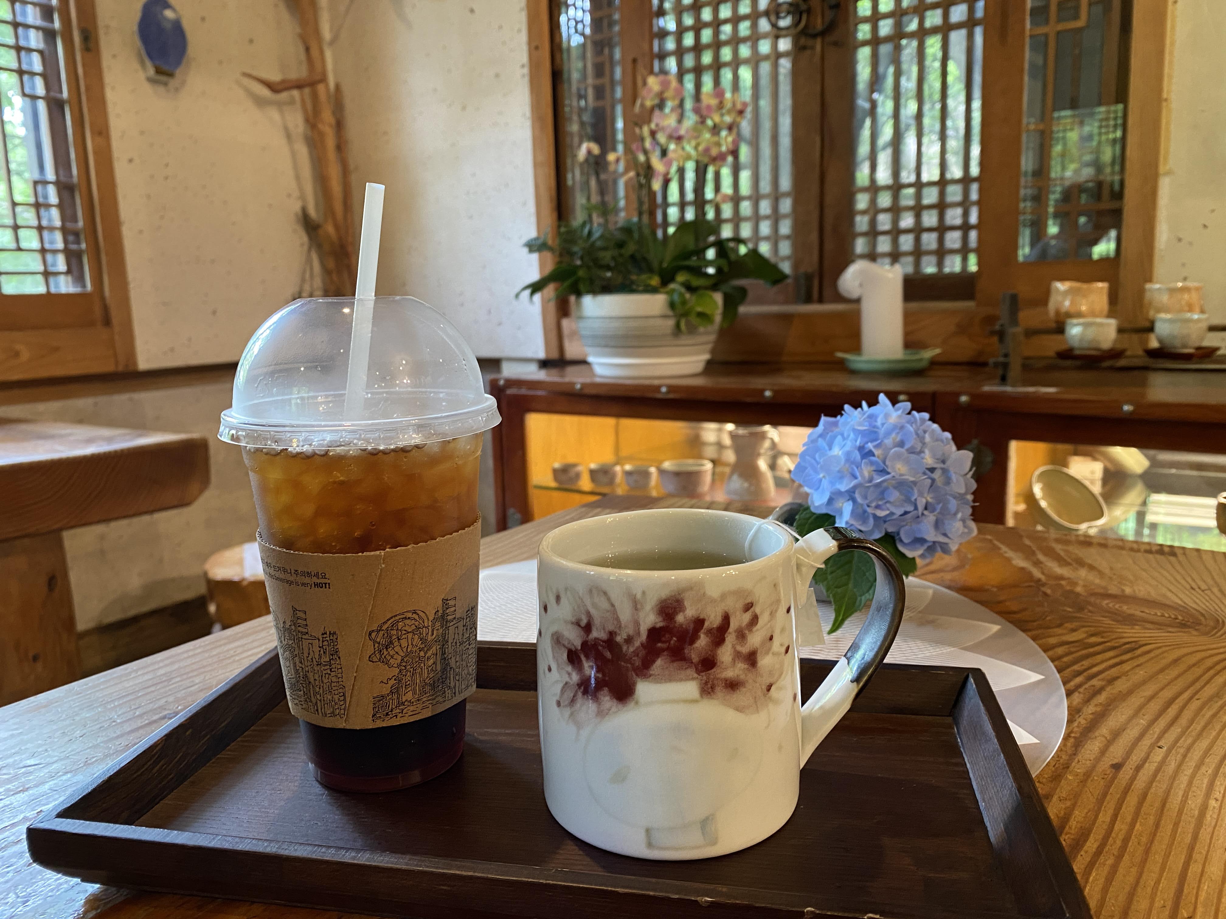 전등사 안에는 죽림다원이라는 찻집이 있는데 더위도 식힐 겸 찻집 들어가서 엄마는 쑥차, 나는 커피를 마셨다.