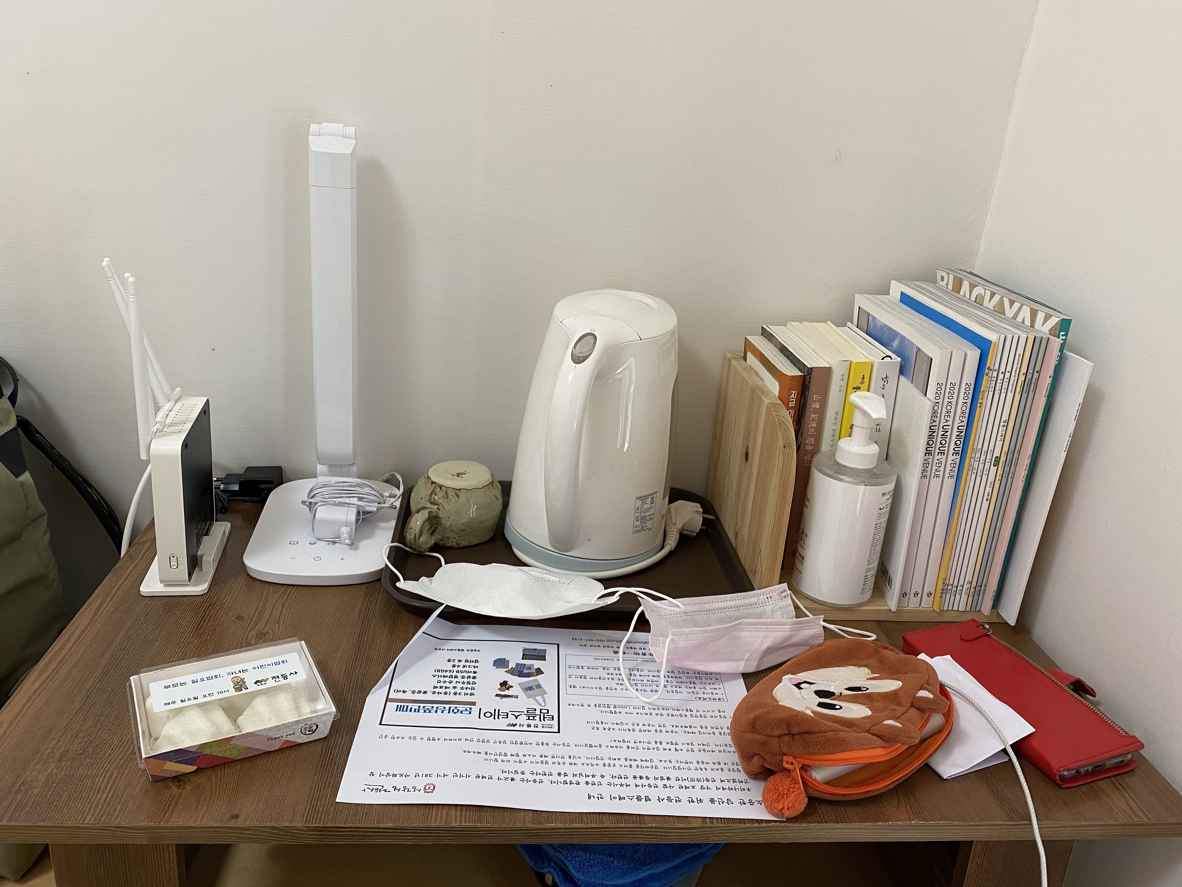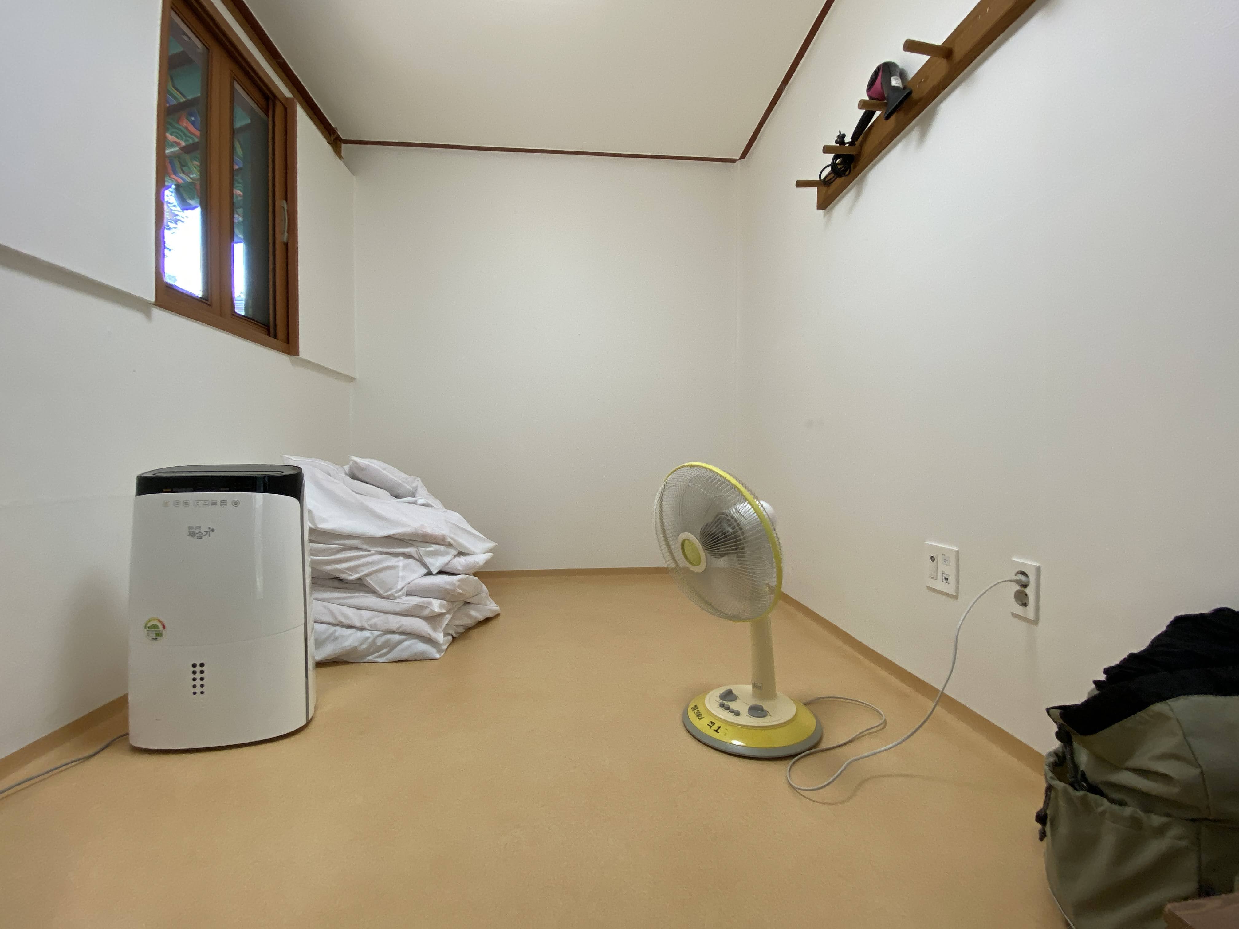 방은 크진 않지만 선풍기, 제습기, 옷걸이, 드라이기, 작은 책상, 커피 포트, 스탠드 등 있을 건 다 있었다.