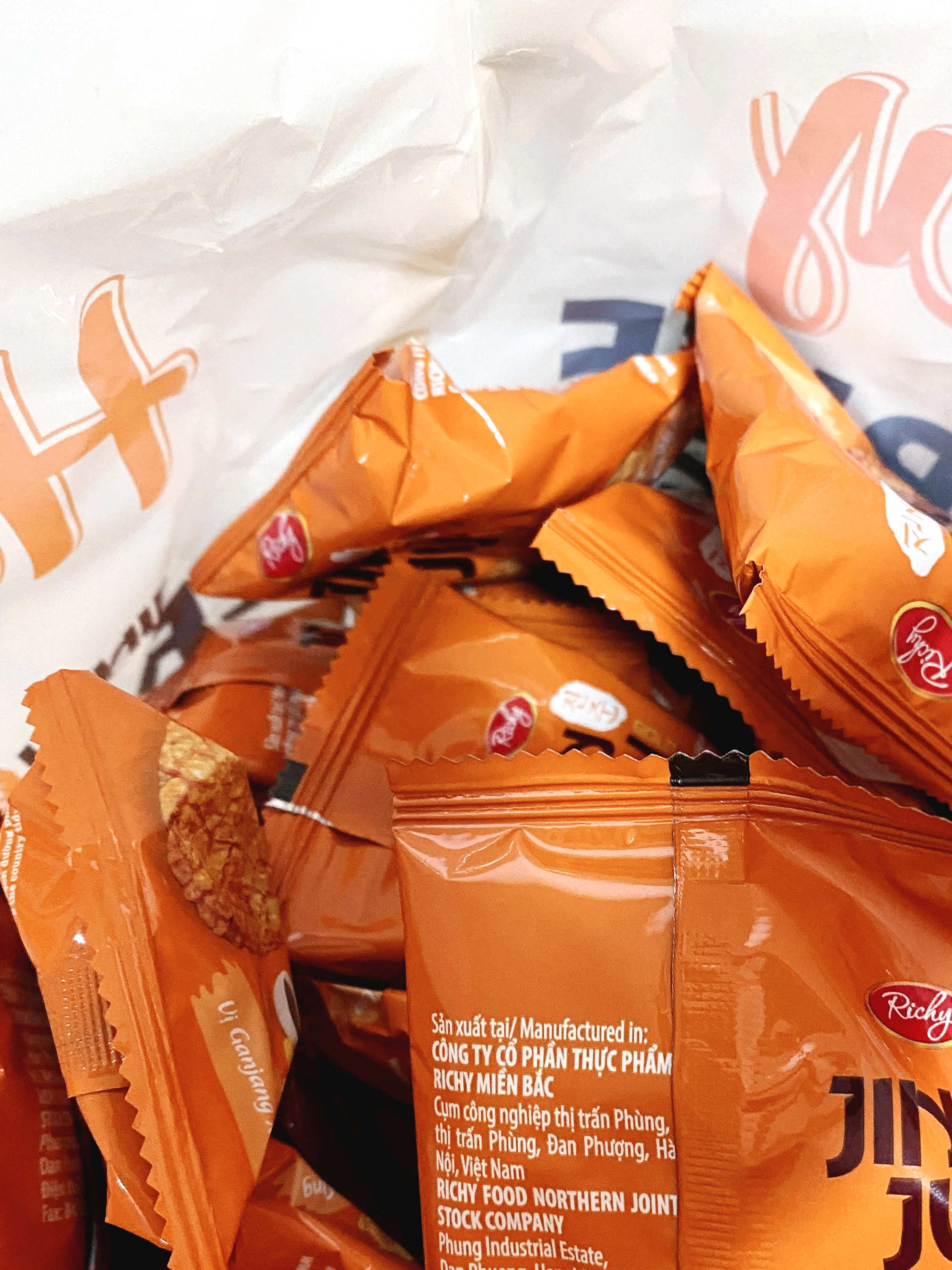 안에는 주황색 과자들이 잔뜩! 개별포장된 채로 들어 있다.