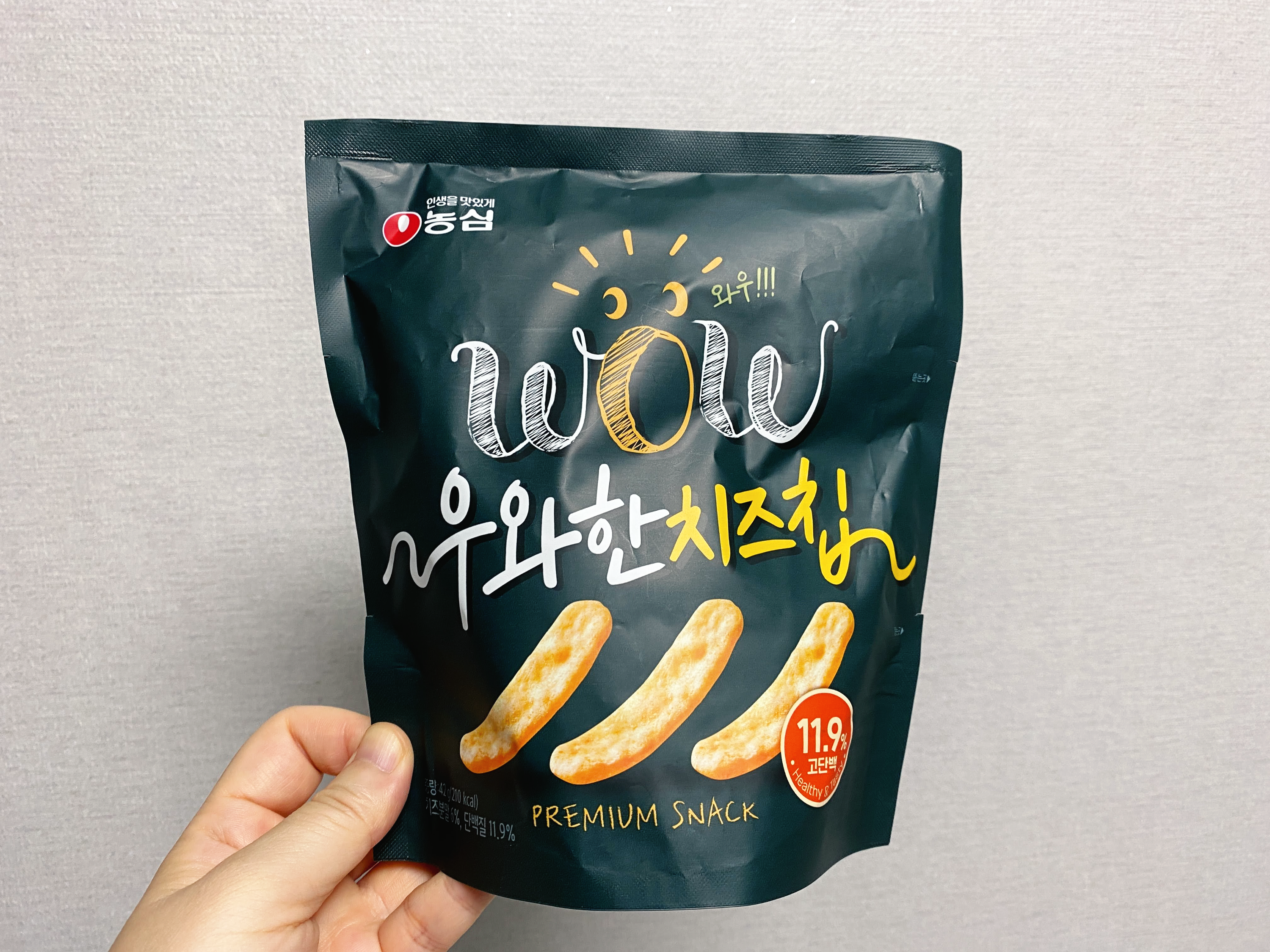 이 과자도 단백질 함량이 높다고 광고하고 있다. 하지만 콩칩과 마찬가지로 11.9그램의 단백질이 들어간 게 아니라, 제품 내 구성 비율이 11.9퍼센트라는 뜻이니 헷갈리지 말자!