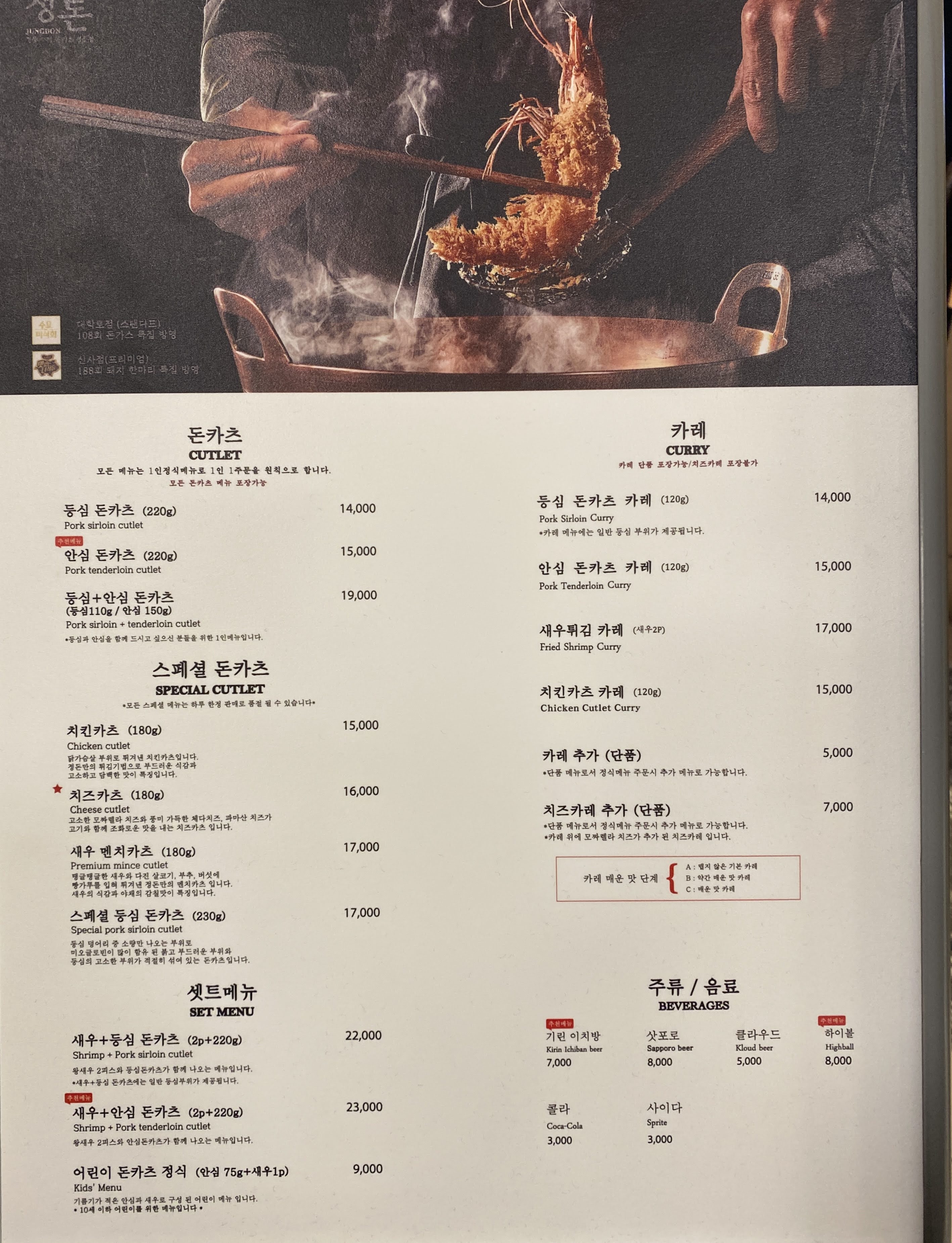 그리고 나서 바로 며칠 뒤에 또 가서 이번에는 스페셜 등심을 먹었다. 다른 분은 새우 튀김 카레를 주문하셨다. 스페셜 등심은 정말 맛있었다. 양도 많고. 처음 한 입만큼은 히레를 뛰어넘는 맛을 보여줬다. 기름의 고소함과 등심의 식감이 혀를 확 사로잡았다!