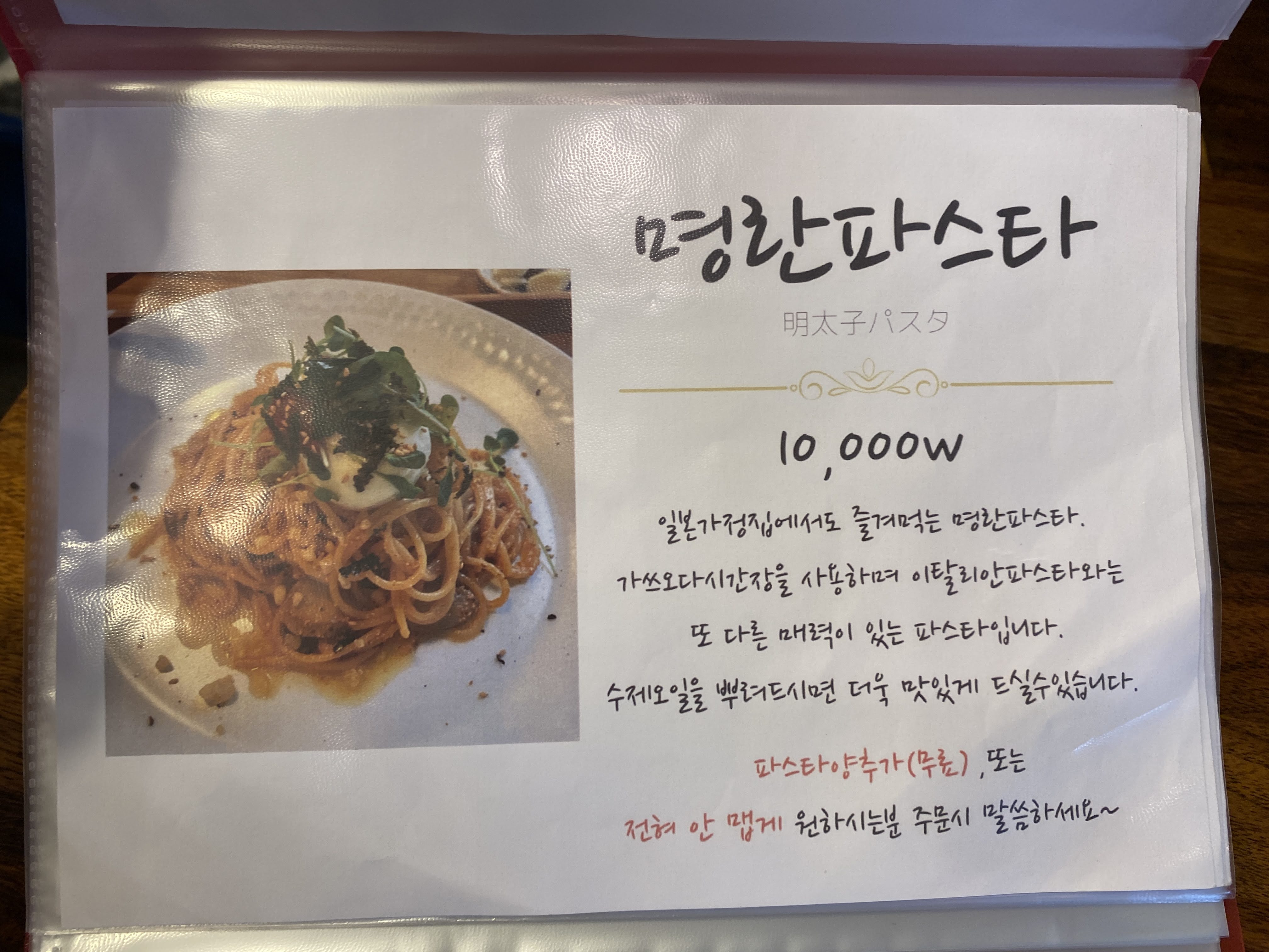 대체로 다 맛있어 보여서 한참 고민하다가 명란 파스타와 맘스그라탕을 주문했다.