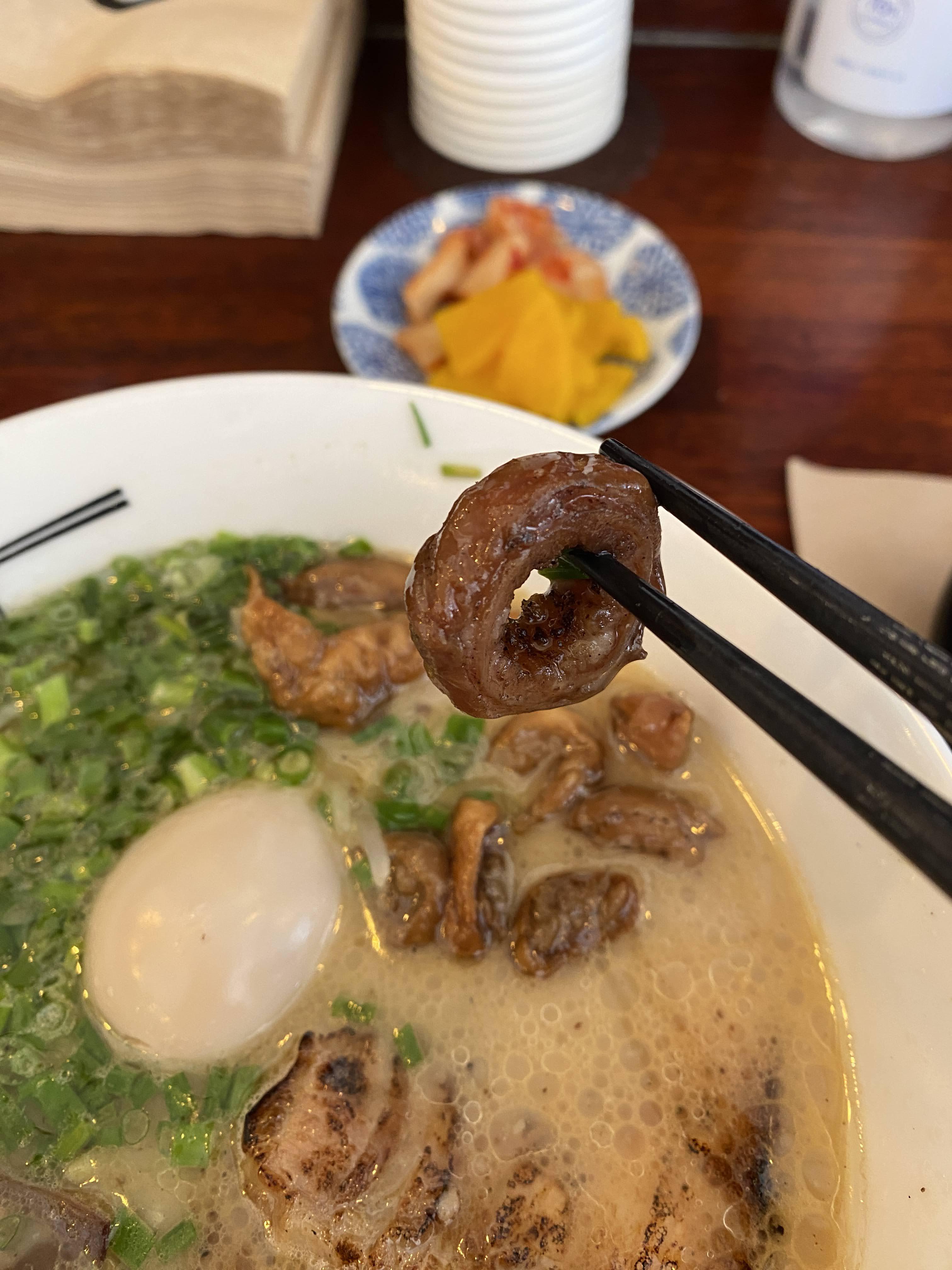 목이버섯, 차슈, 계란, 튀김막창이 올라간 고명만 봐도 맛있어 보이는 라면이었다.