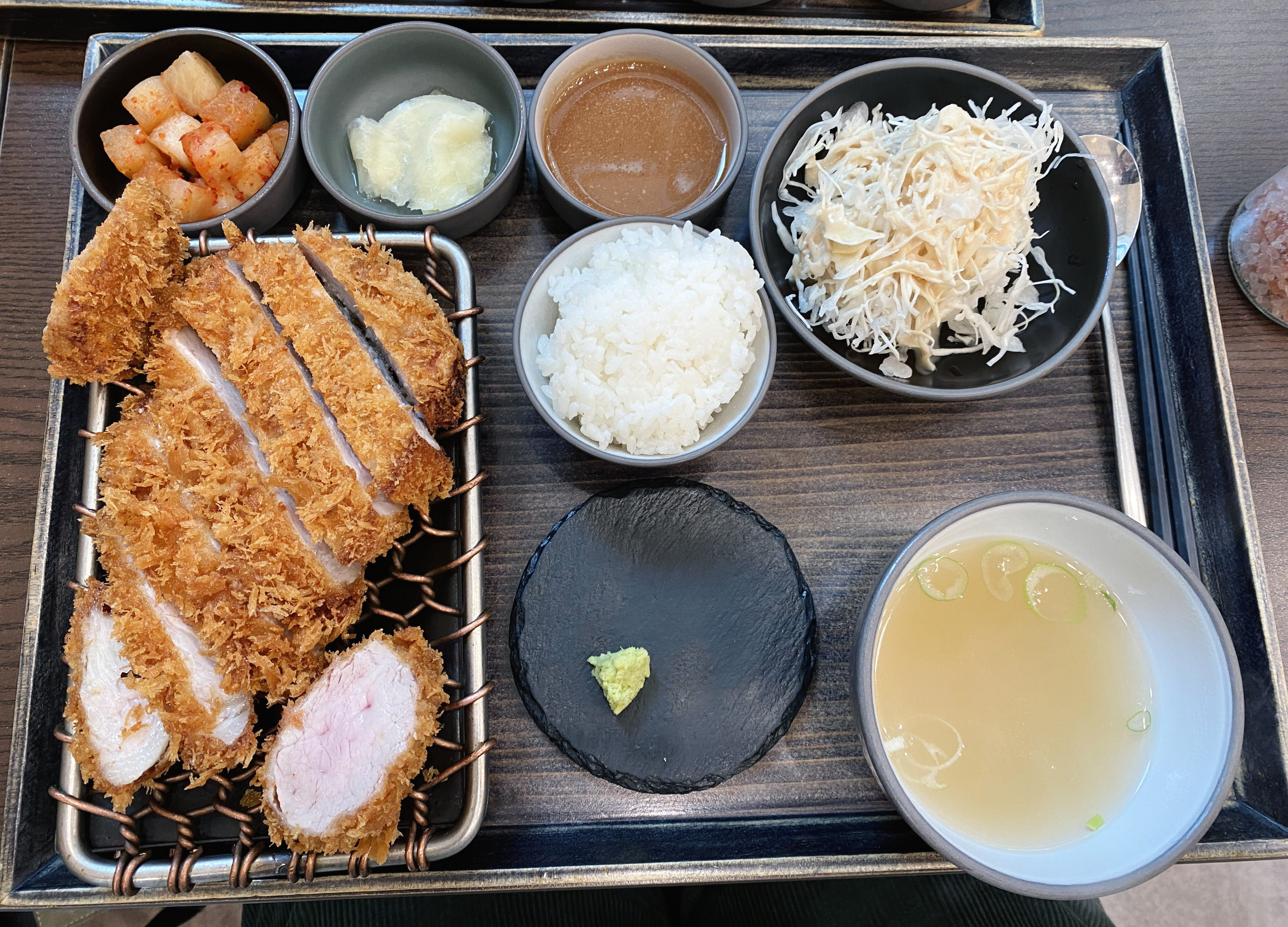 샐러드, 약간 얼큰해서 좋았던 국, 깍두기, 초생강, 돈까스 소스, 고추냉이!