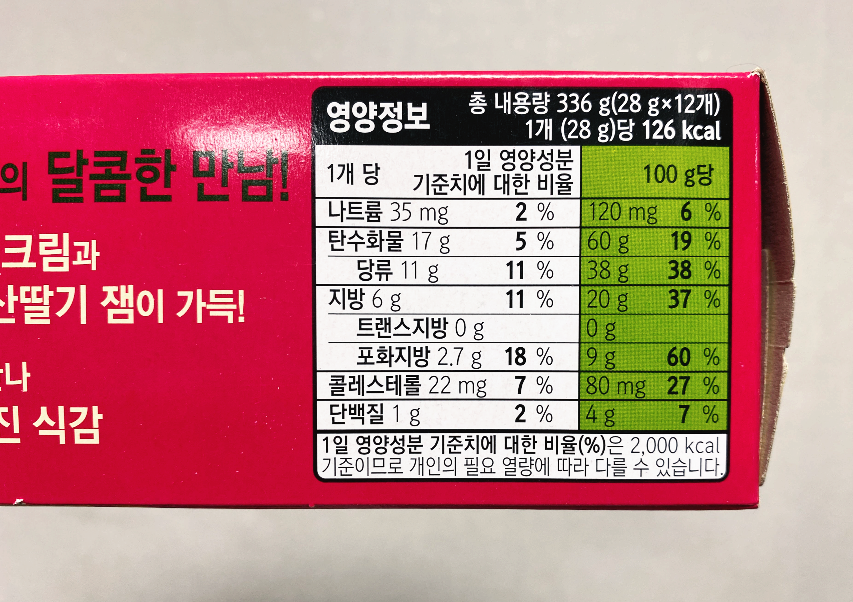 영양정보. 1개당 126킬로칼로리. 하나 먹고 냠냠할 때 한 개 더 먹어도 괜찮을 듯한 칼로리다.