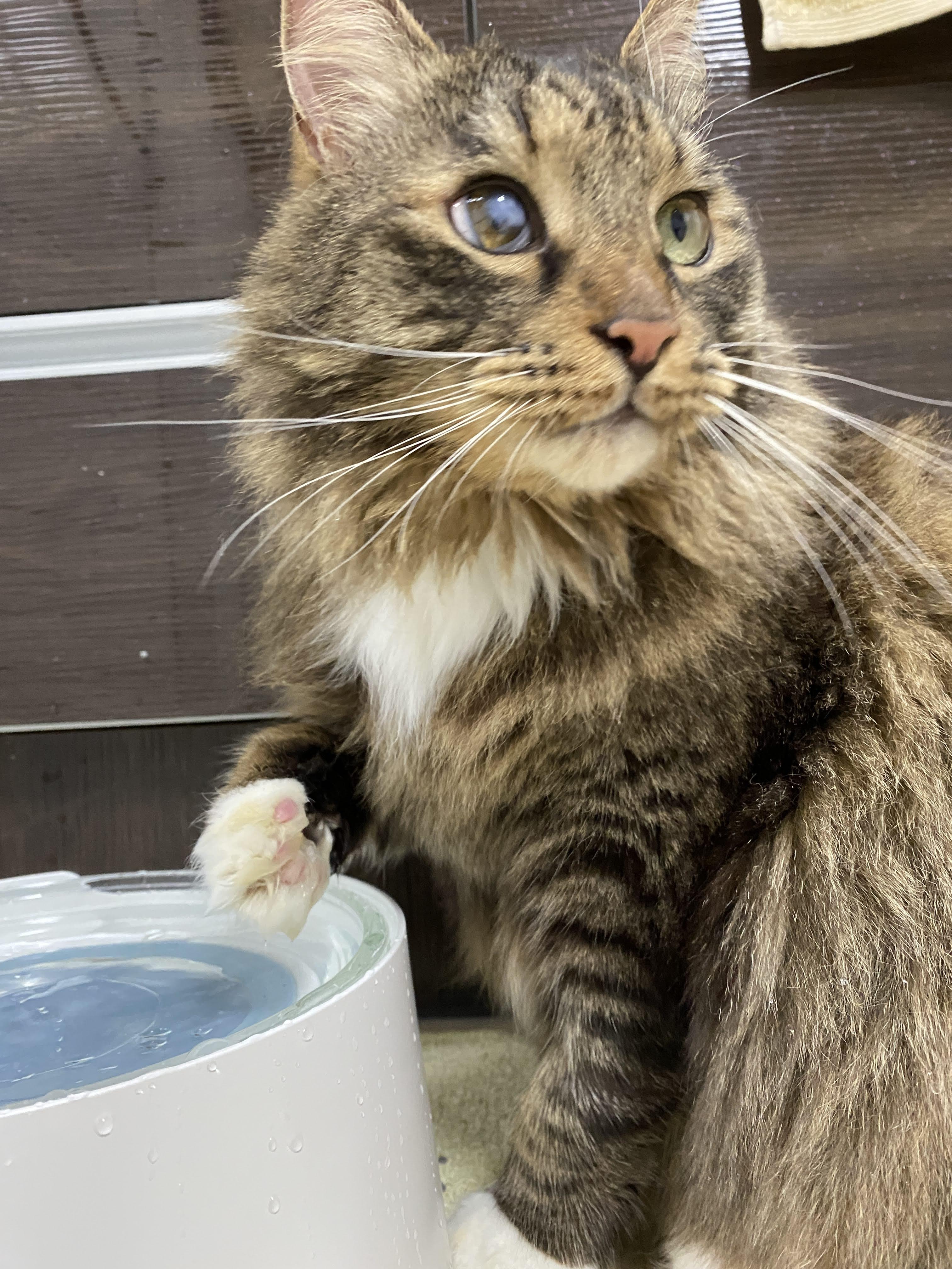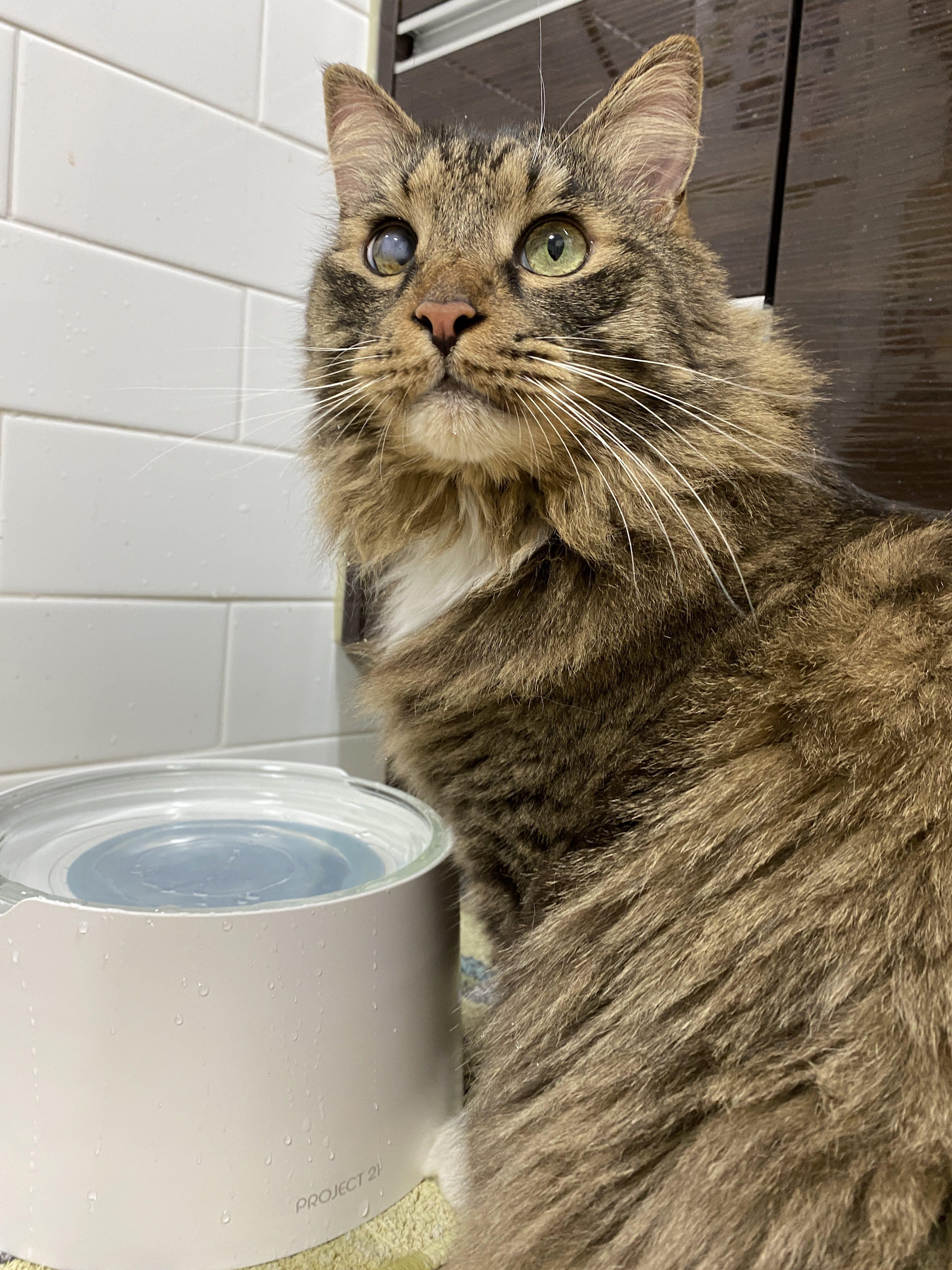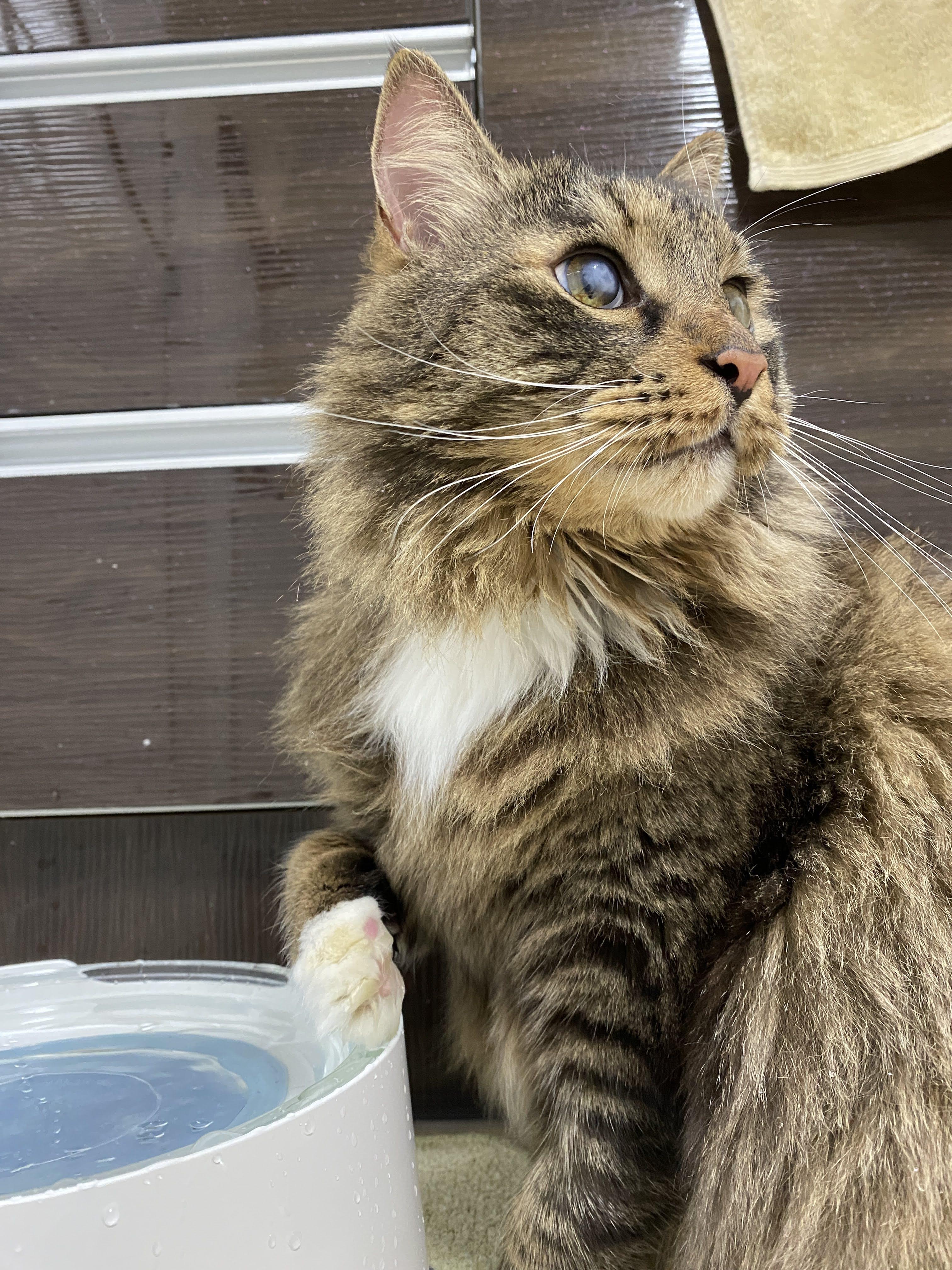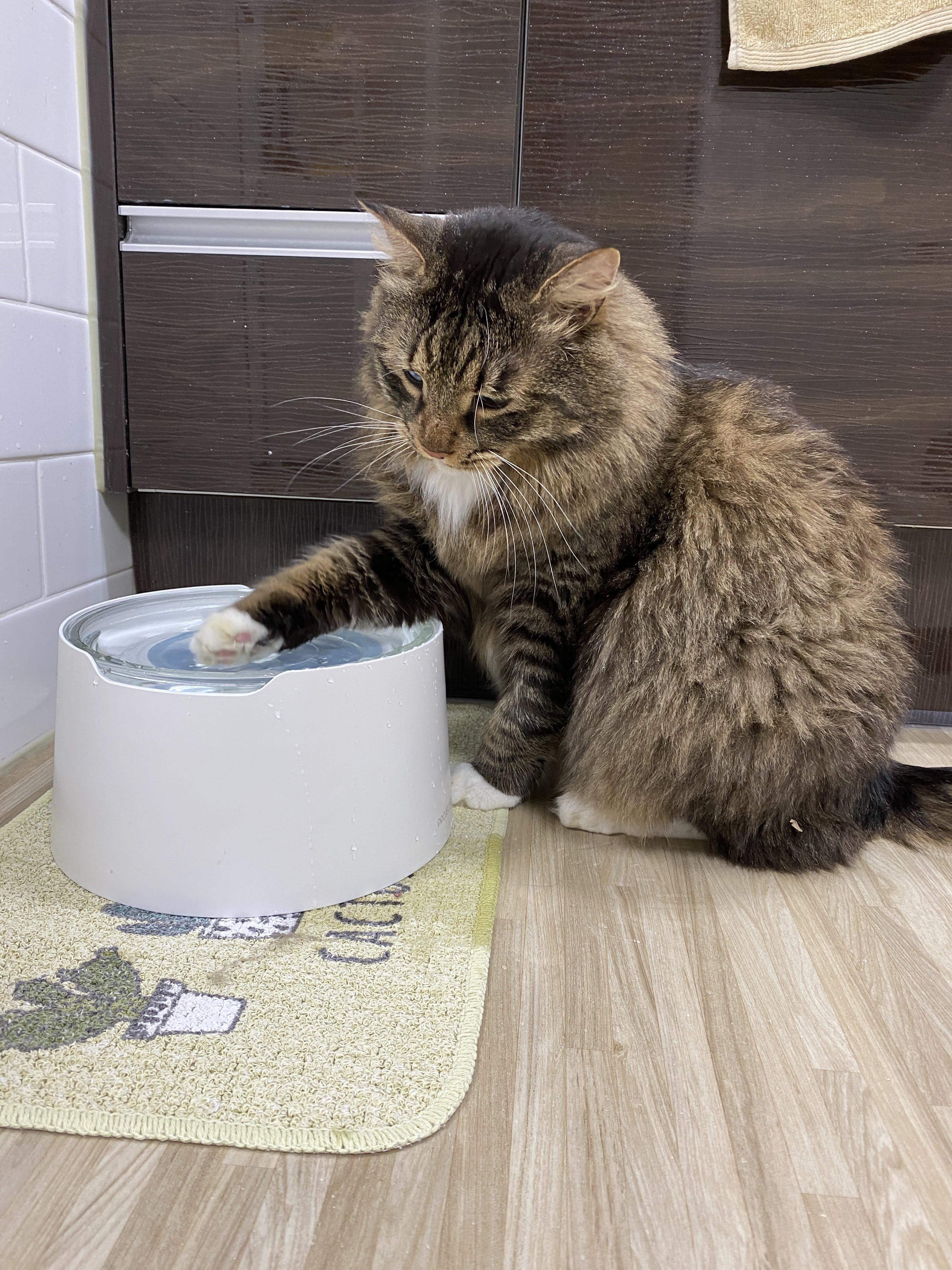 조심스레 물그릇 앞에 자리를 잡고 주변을 한번 의식해 준다. 우리 고양이는 방구석 셀럽이지만 관심은 고양이를 기쁘게 하니까.