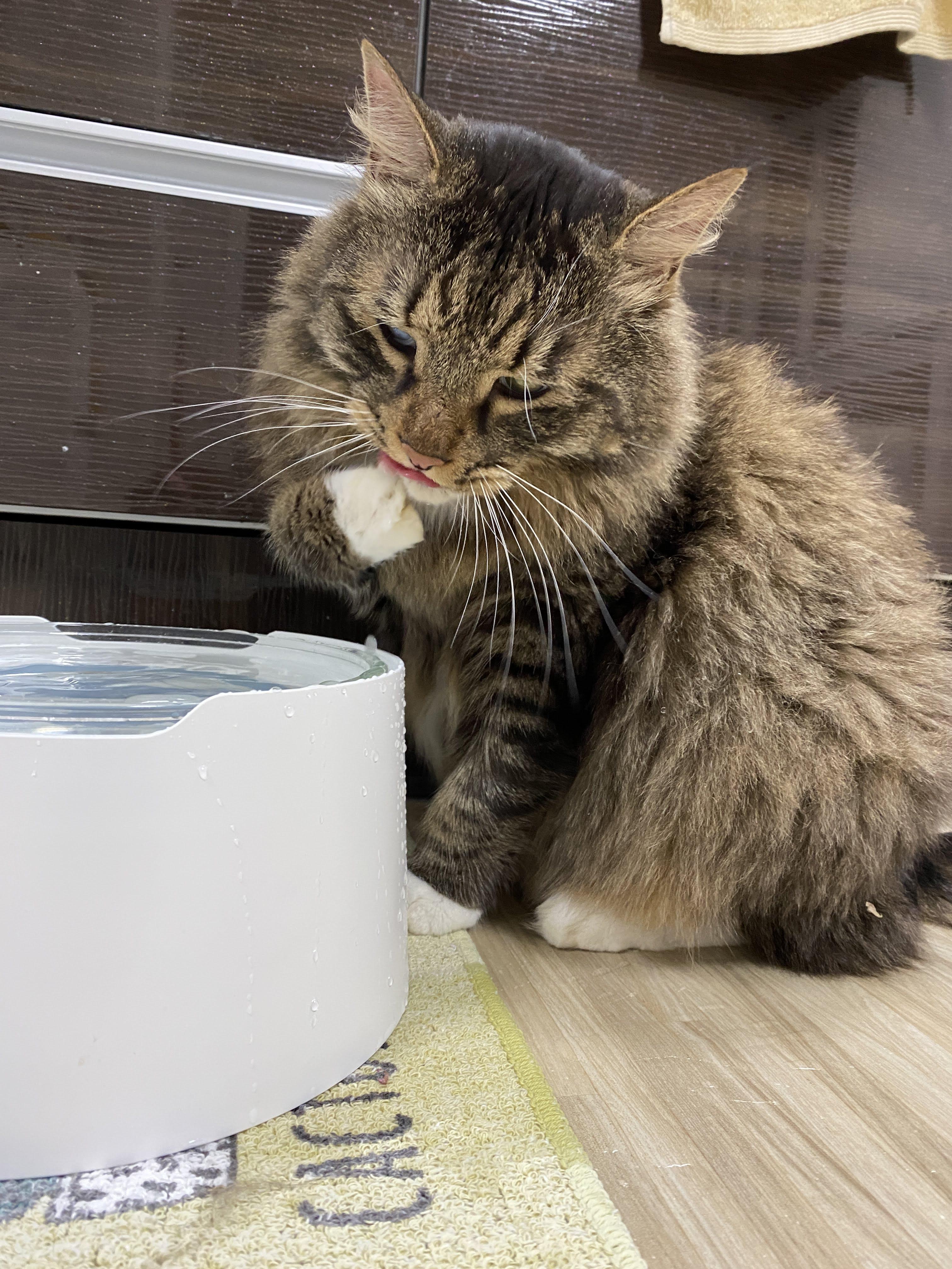발바닥 털에 물이 스며서 방울지면 그걸 천천히 입으로 가져와서 할짝이며 마신다.