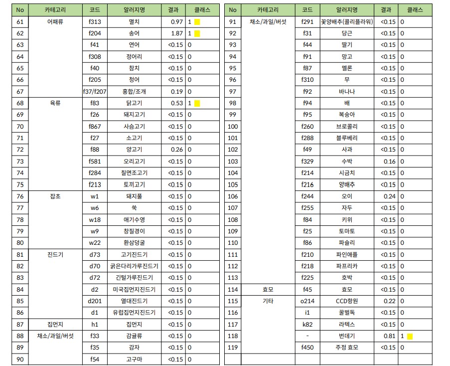 1등급 알러지 요소로는 귀리, 말라세시아(두피에서 비듬 먹고 사는 곰팡이균이라고 한다), 알터나리아(식물에서 주로 발견되는 곰팡이균이라고 한다), 번데기, 멸치, 송어, 닭고기, 우유
