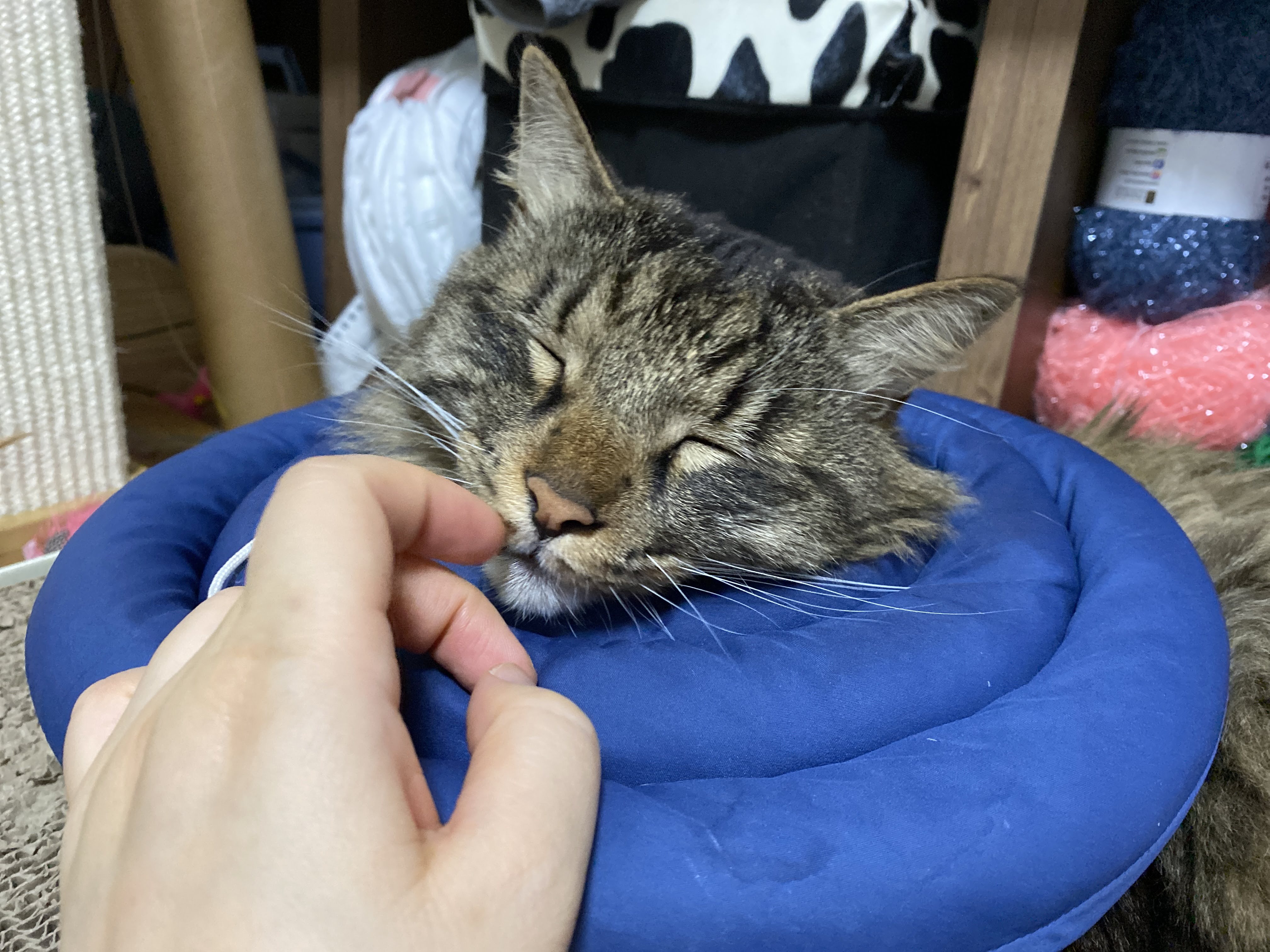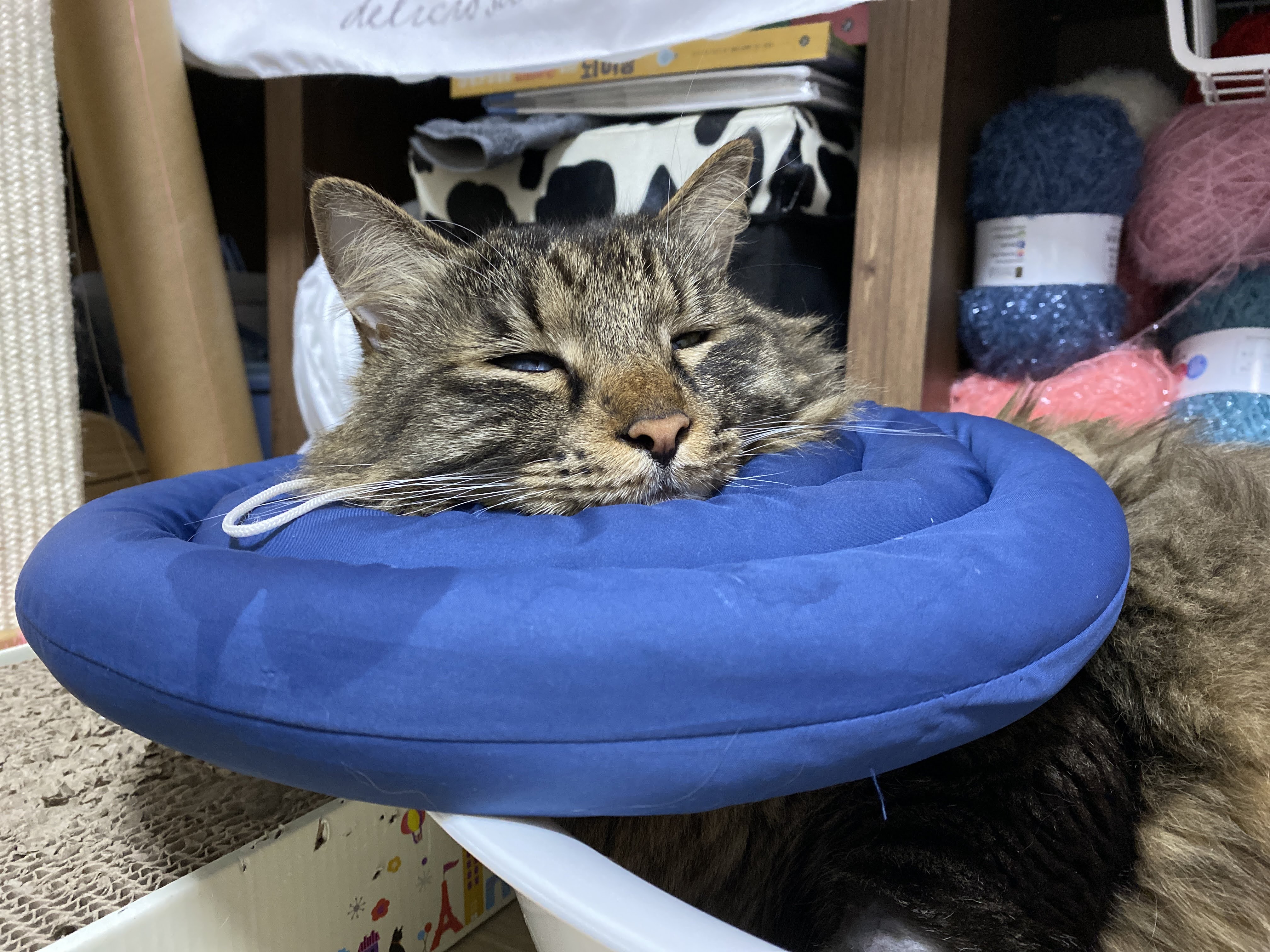 하루에 한번은 벗겨서 사냥 놀이도 하고, 털도 빗겨 주는데 잠깐의 자유 시간이 끝나고 다시 카라를 씌우려고 하면 분명히 있었던 고양이가 순식간에 사라진다. 그래서 카라 들고 쫓아다니는 게 집사의 일.