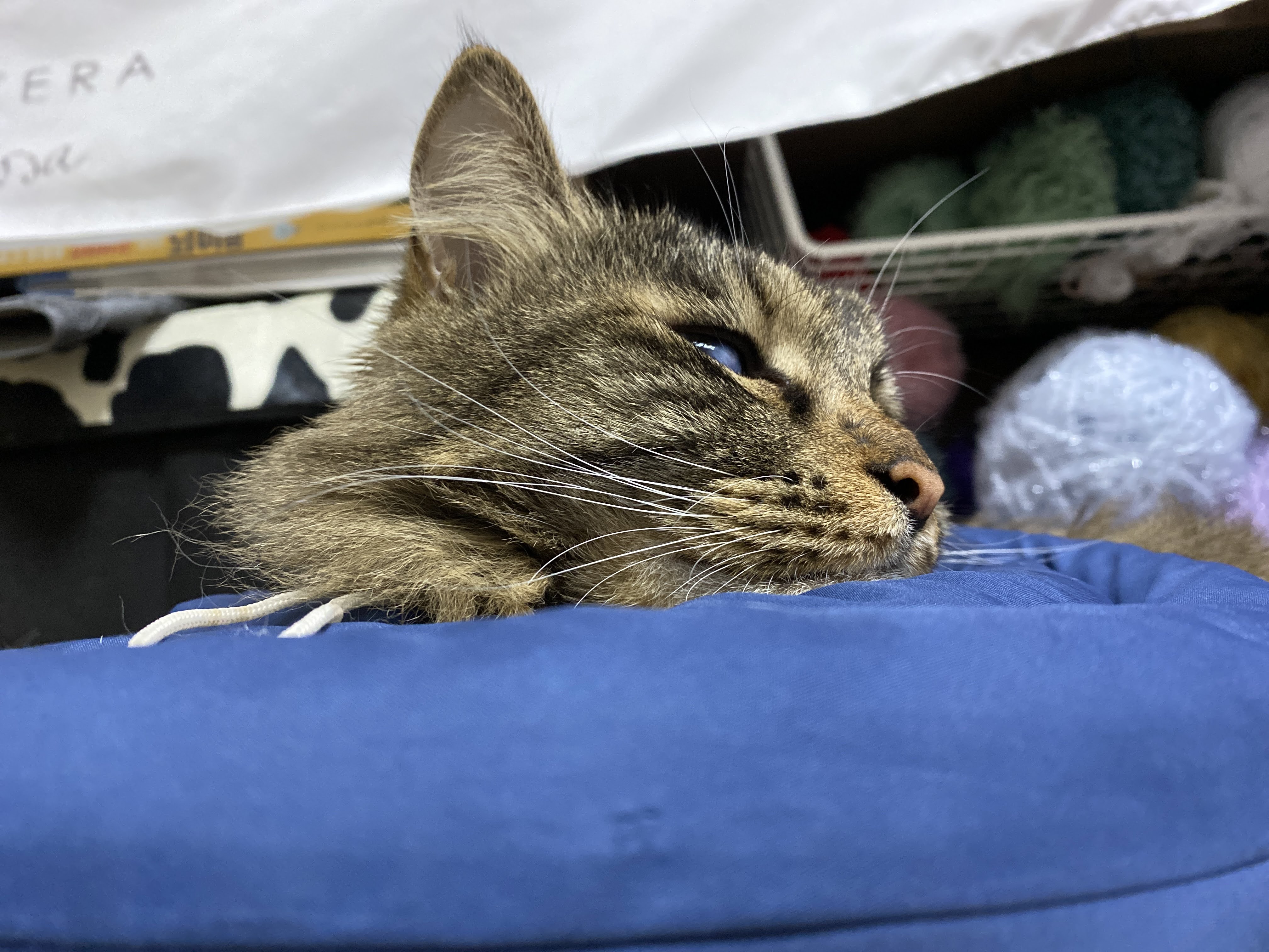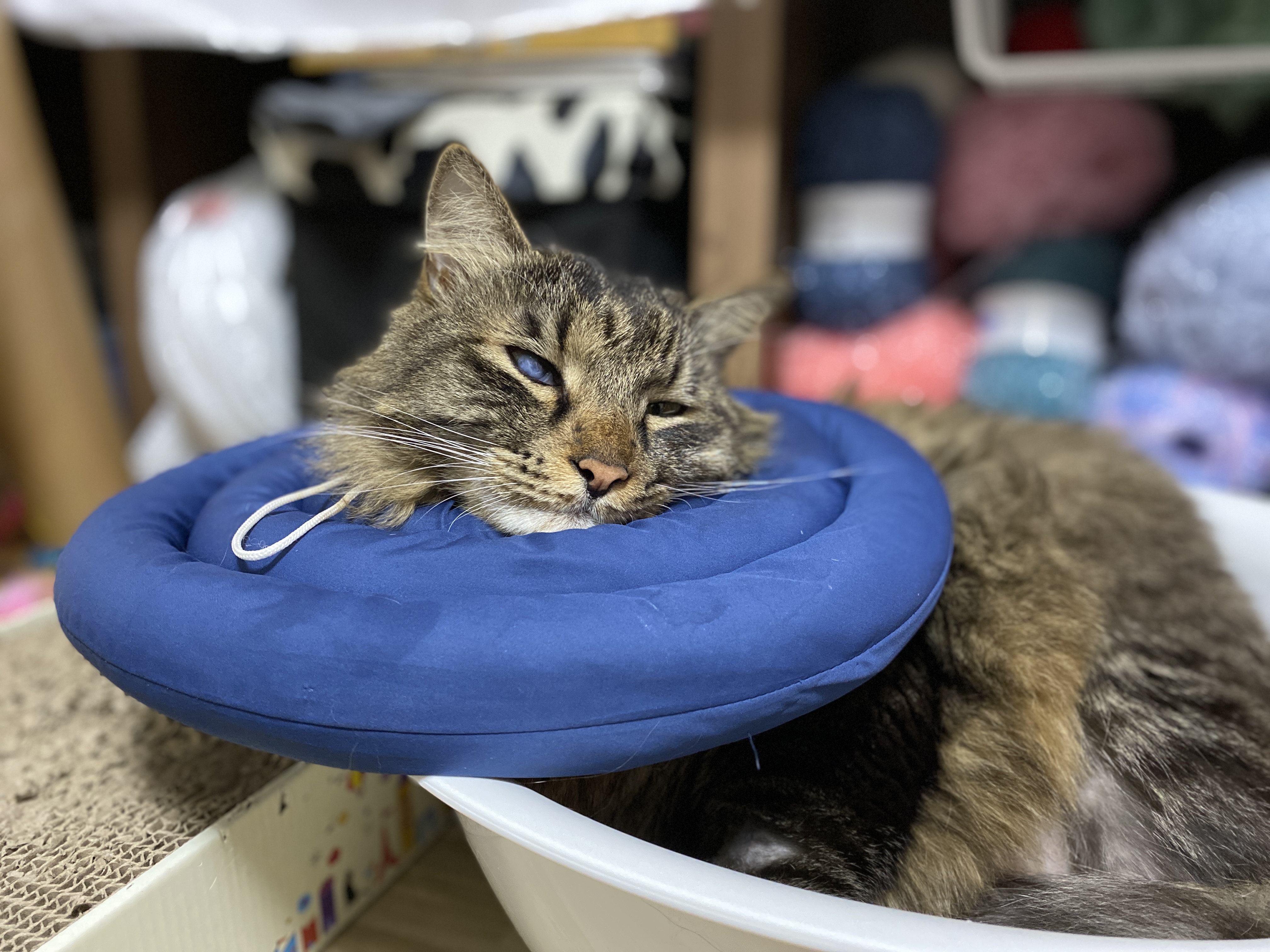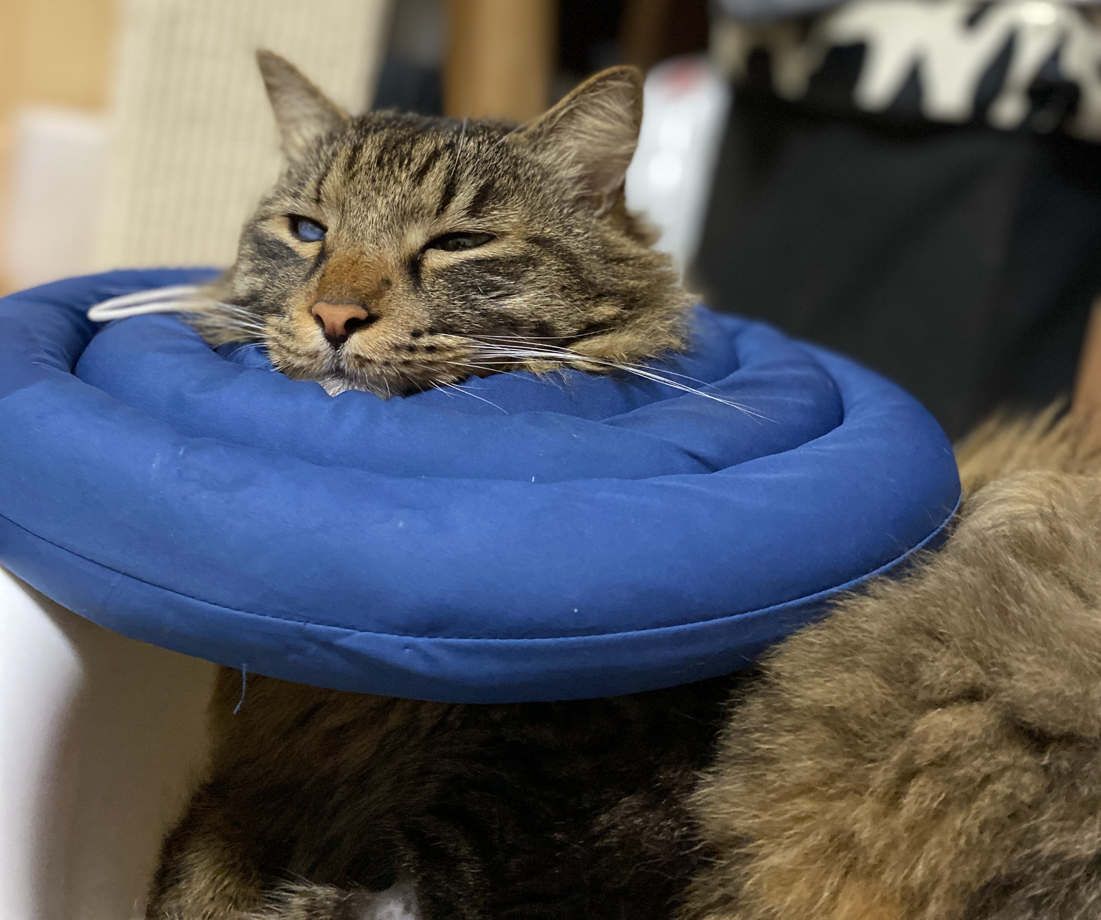 아무리 편안한 넥카라를 씌워 줘도 아무것도 안 썼을 때에 비할 수는 없어서 좀 시무룩해한다.