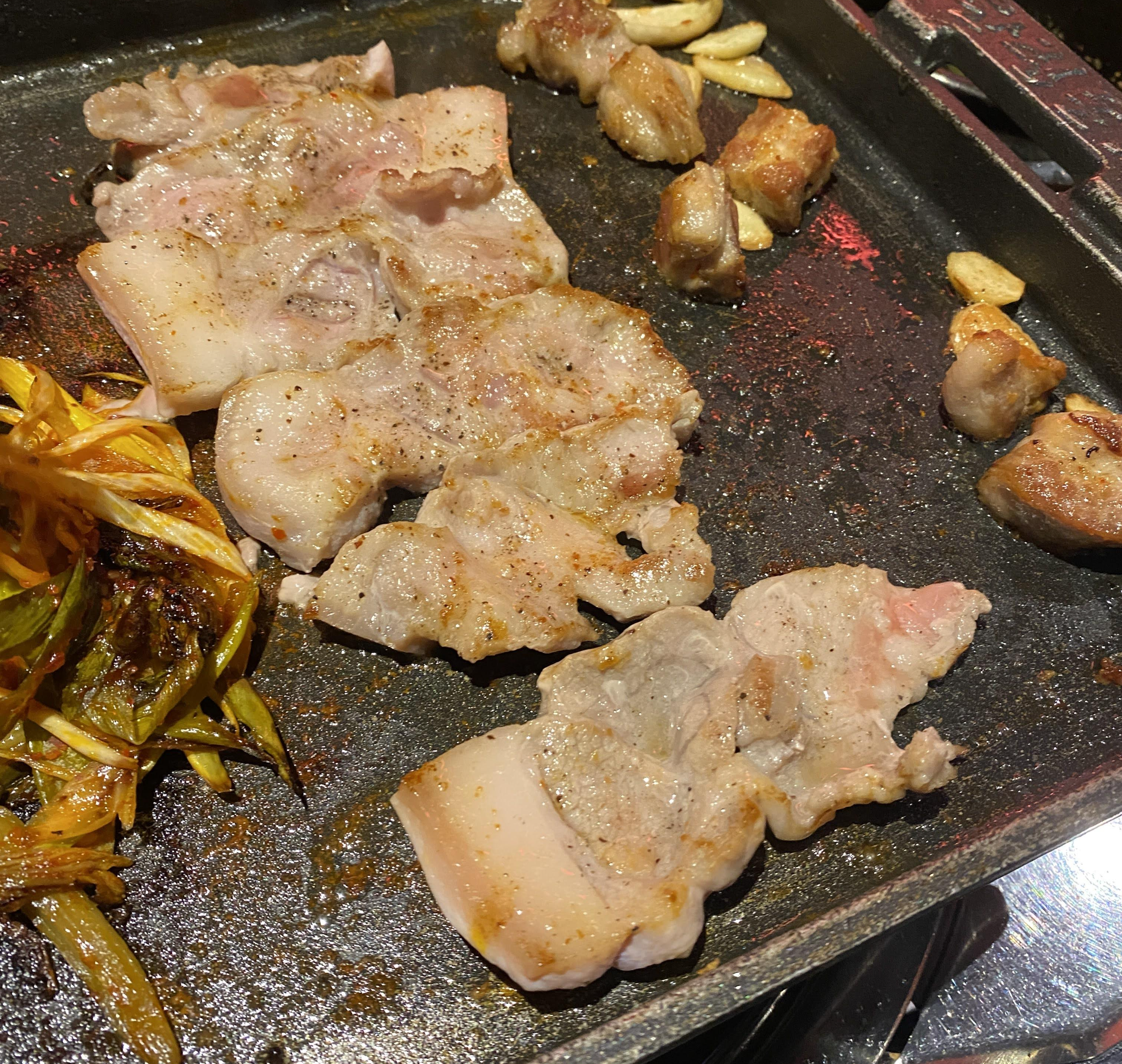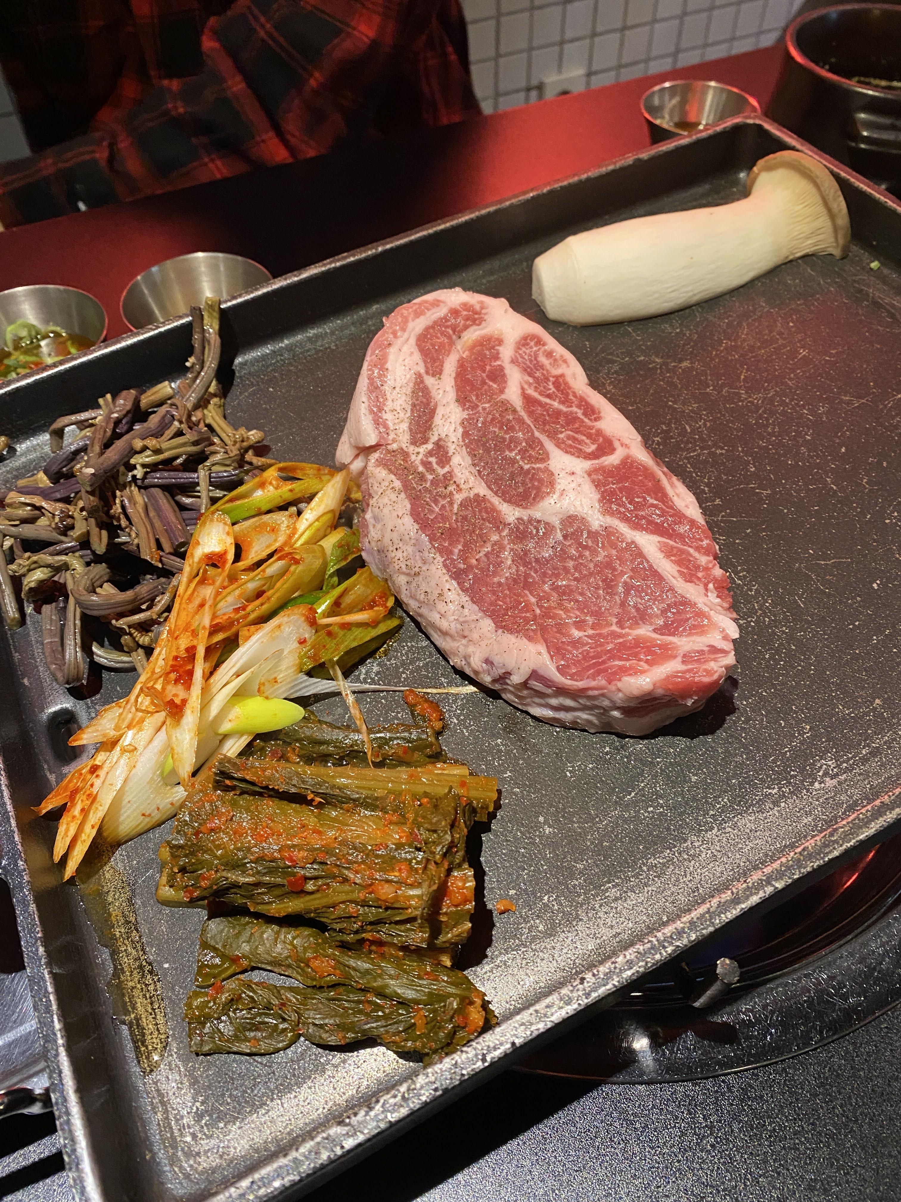 굽고 나면 일반 목살보다는 좀 더 씹을 때 저항감이 있는 고기였다. 약간 껍데기 식감 비슷하기도 했다.