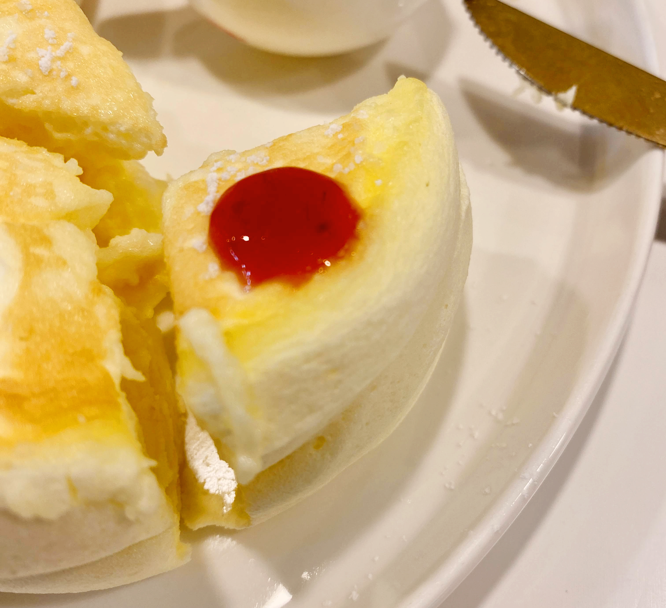 쌀 수플레 팬케이크는 굽는데 25분 정도 걸린다고 안내받았다. 이야기를 나누다 보니 금방 또 나와서 날렵하게 받아온 내 쌀 수플레 팬케이크.