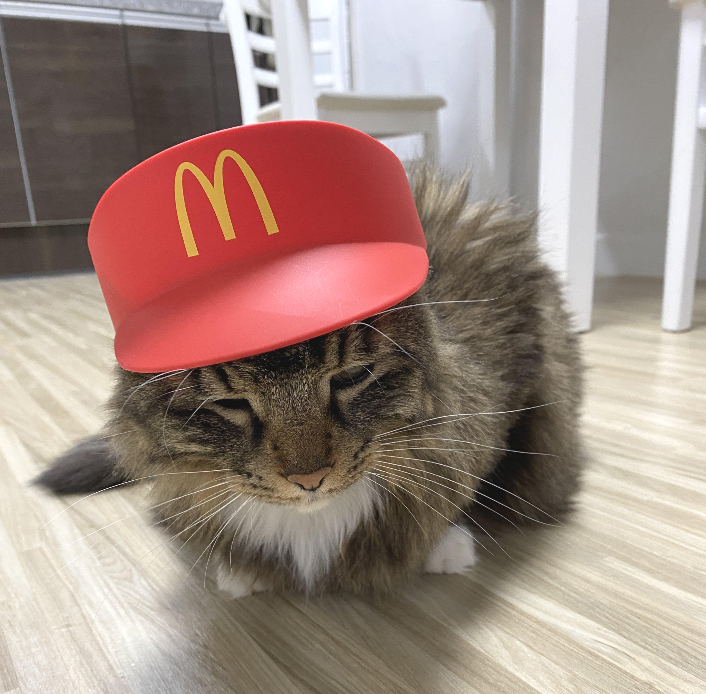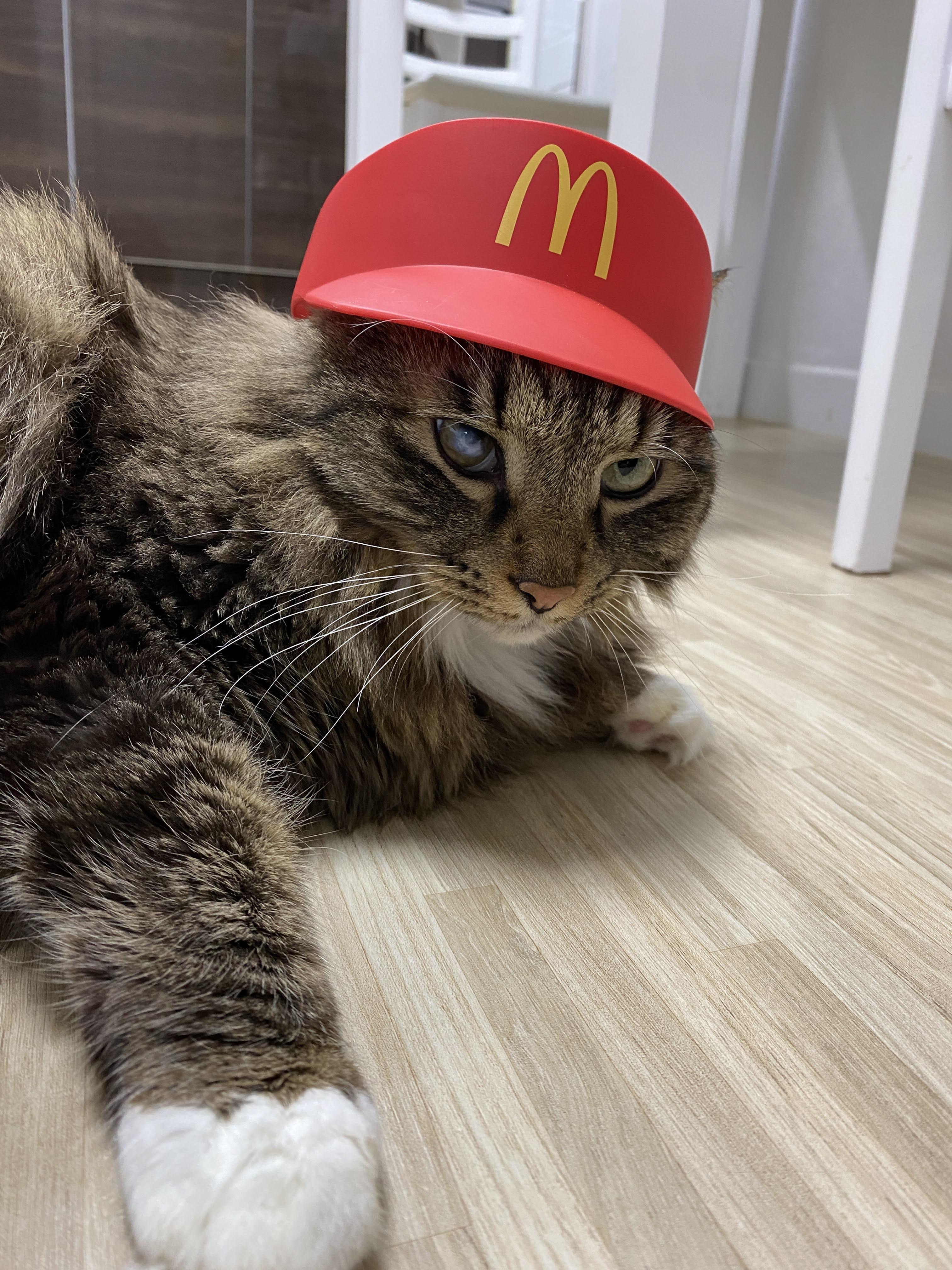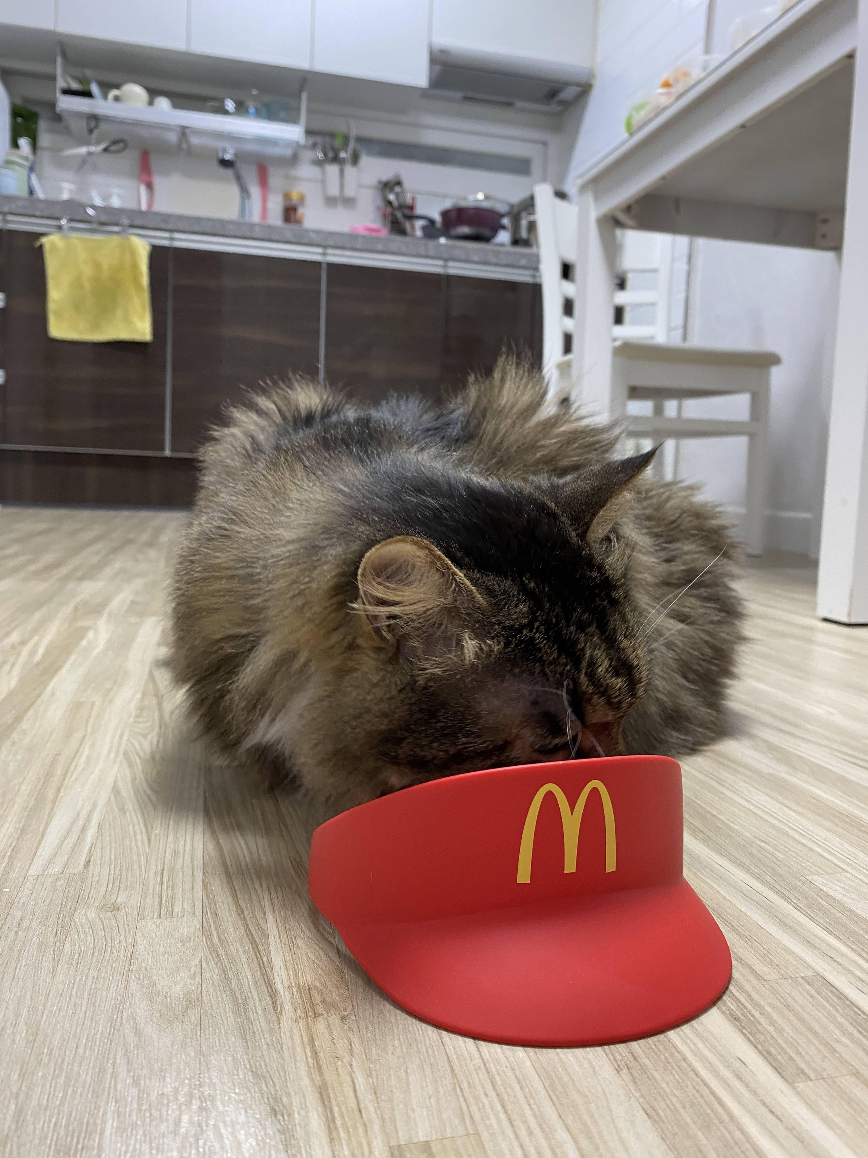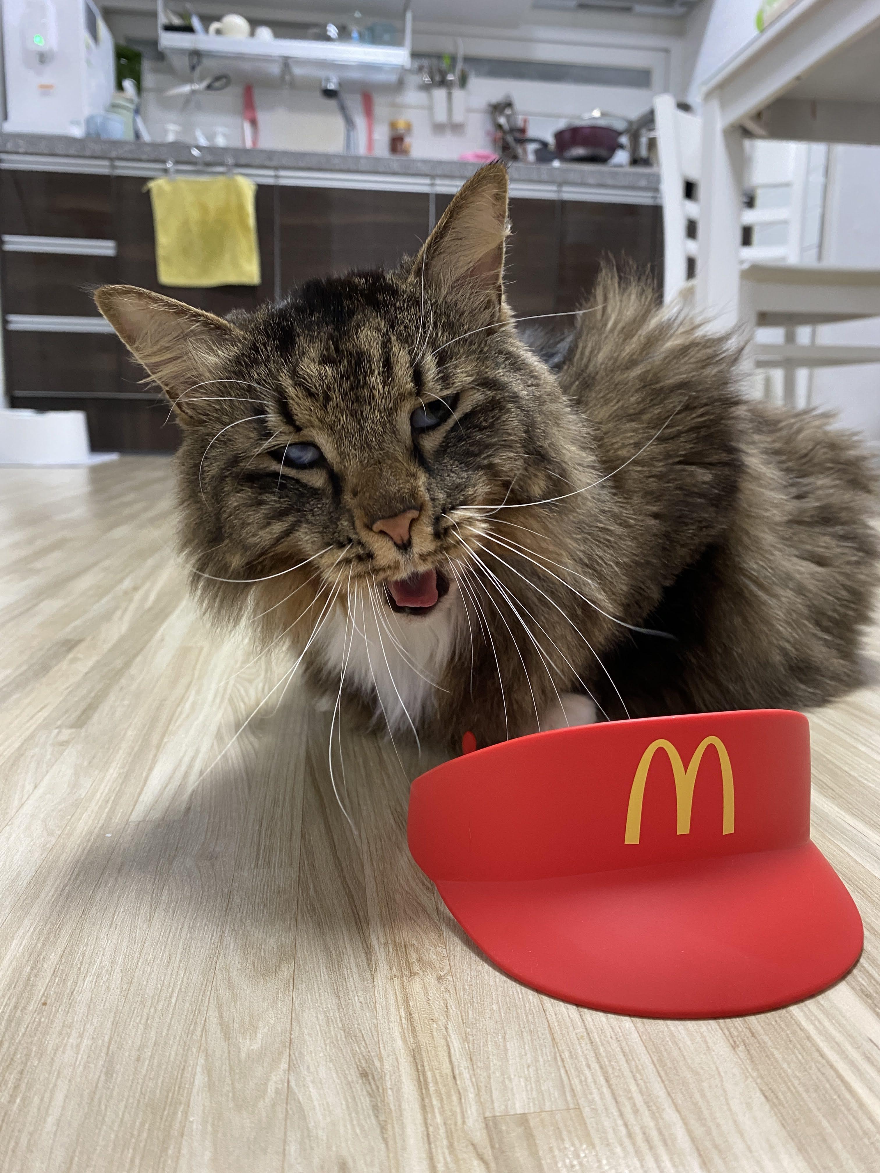 실은 맥도날드 모자다. 모자 쓰기 싫어서 얼굴 짜부라진 고양이.