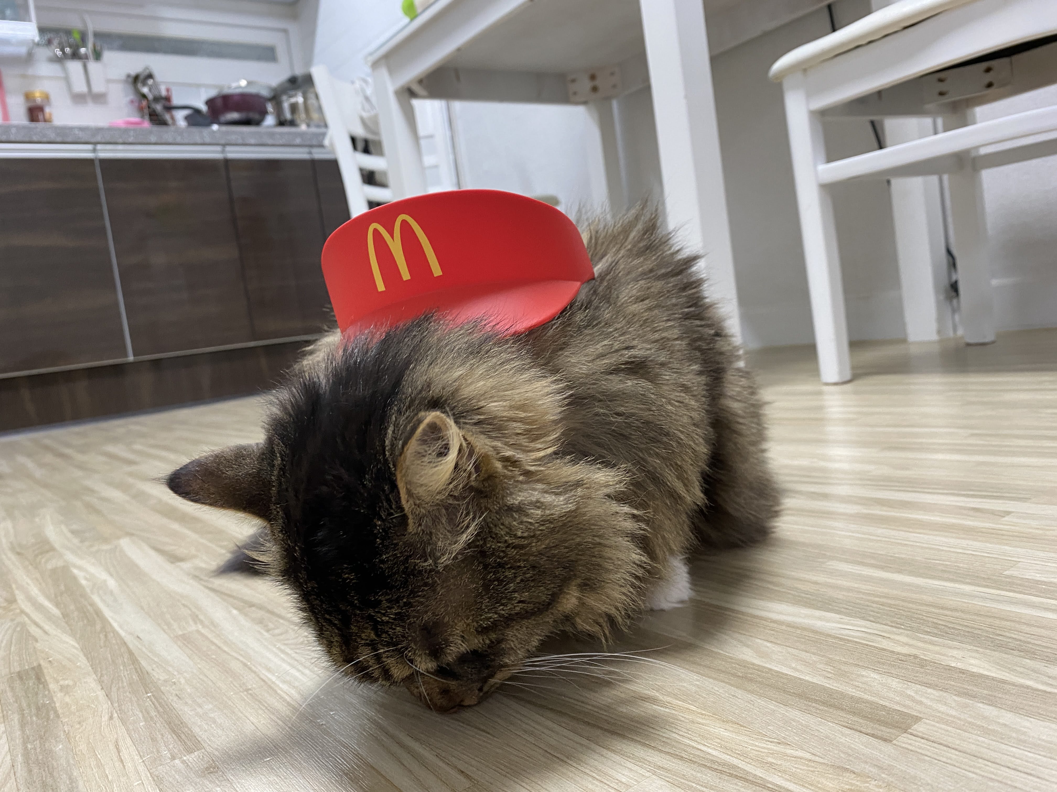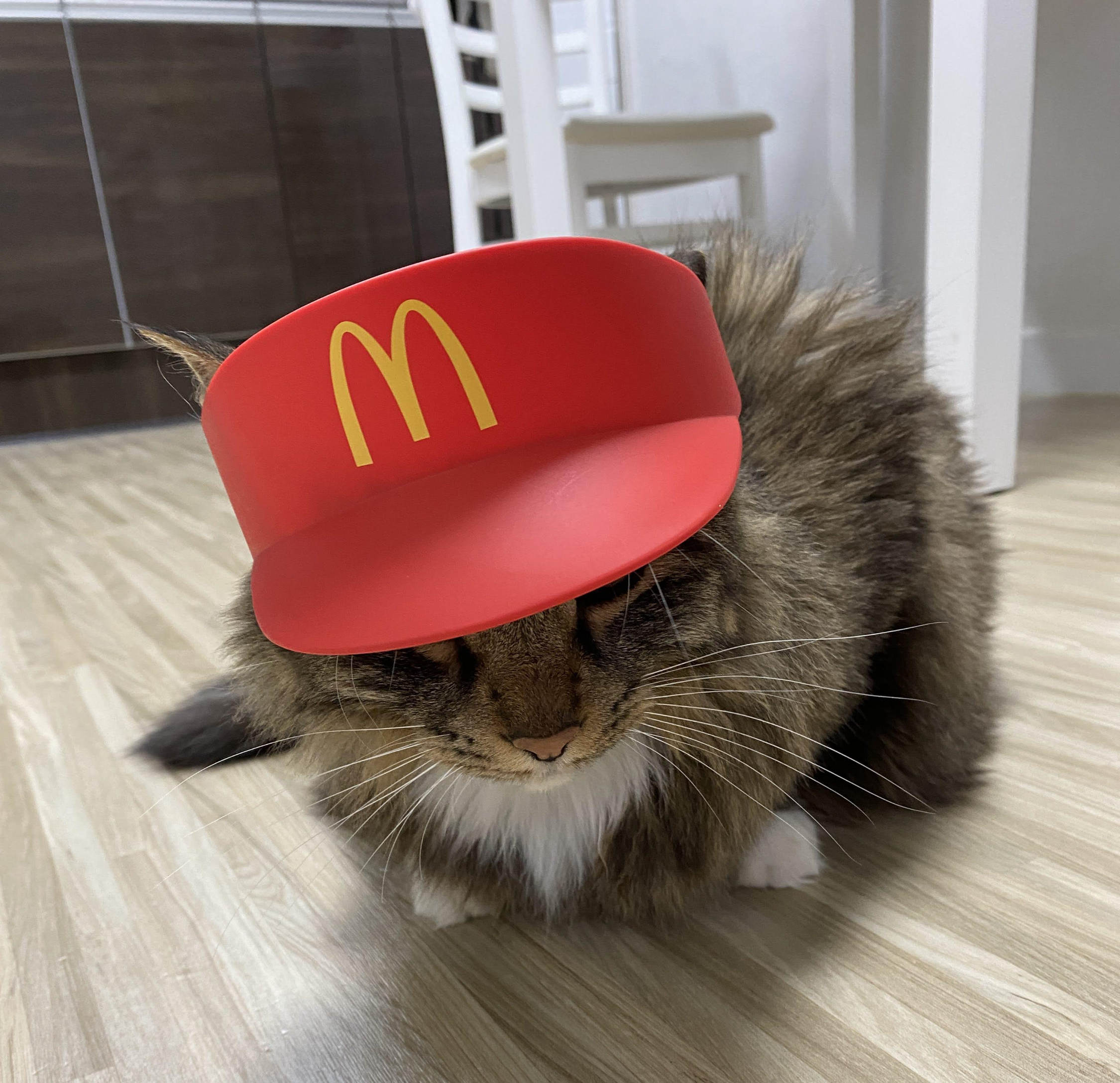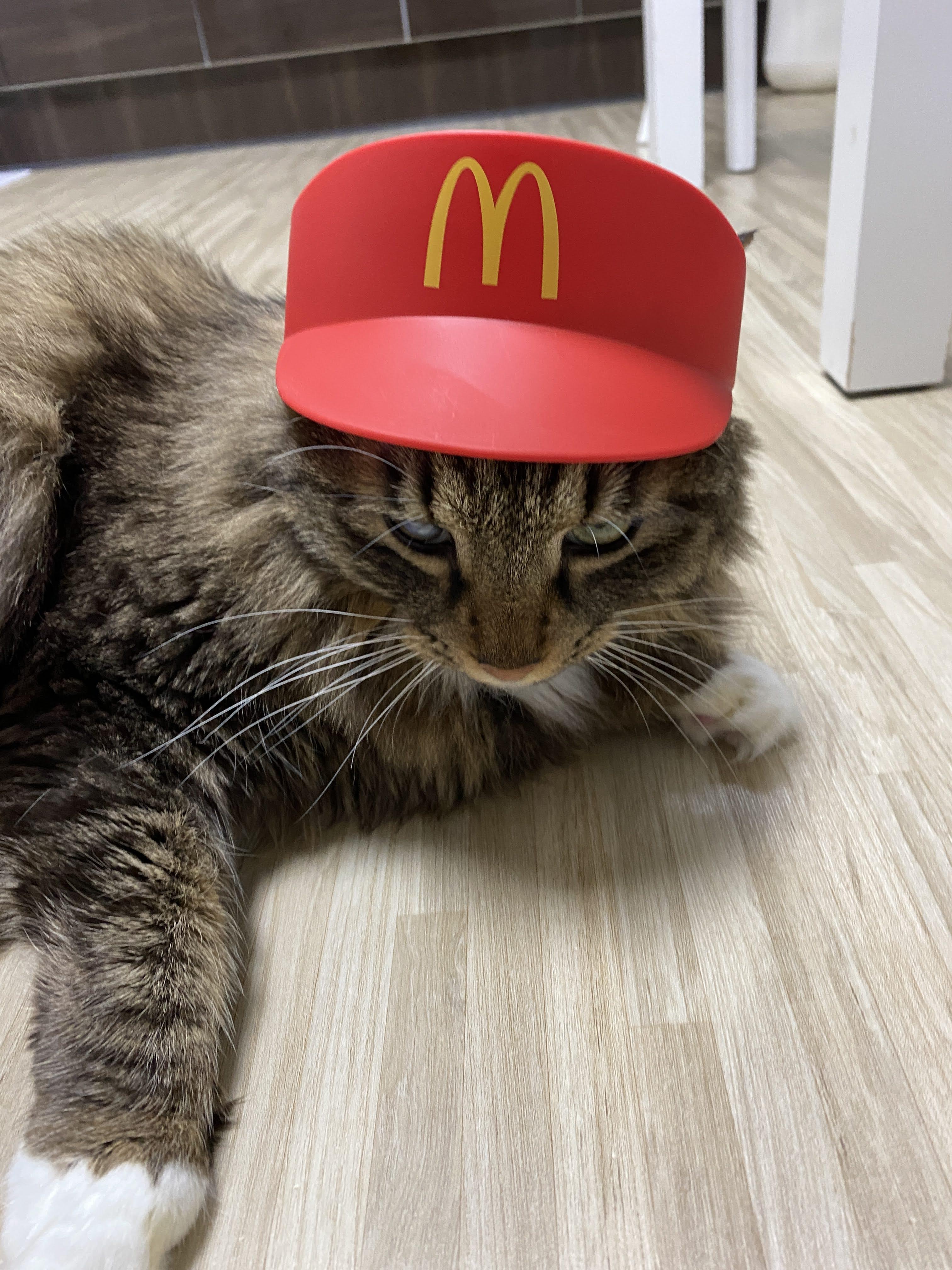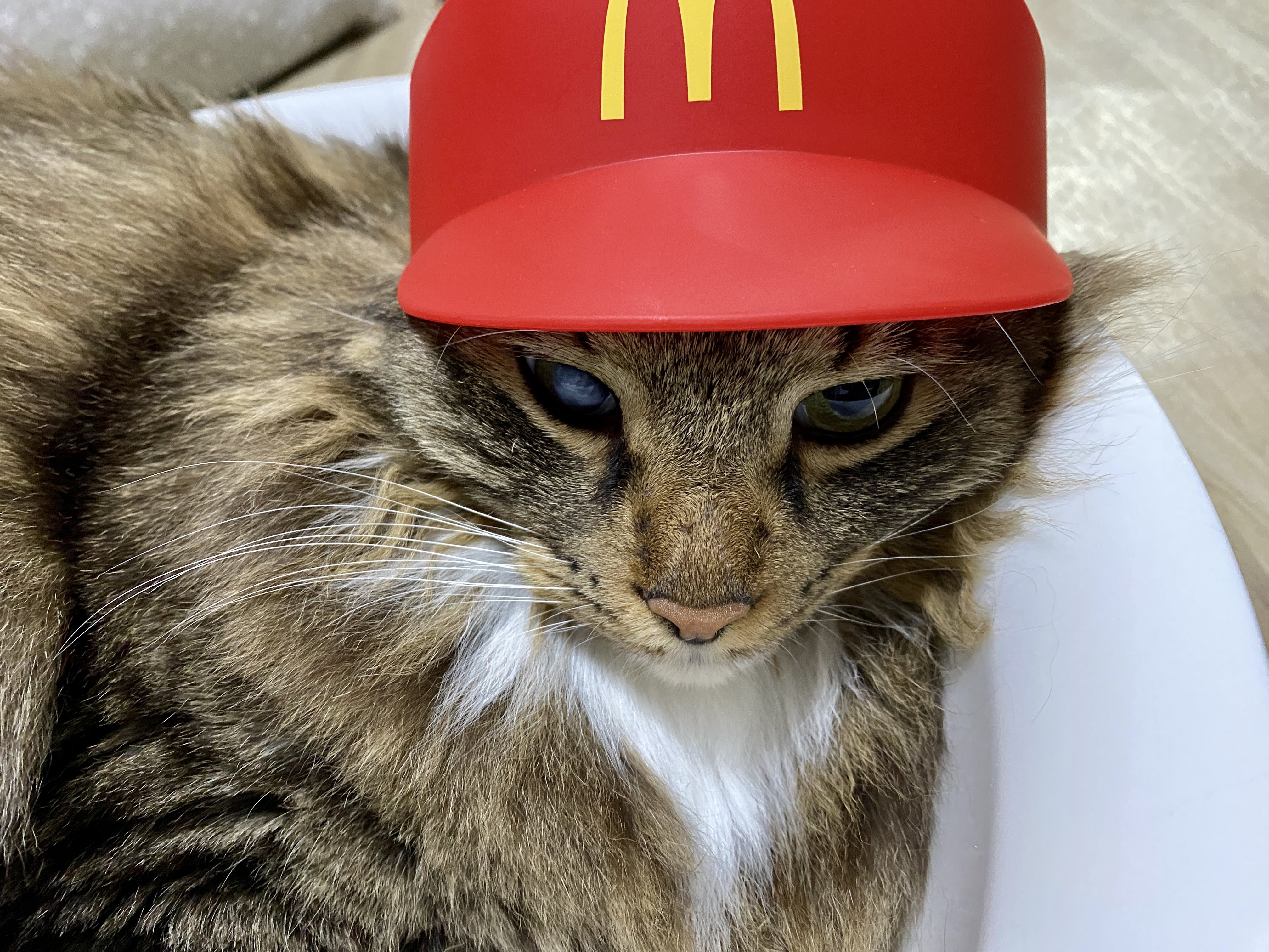 실은 맥도날드 모자다. 모자 쓰기 싫어서 얼굴 짜부라진 고양이.