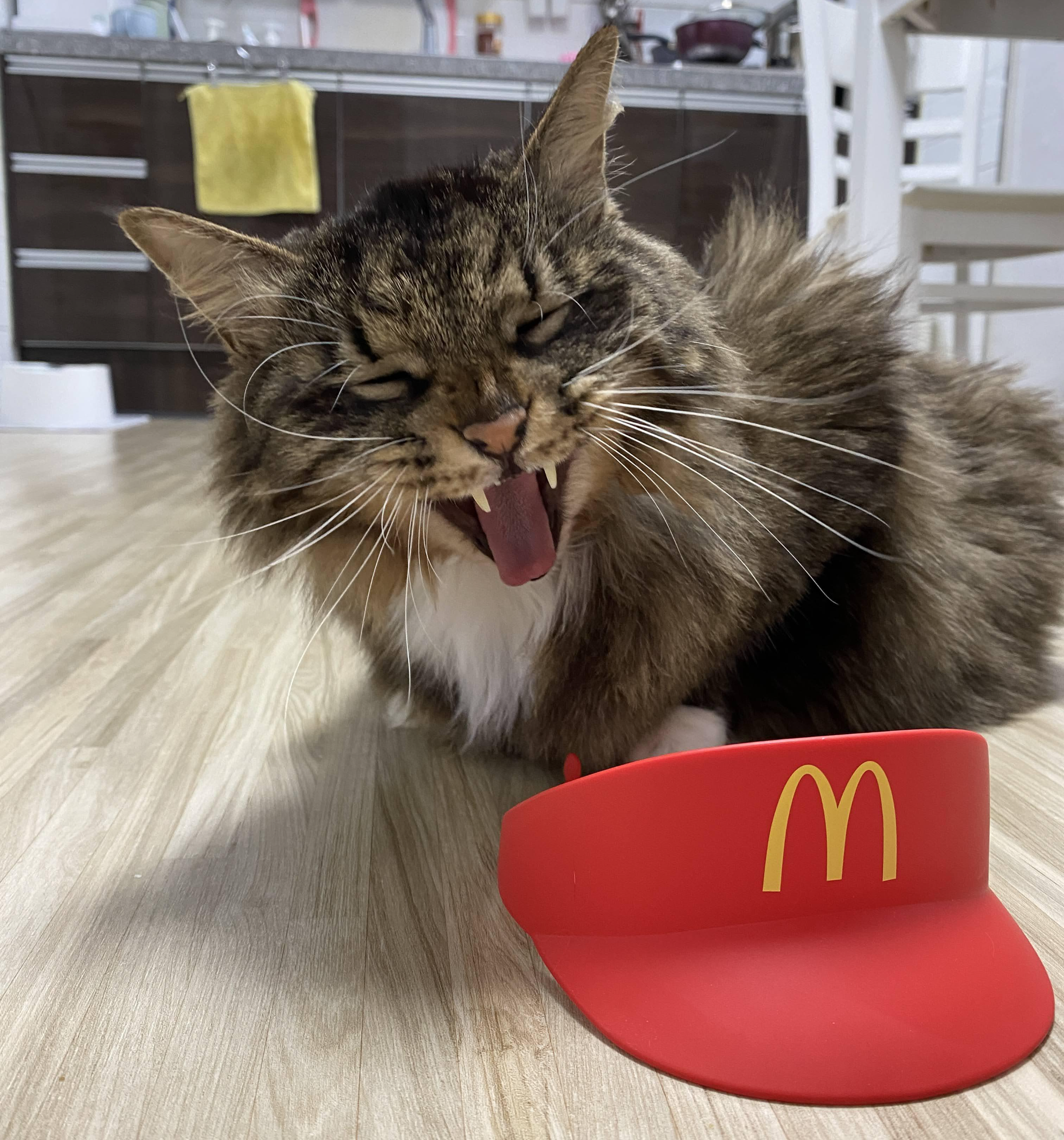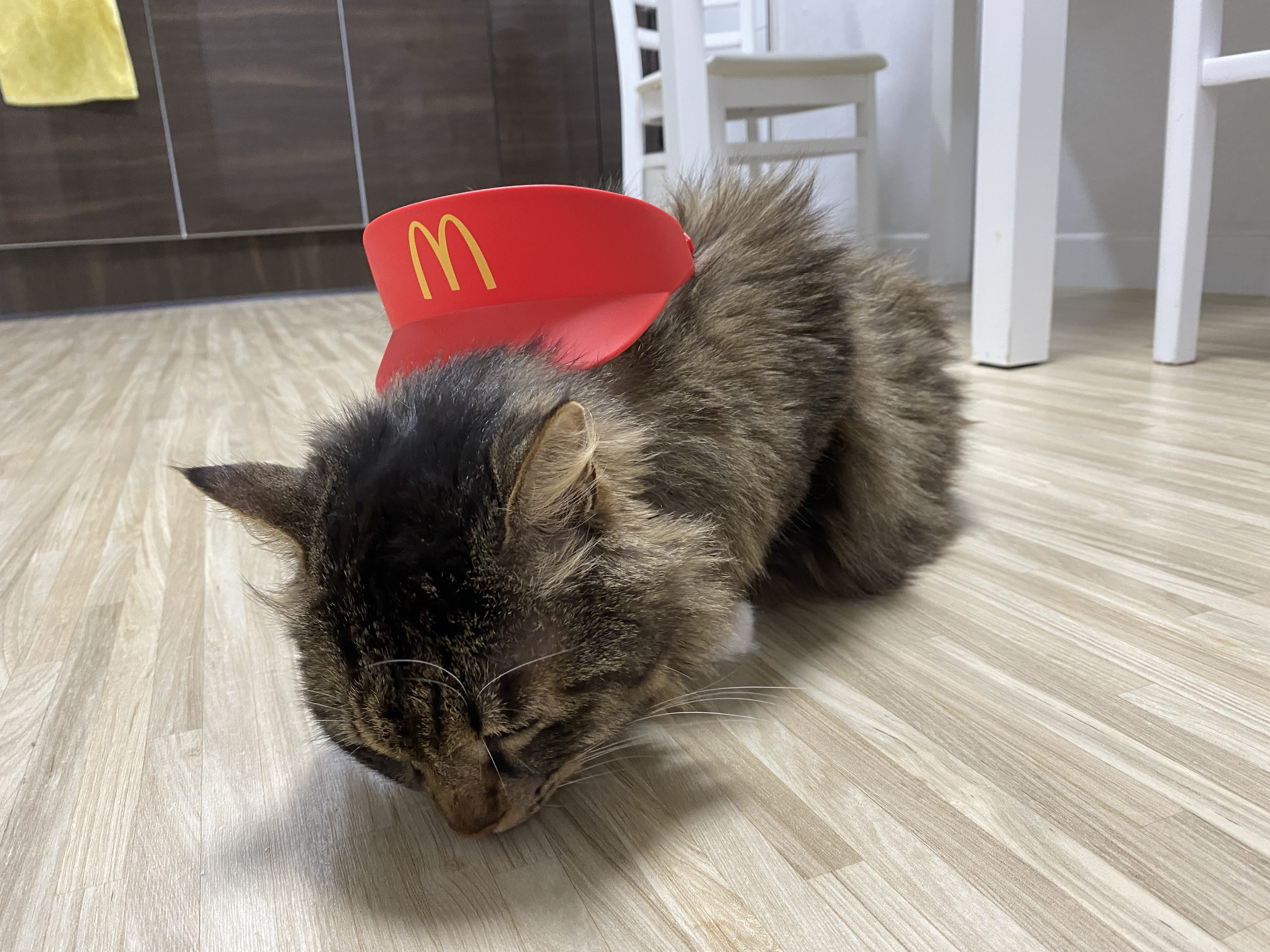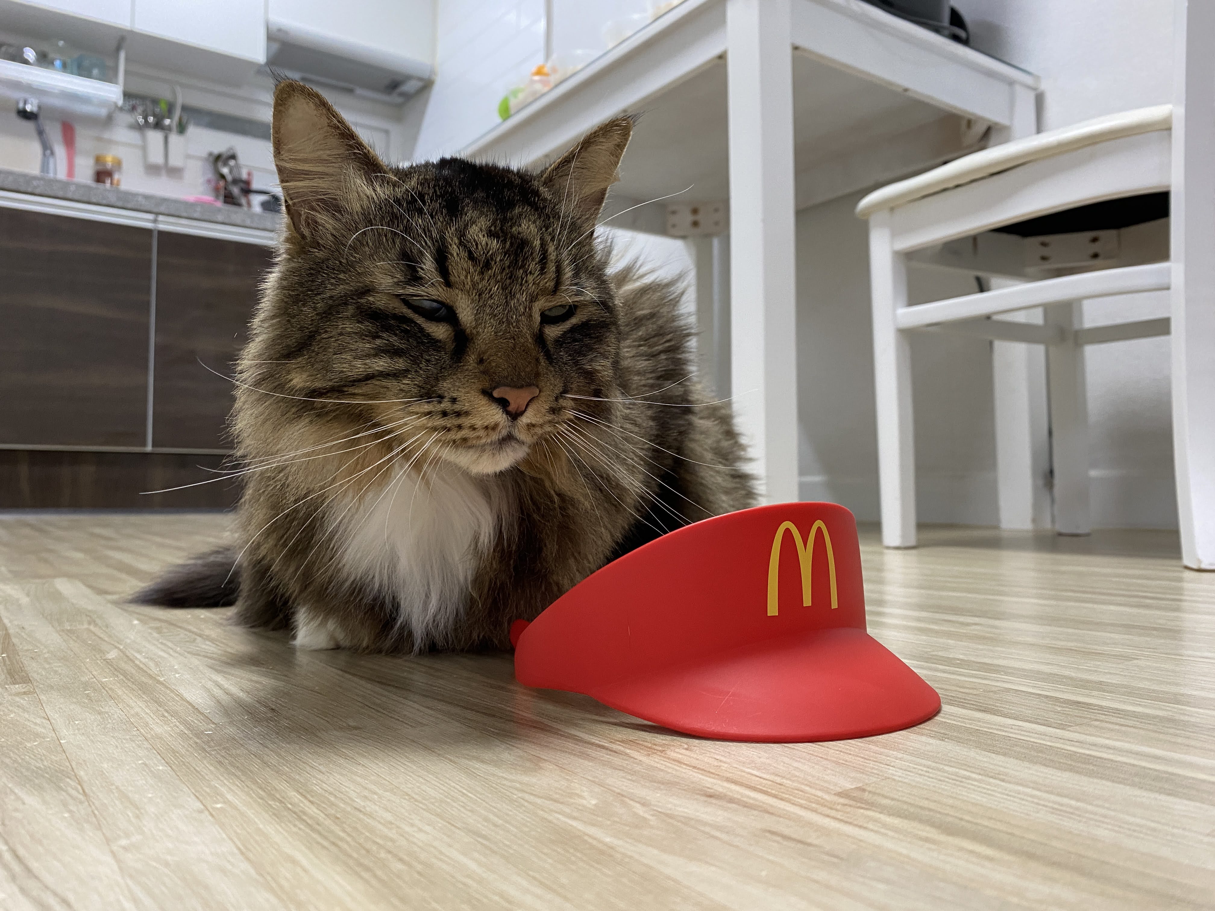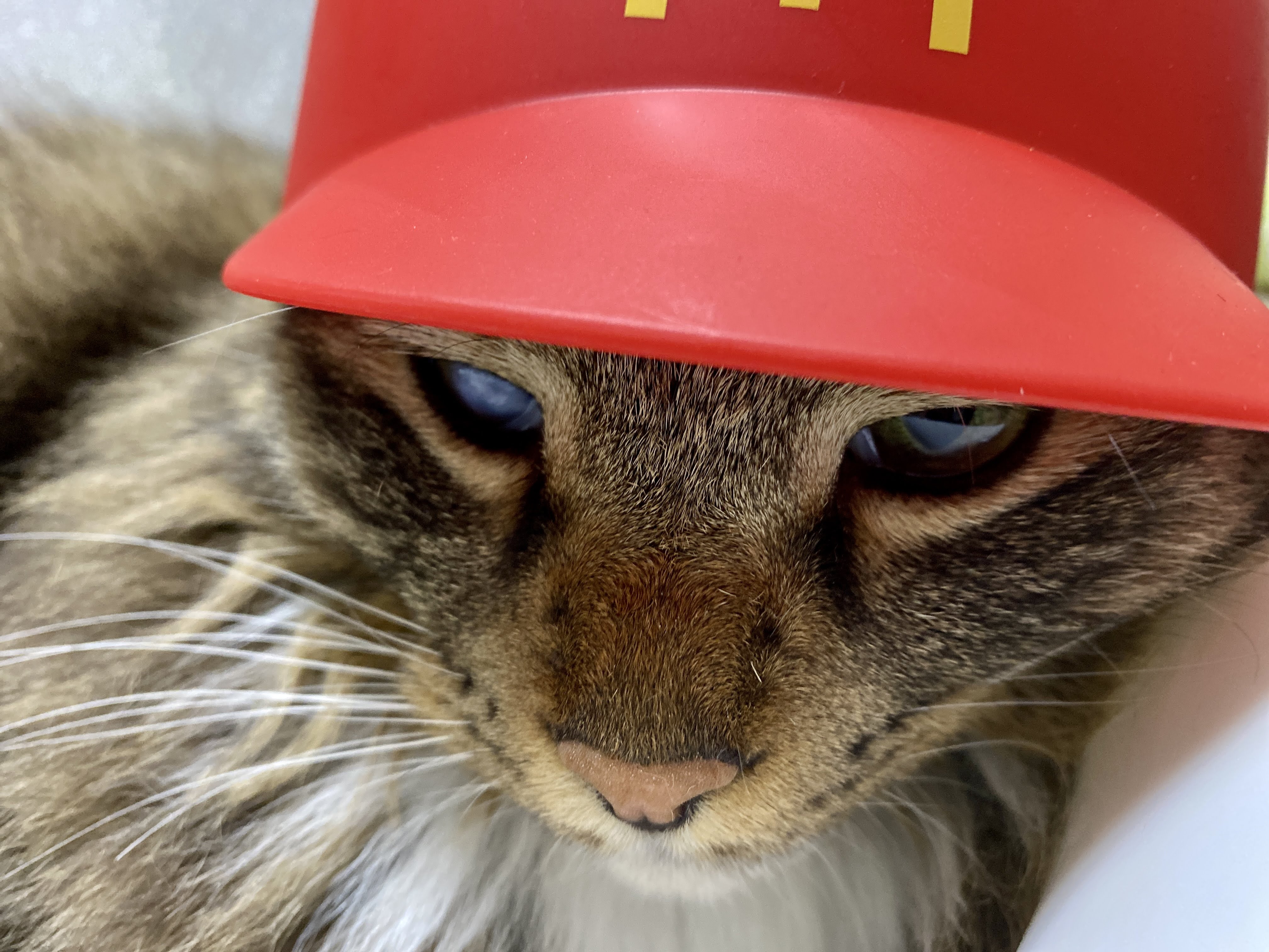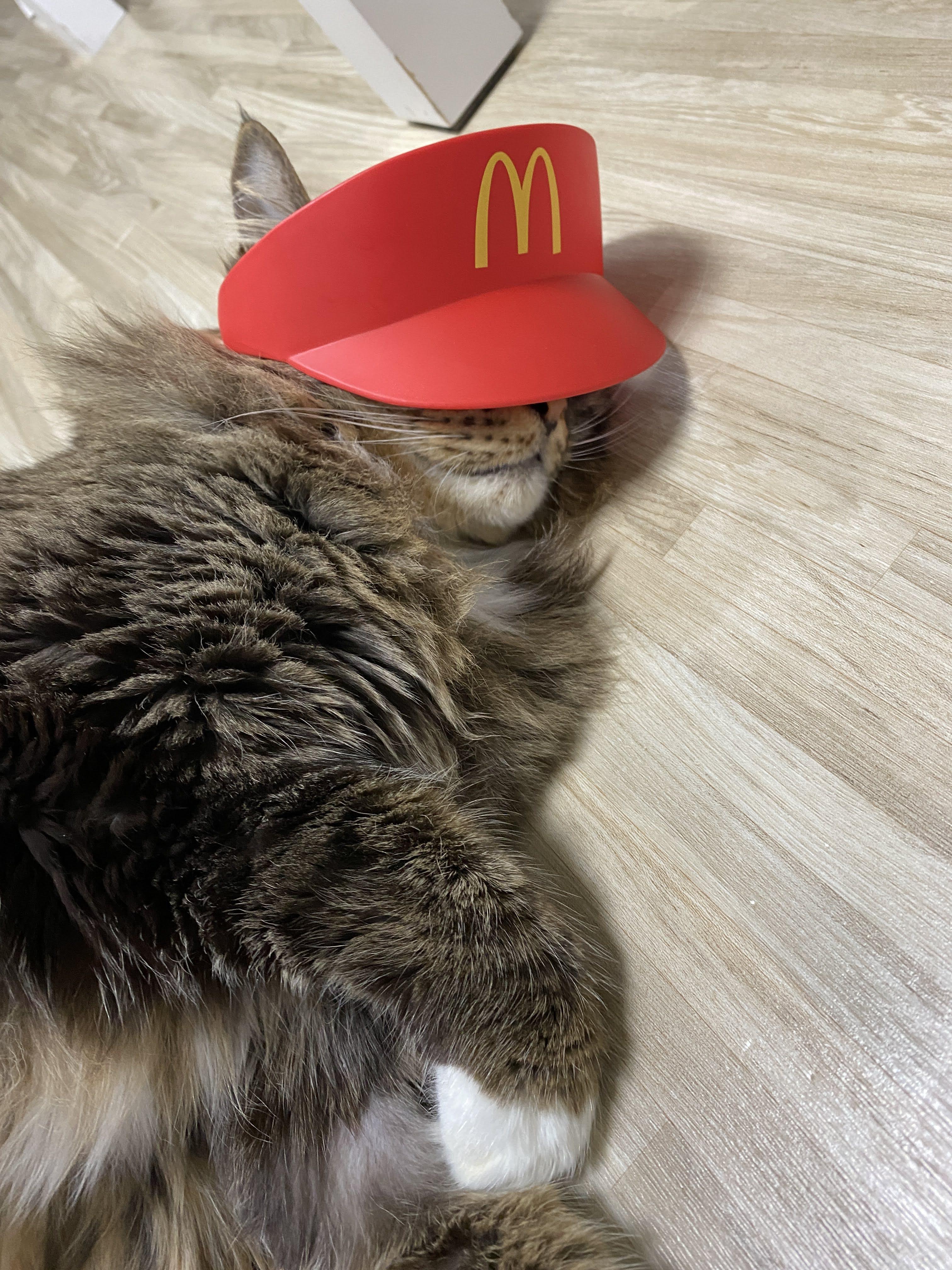 실은 맥도날드 모자다. 모자 쓰기 싫어서 얼굴 짜부라진 고양이.