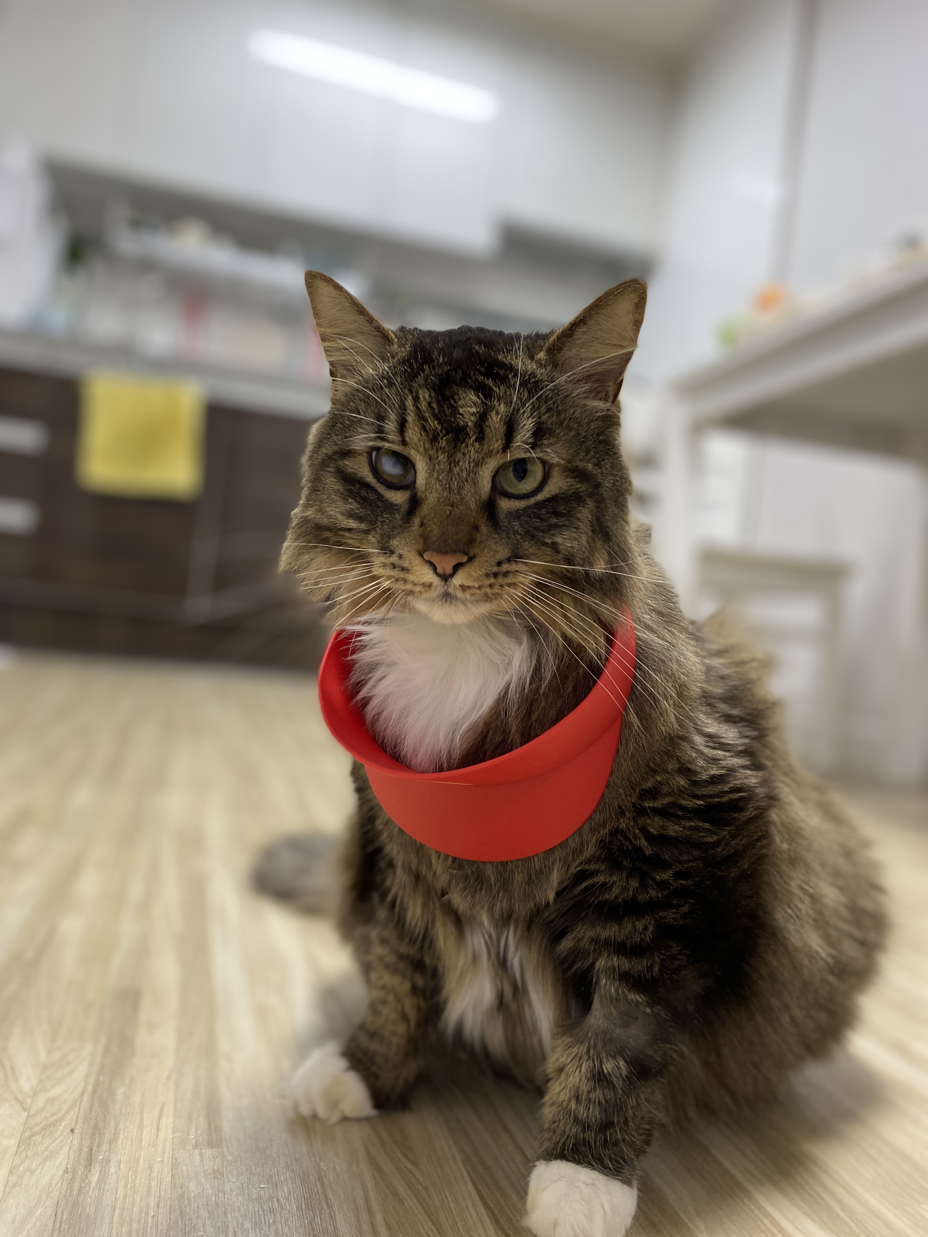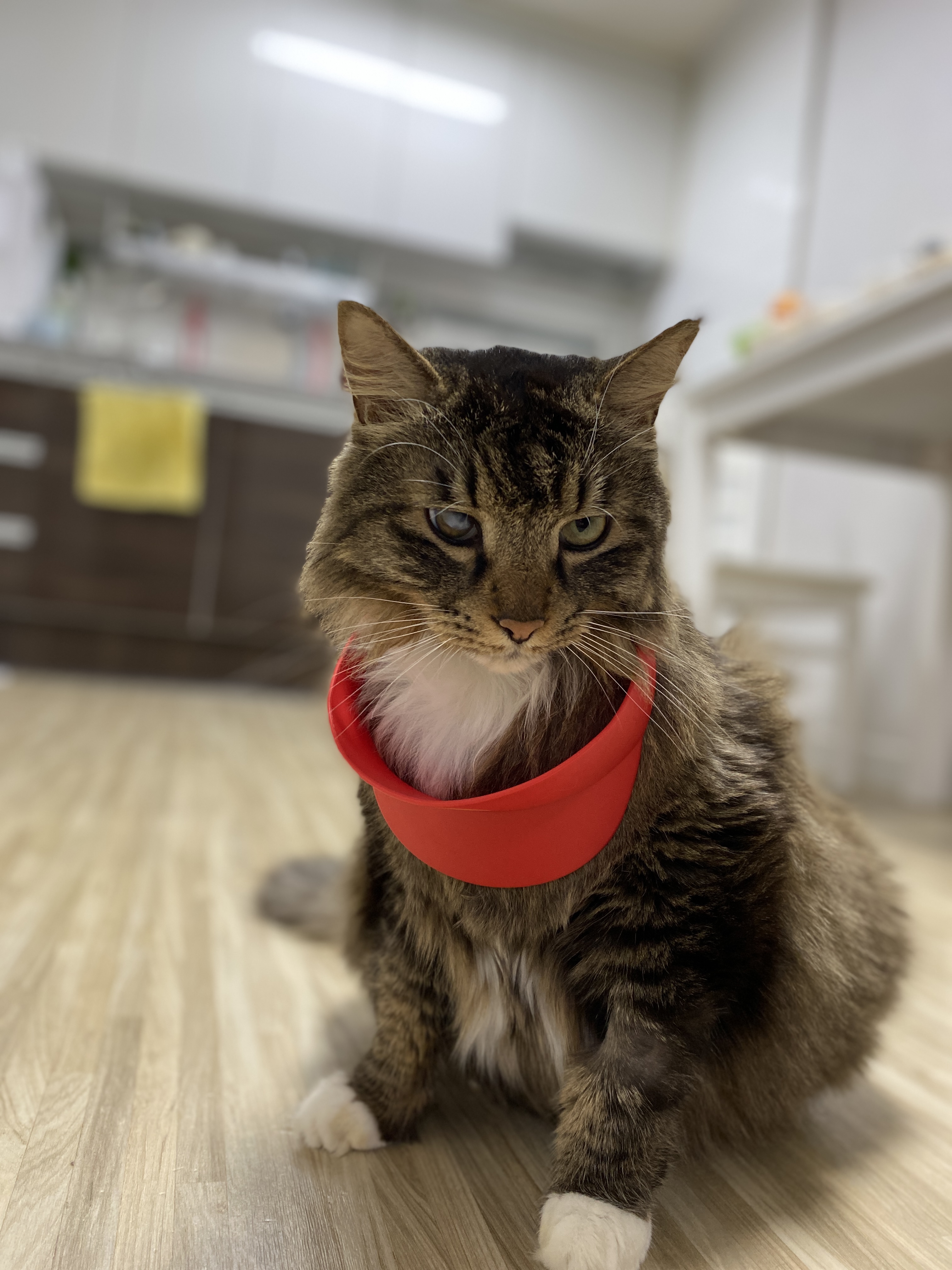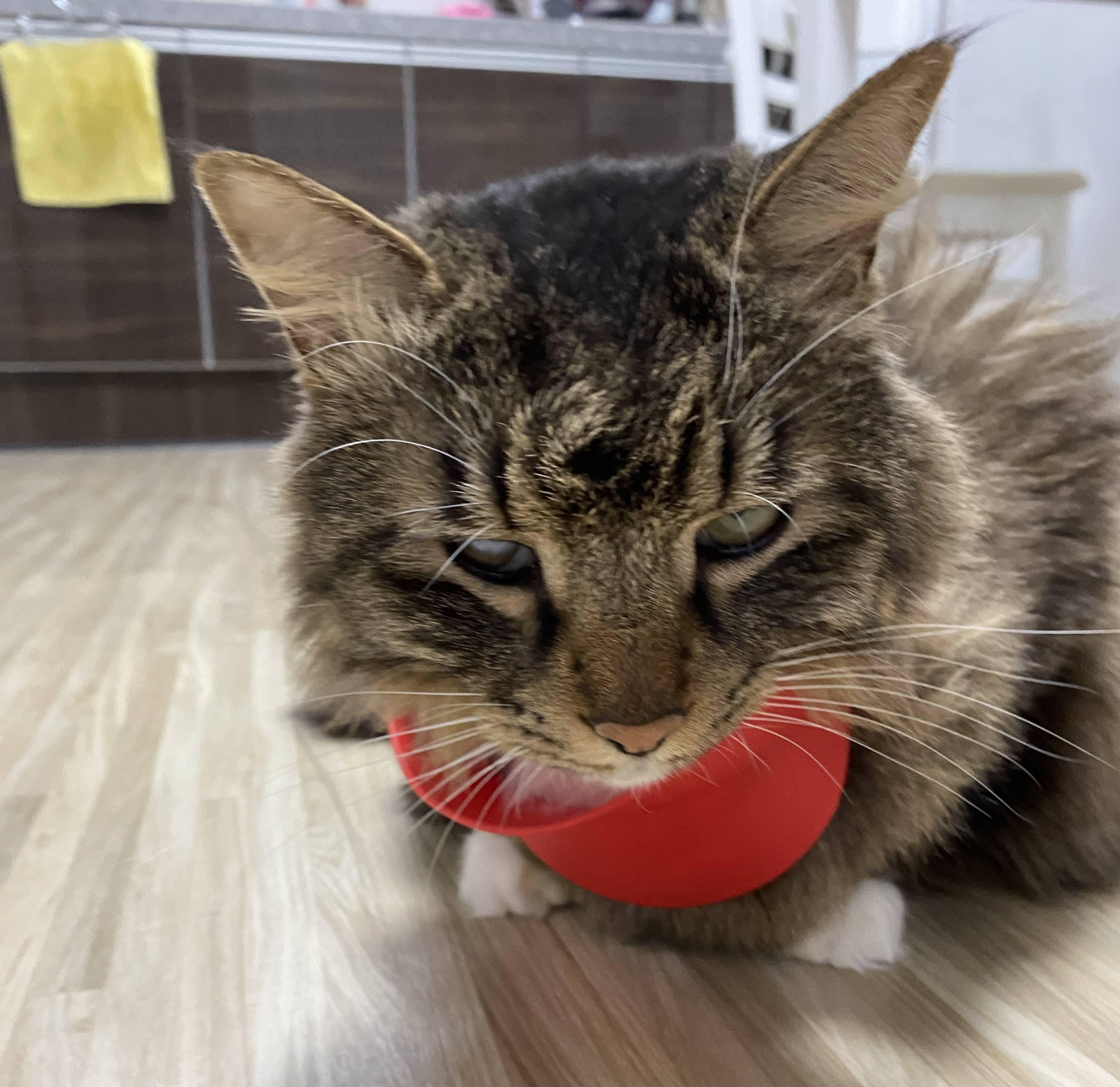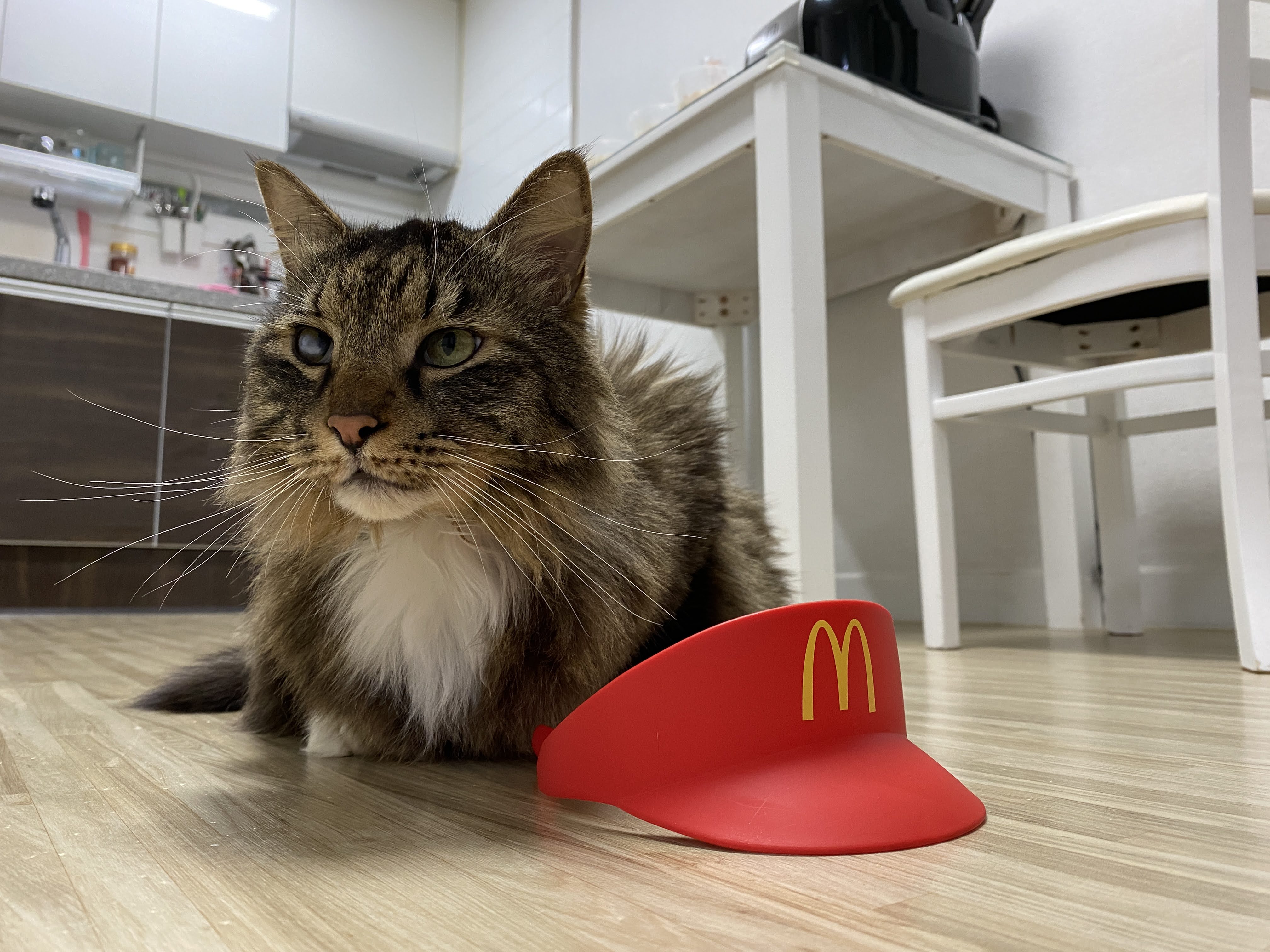 실은 맥도날드 모자다. 모자 쓰기 싫어서 얼굴 짜부라진 고양이.