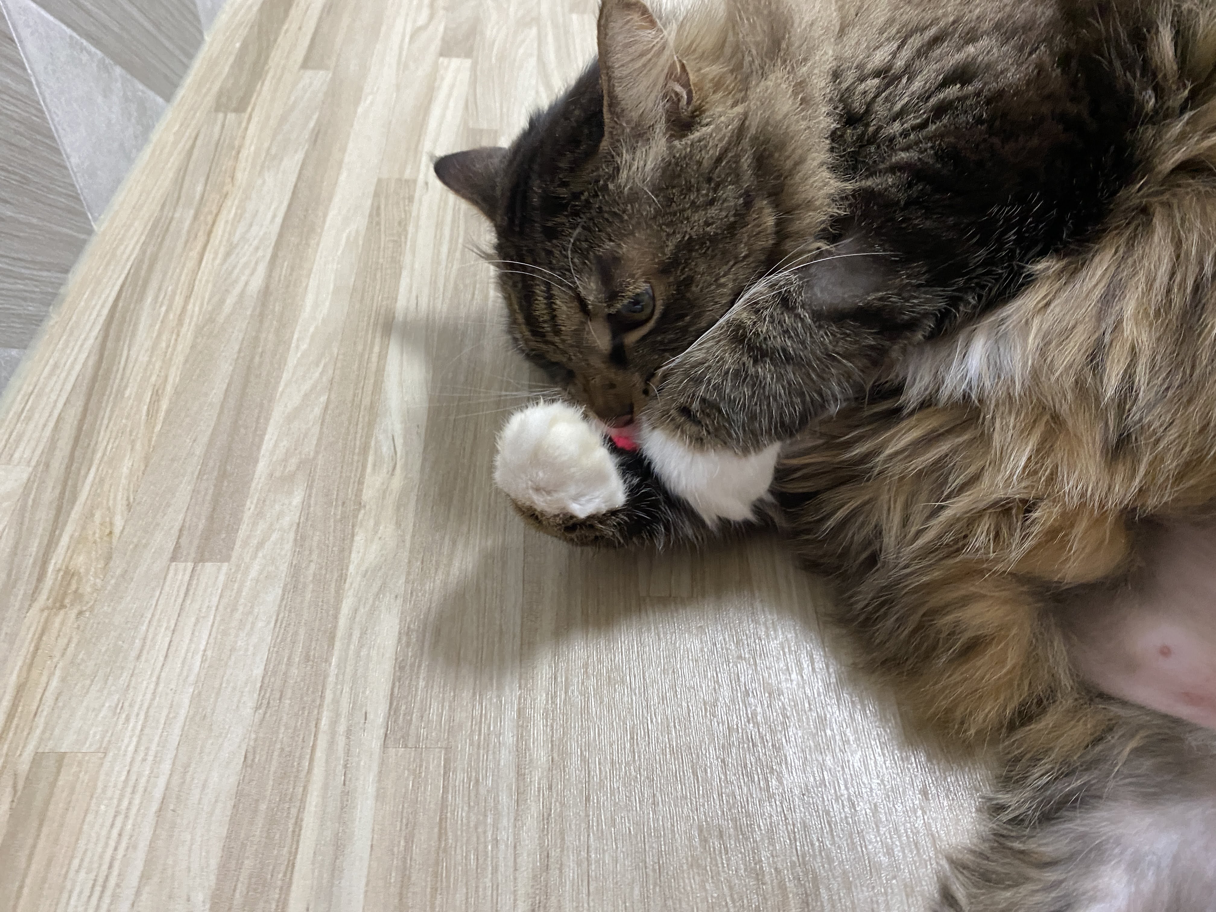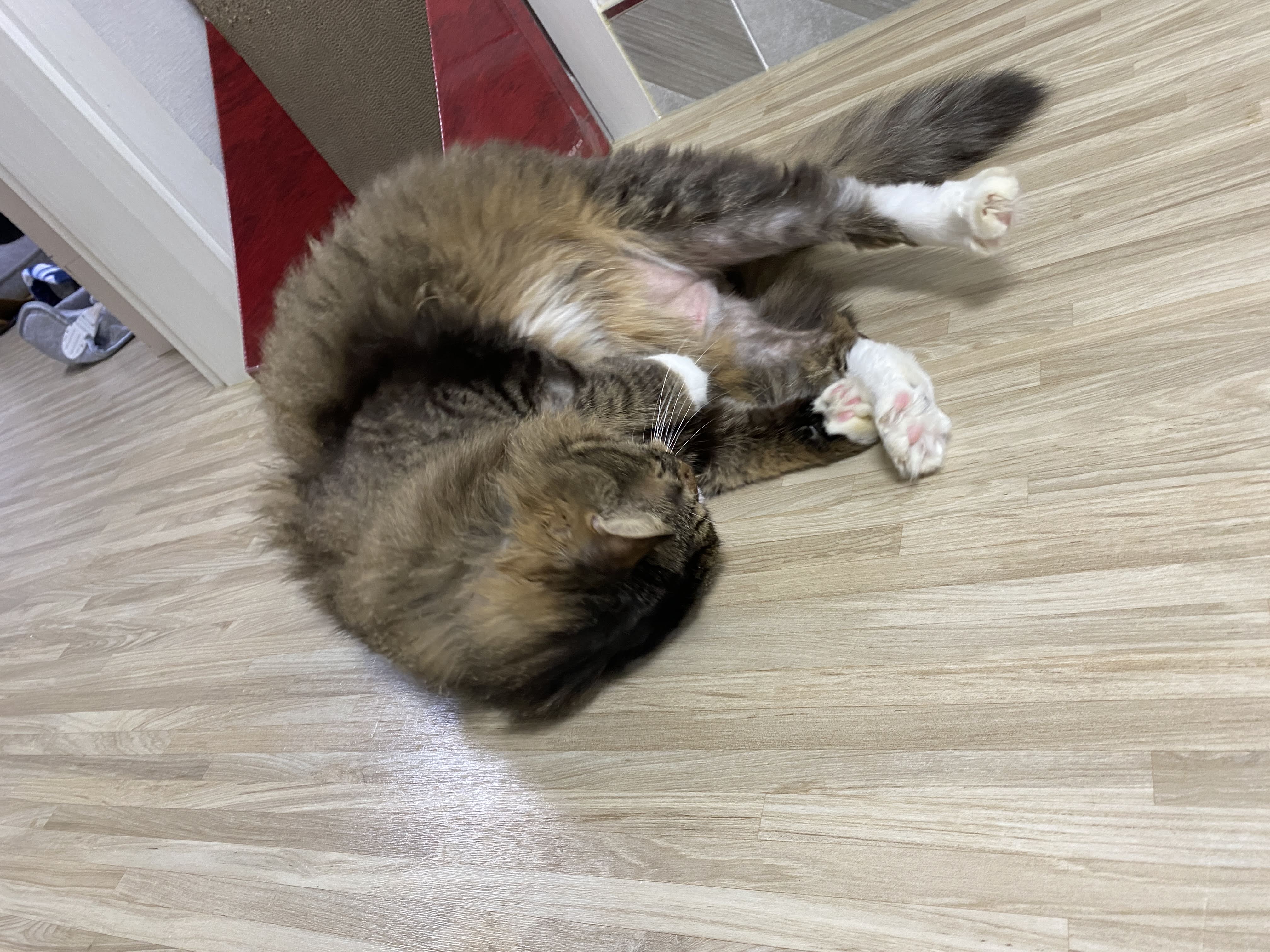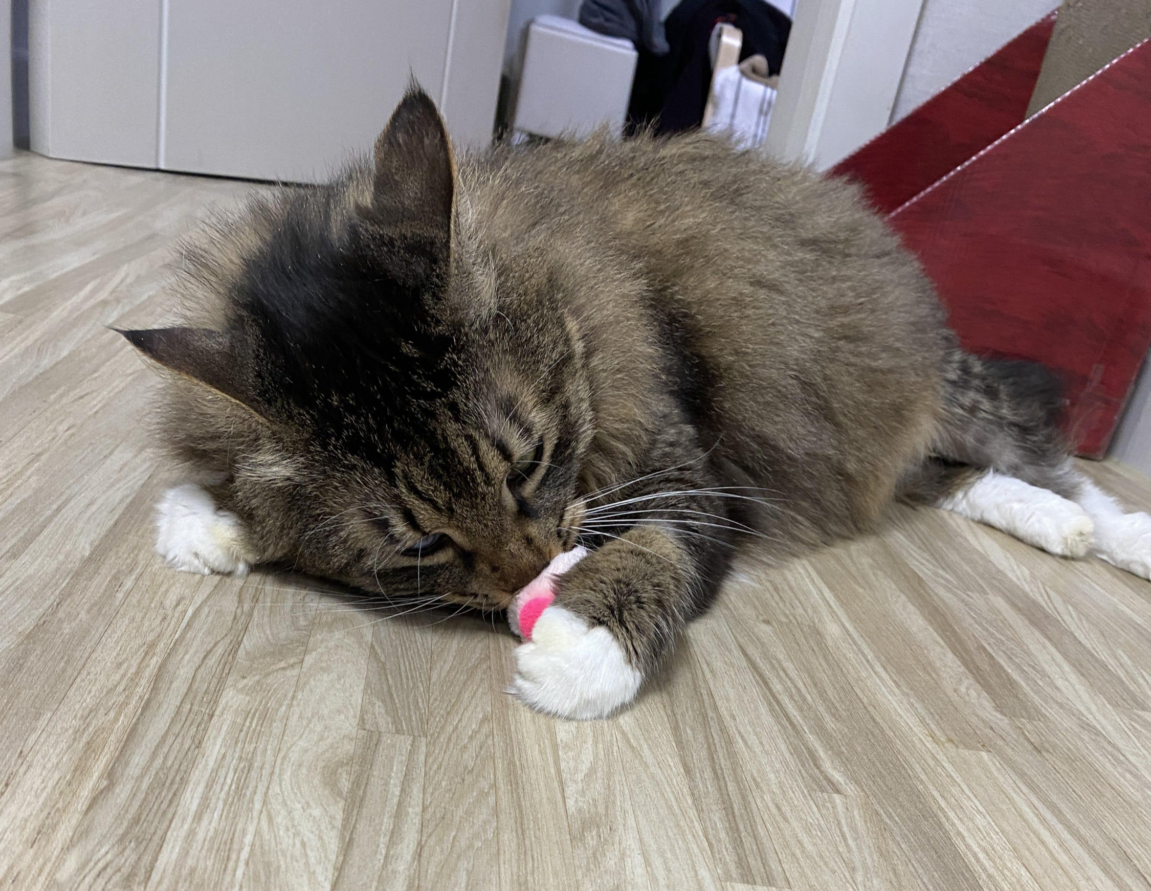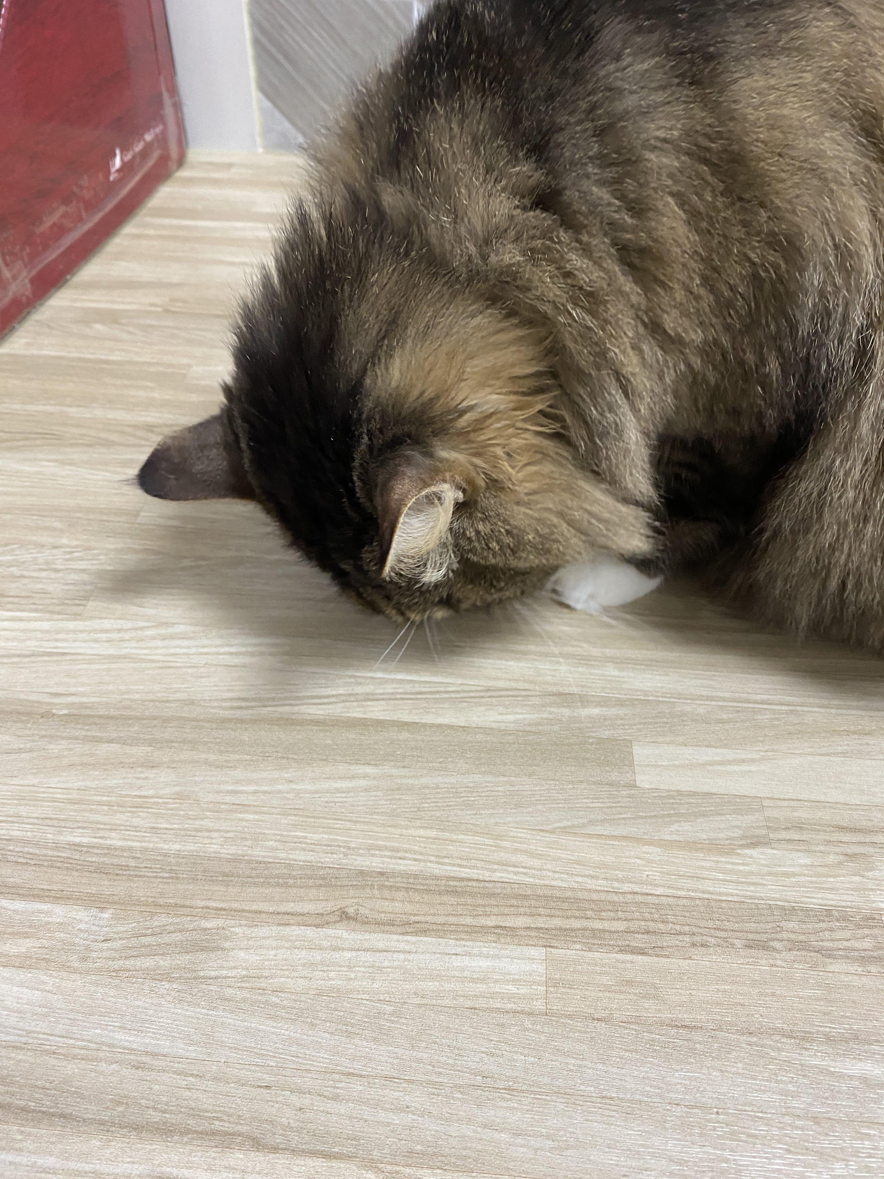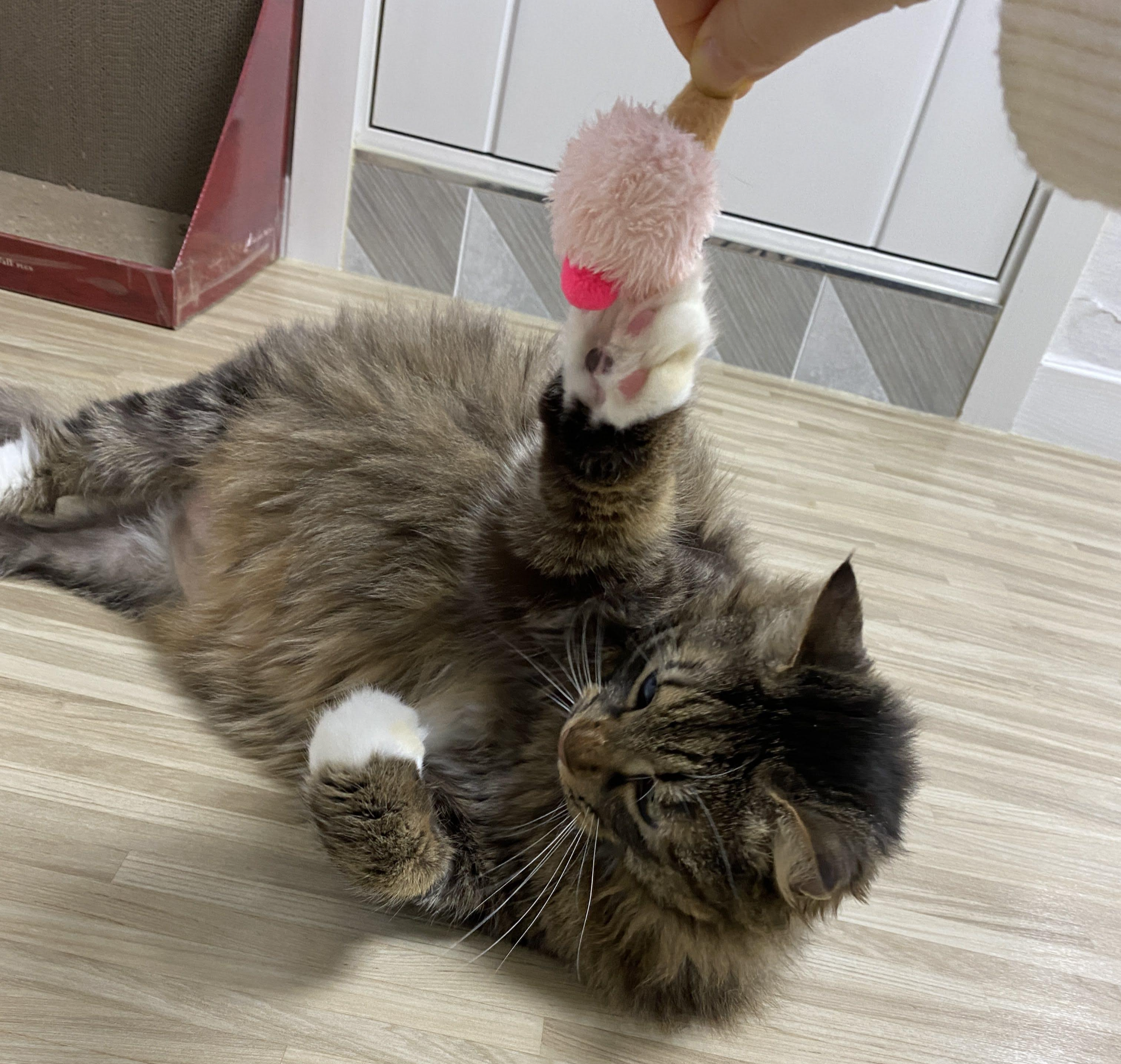 바닥에 장난감이 놓이는 순간, 고양이의 신나는 뒹굴뒹굴이 시작된다.