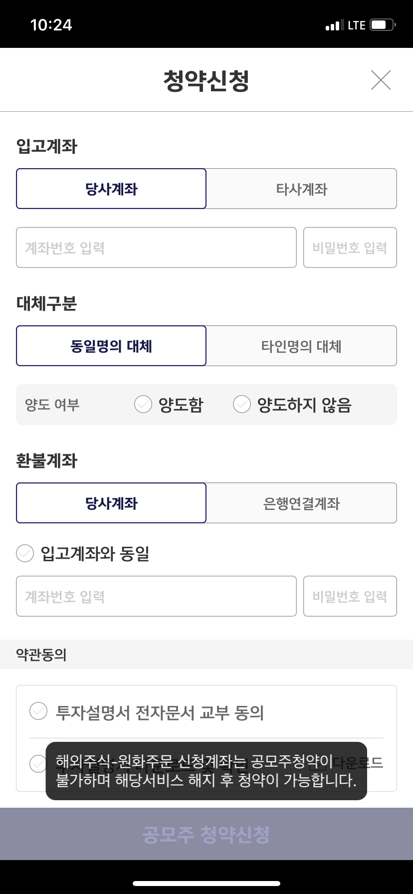 "해외주식-원화주문서비스 신청계좌는 공모주 청약이 불가하며 해당서비스 해지 후 청약이 가능합니다."