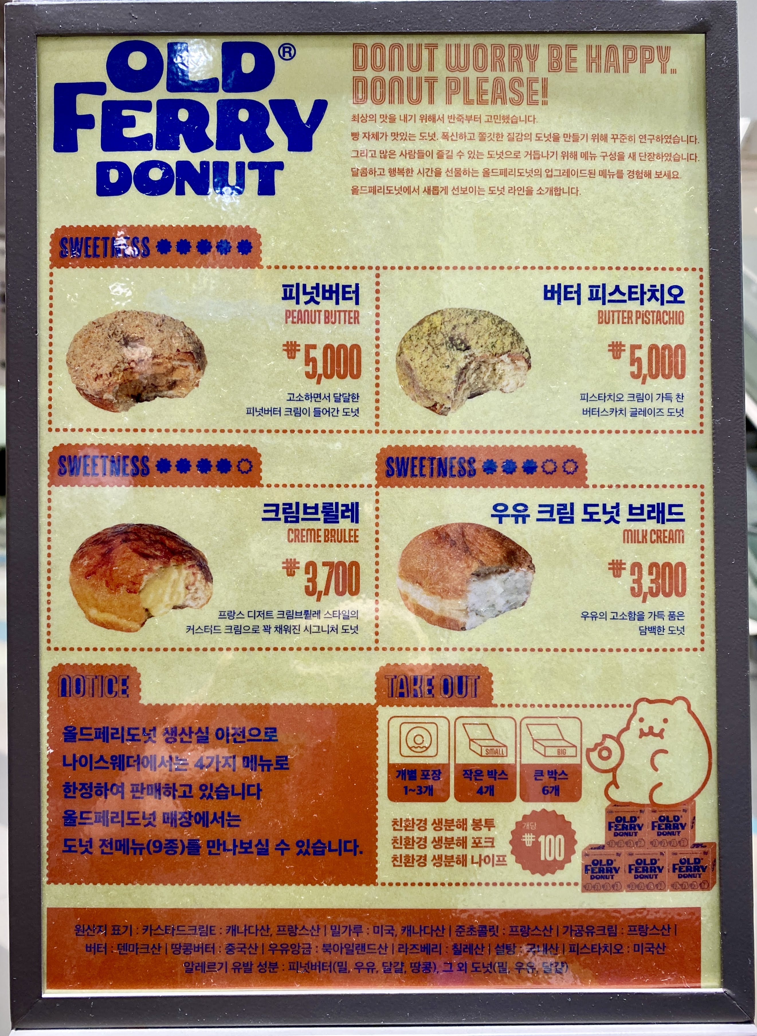 왼쪽 상단의 주황색 봉투에 담긴 게 우유크림, 그 옆은 땅콩버터, 그 아래는 크렘브륄레, 왼쪽 아래는 피스타치오 버터 도넛이다.