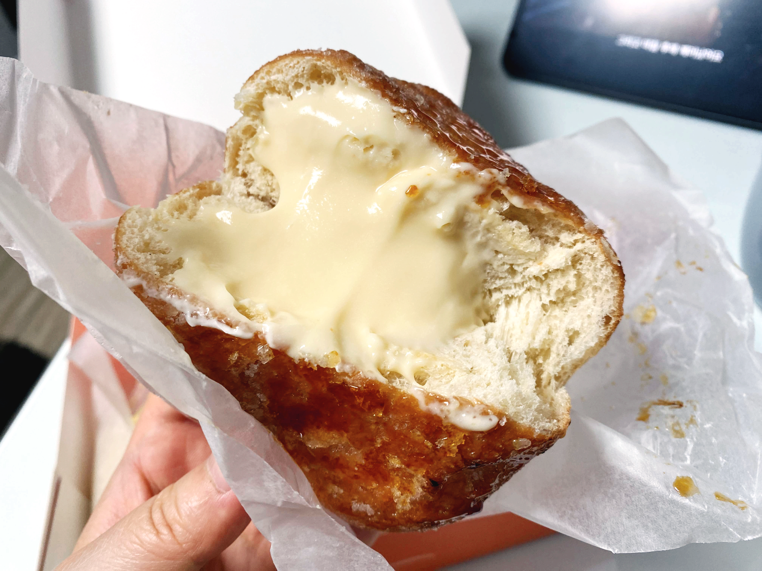 안에는 커스터드 크림이 꽉 차 있는데, 크렘브륄레를 어떻게 도넛 맛으로 구현한다는 건지 궁금했는데 이렇게 해내는구나.
