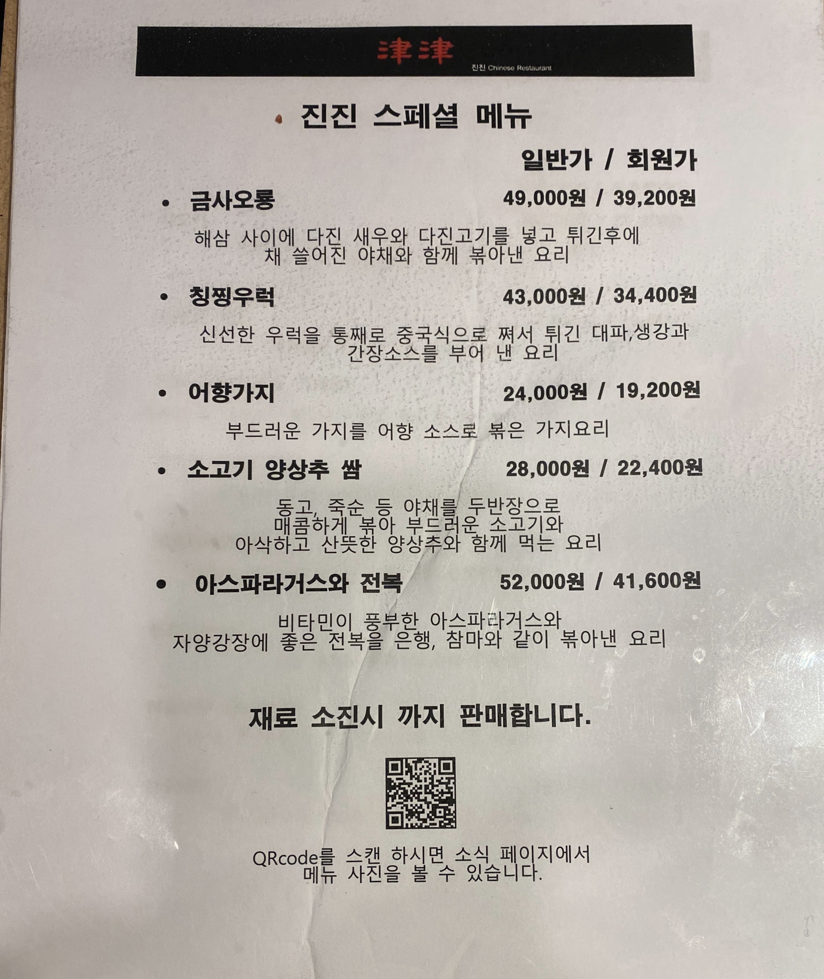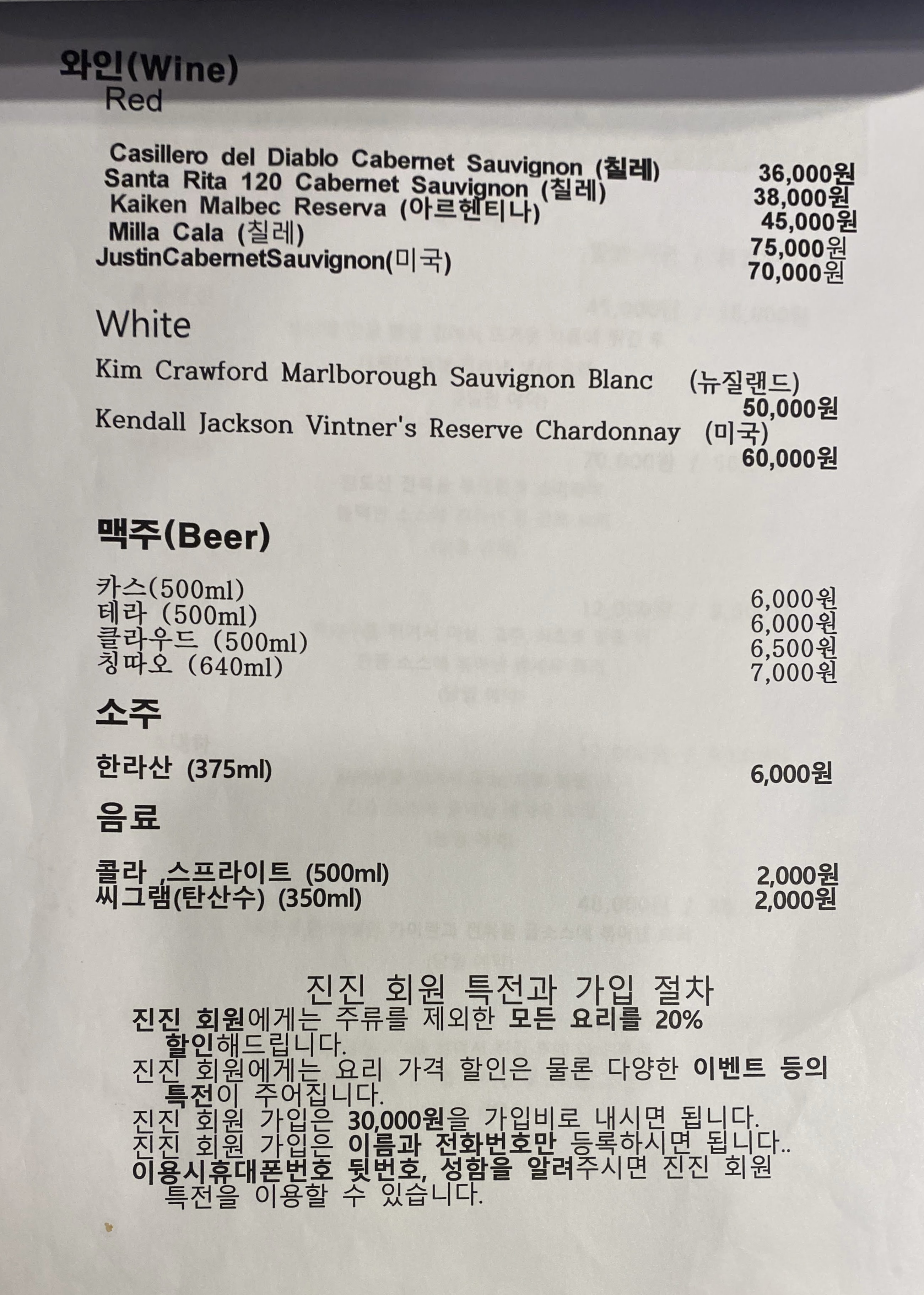 진진 회원에게는 주류를 제외한 모든 요리를 20% 할인해 드립니다.