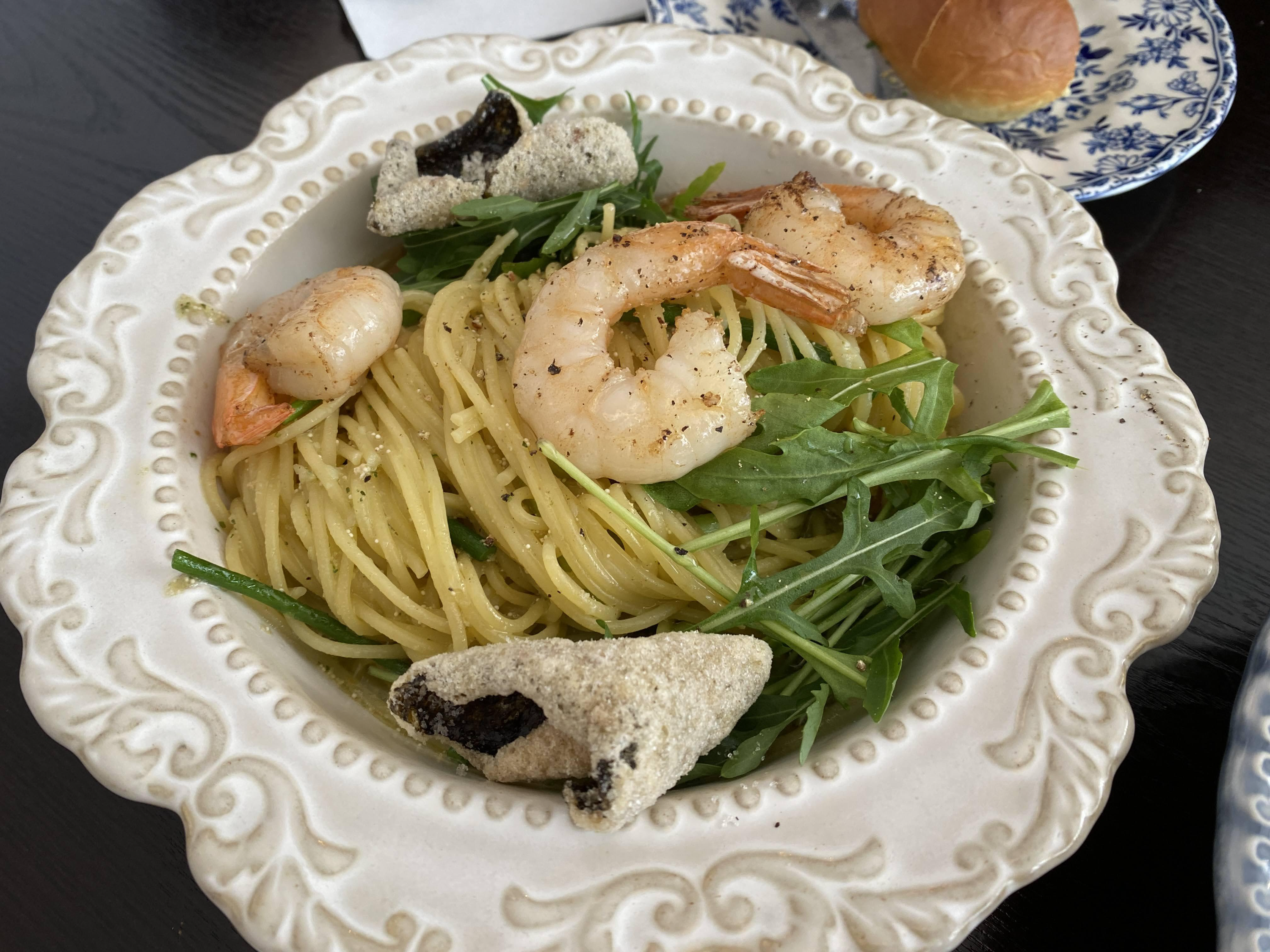 명란바질파스타 등장. 통통하고 큼직한 새우, 김부각, 신선한 루꼴라까지 냠냠.