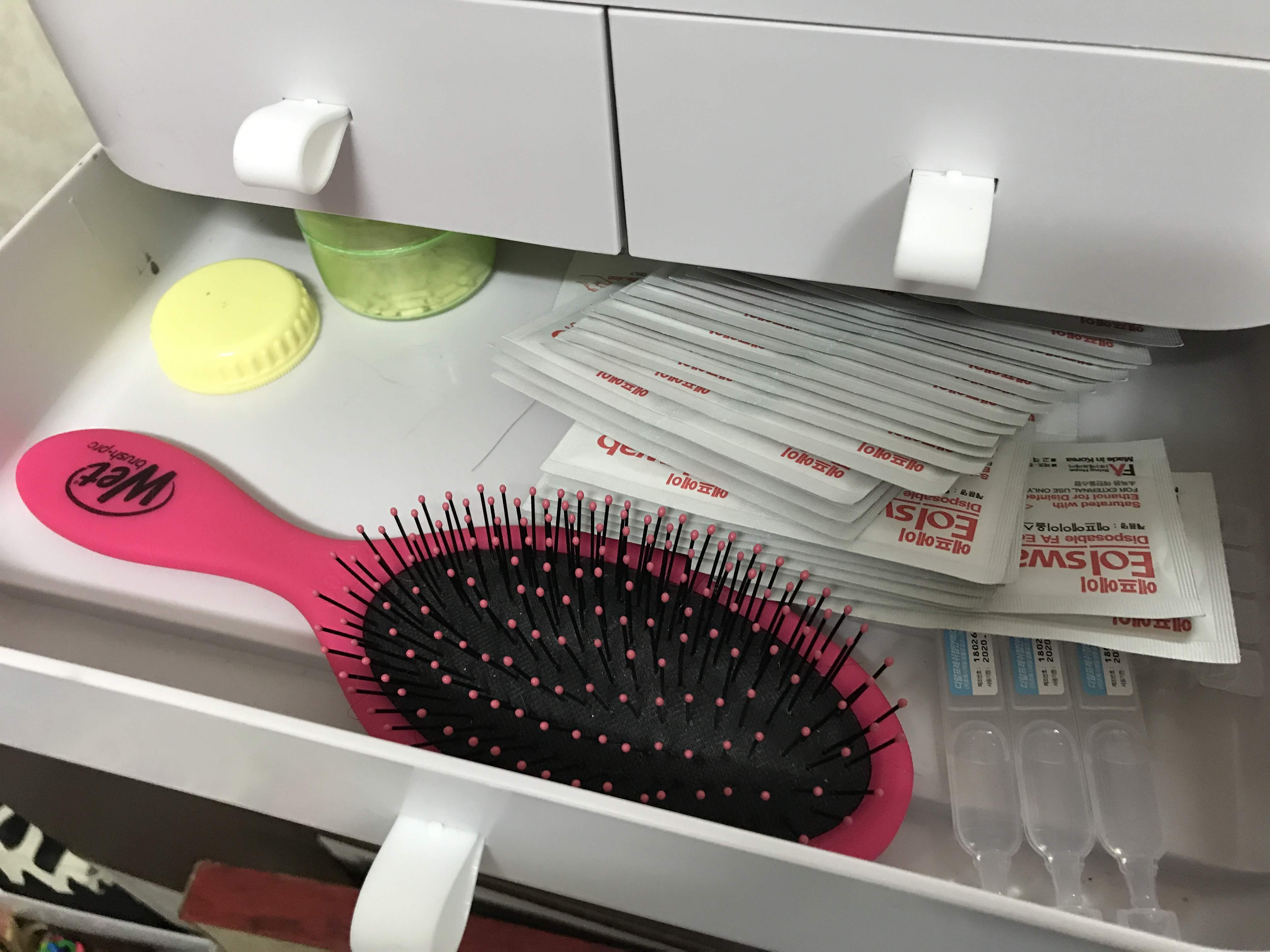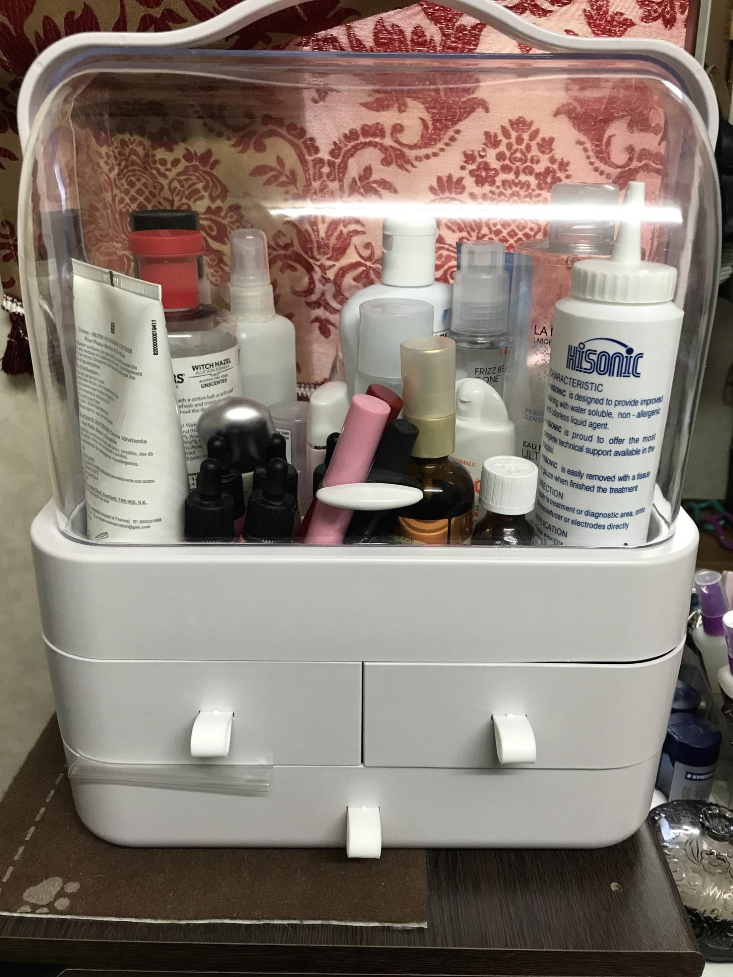 서랍이 3개 밖에 안 되어서 수납 모자랄까 봐 걱정했는데 괜한 걱정이었다. 뚜껑 높이가 높아서 클렌징워터 같은 길쭉한 제품들도 넣을 수 있어서 대만족이다.