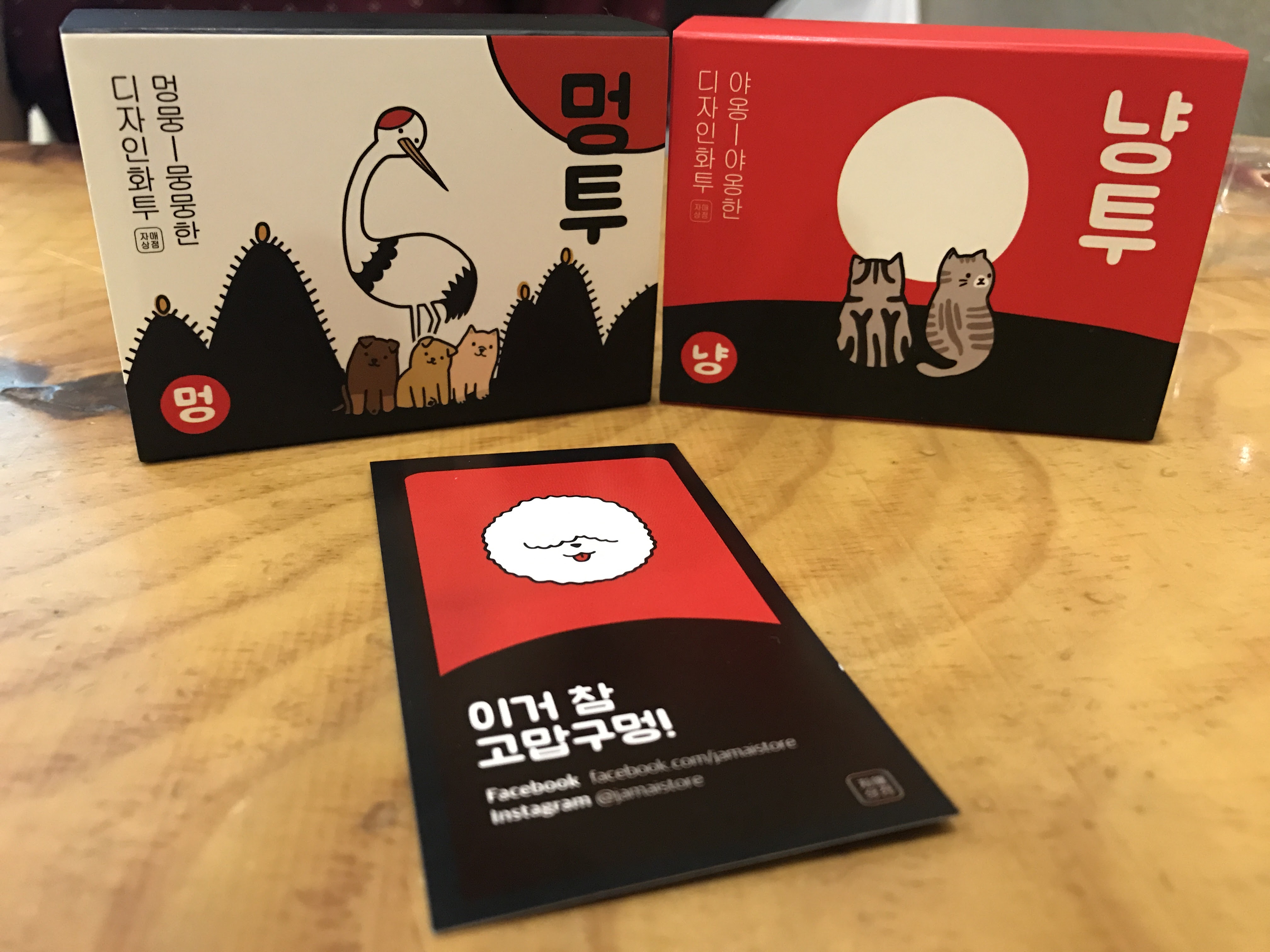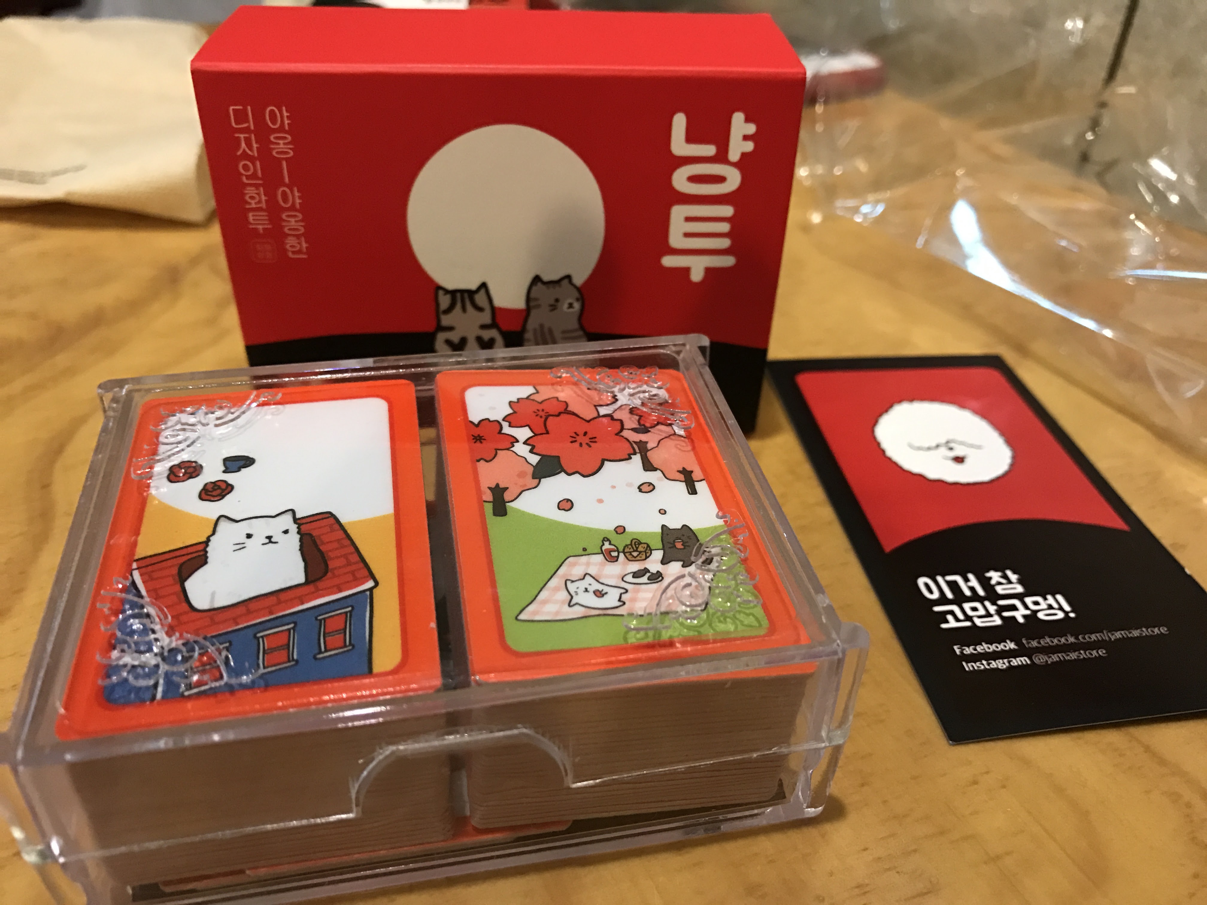 화투인데 멍멍이랑 야옹이가 그려진 화투다. 친구는 멍투 주고 냥투는 내가 가지려고 샀다. 친구는 멍멍이 키우고 나는 야옹이 키우니까.
